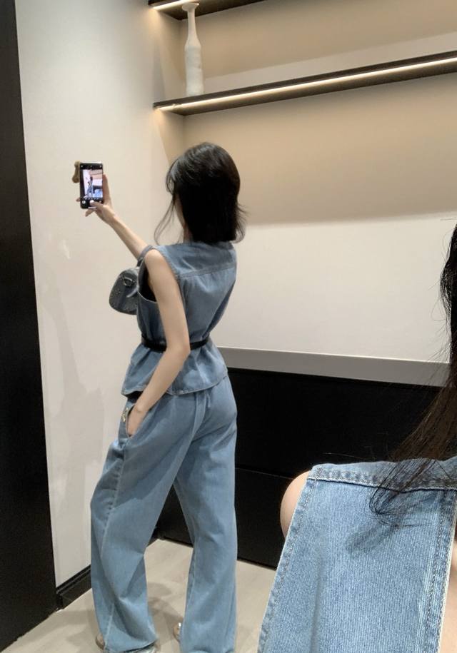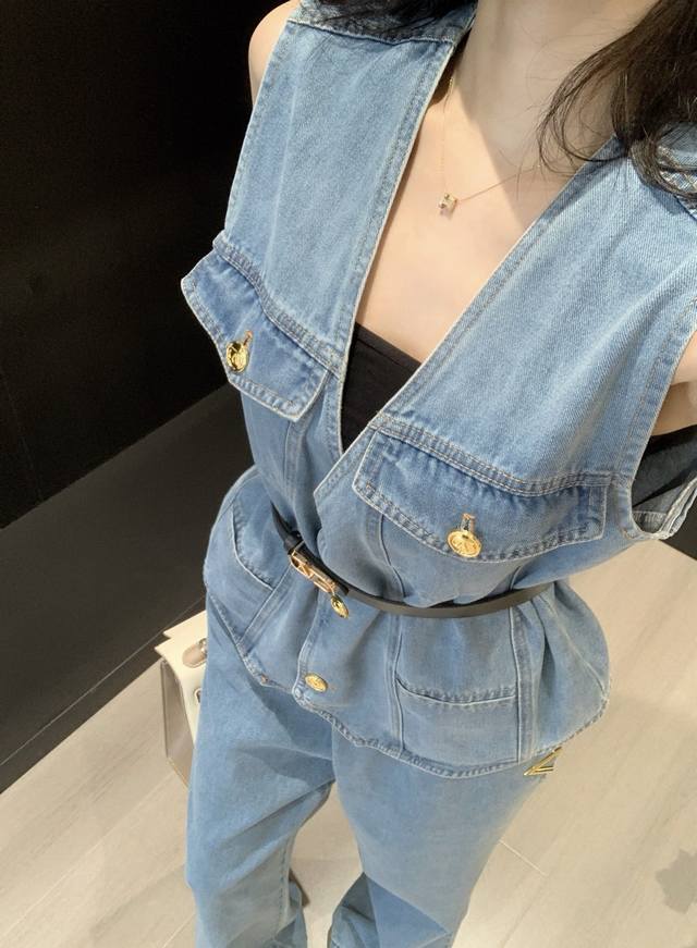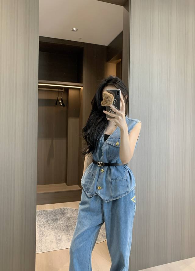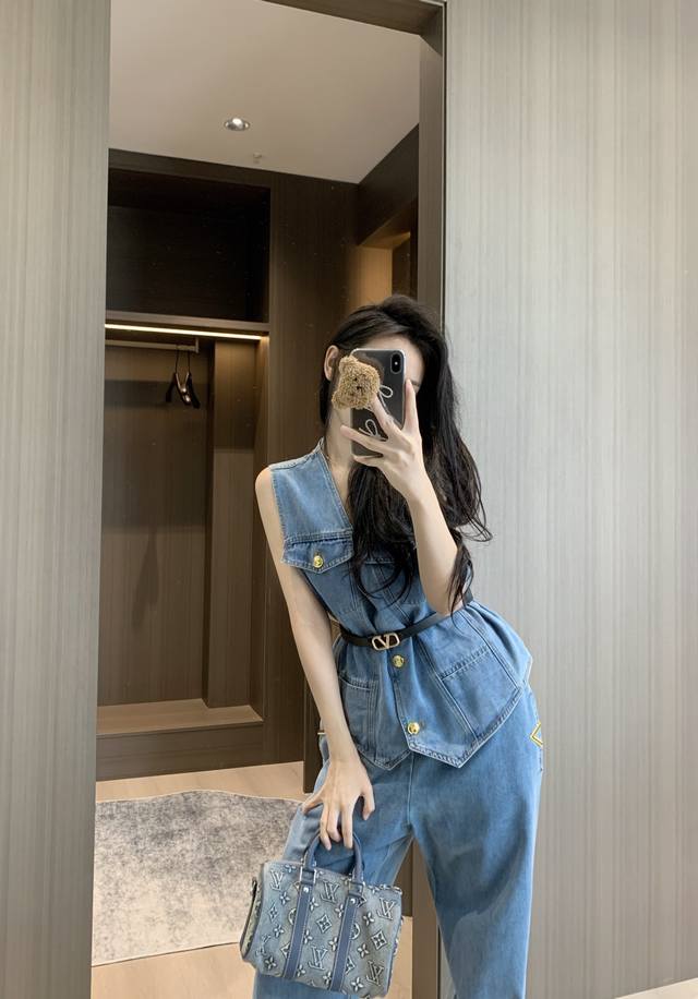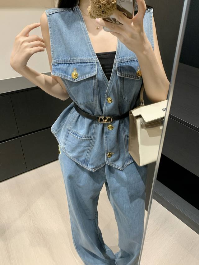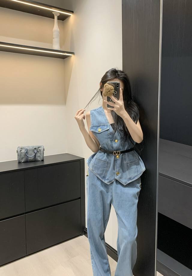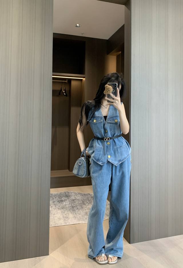 V-Neck Denim Vest Straight Jeans Suit