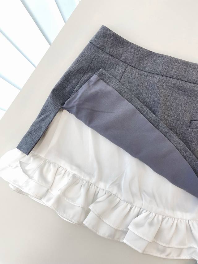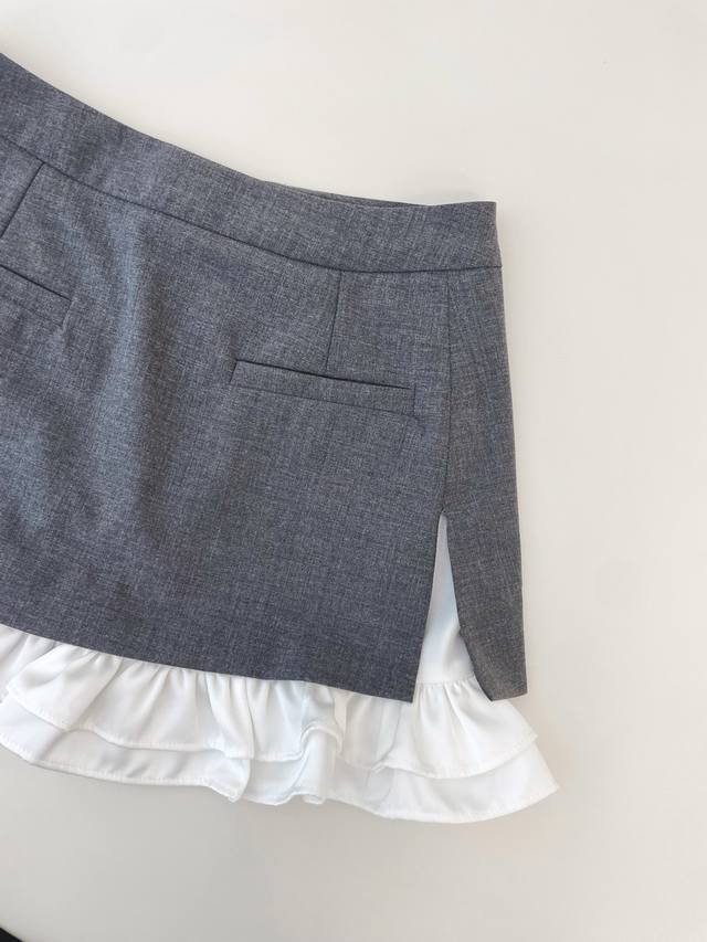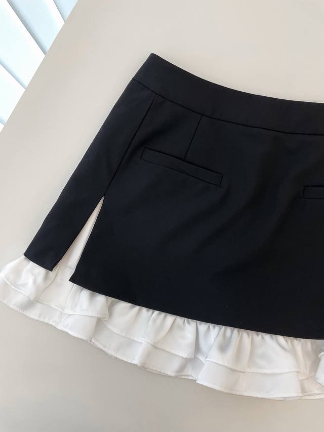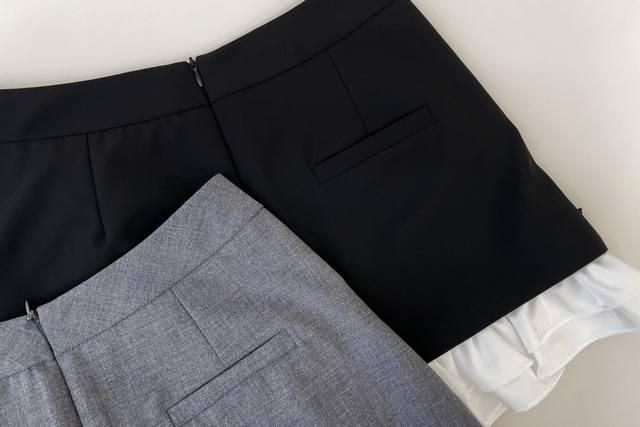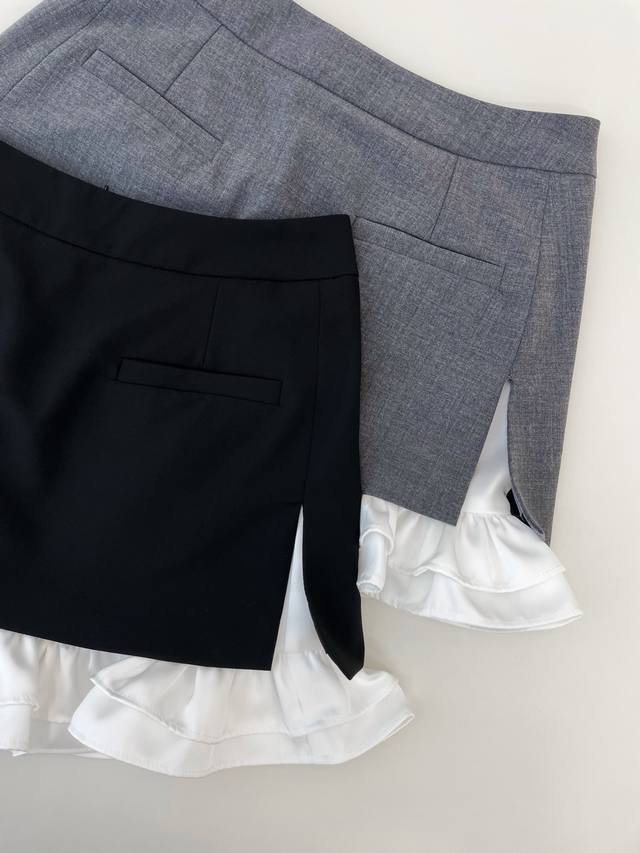 25 New Style Spliced Fake Two-Piece Skirt Combines Fashion And Design Sense. The Upper Part Is Made Of Suit Fabric, Which Is Crisp And Stylish, Showing A Capable Style. The Pocket Design Adds Practicality And Detail. The Side Slits Break The Convention And Add Agility. The White Ruffles On The Lower Part Are Light And Soft, Forming A Contrast In Material And Style With The Upper Part, Softening The Overall Shape. It Is Suitable For Matching With Simple Tops To Create An Elegant And Playful Dressing Effect. 2 Colors Sml