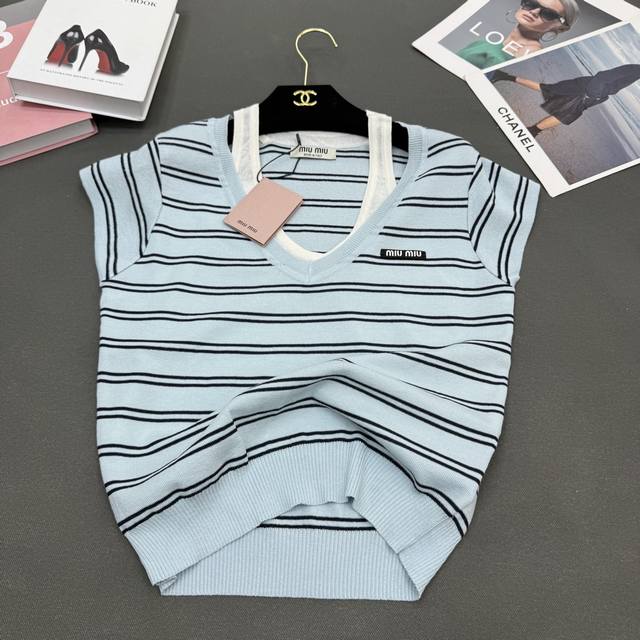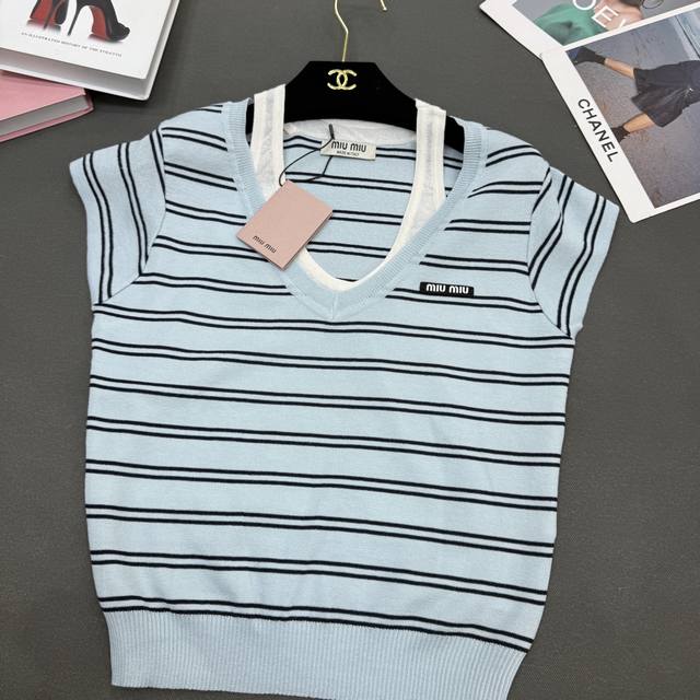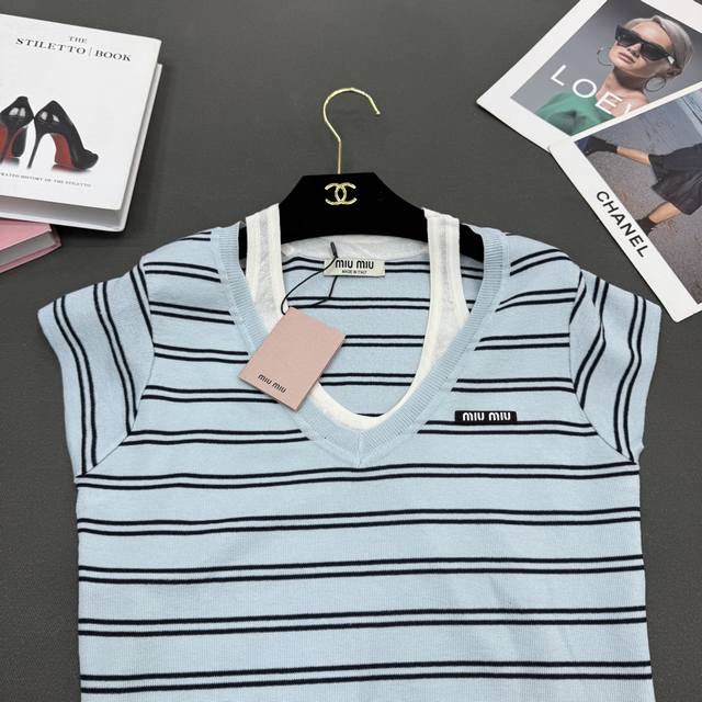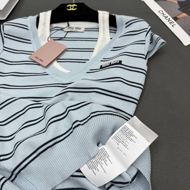 25 Summer Miumi* Women's New Skin-Friendly Silk Linen Striped Deep V-Neck Fak
