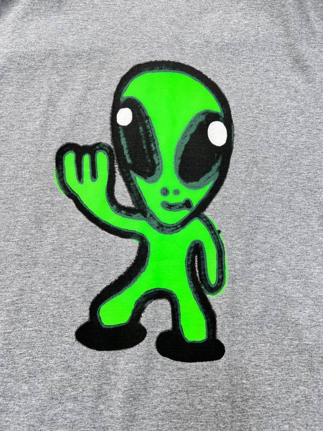 T-Shirt With A Green Alien Printed On The Front. The Alien Pattern Is So Cute, As If It Is Greeting You Playfully. It Is Cute And Eye-Catching. Who Wouldn