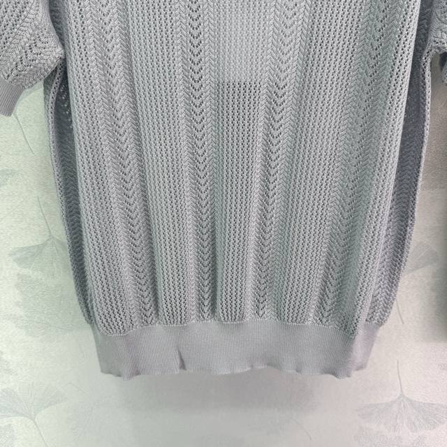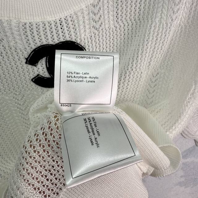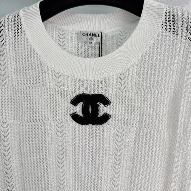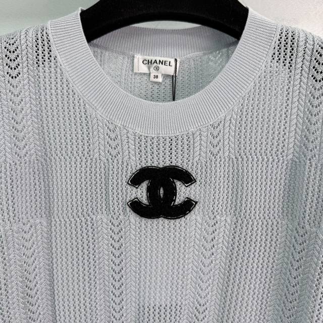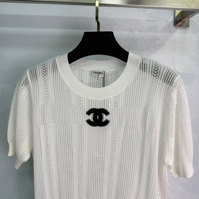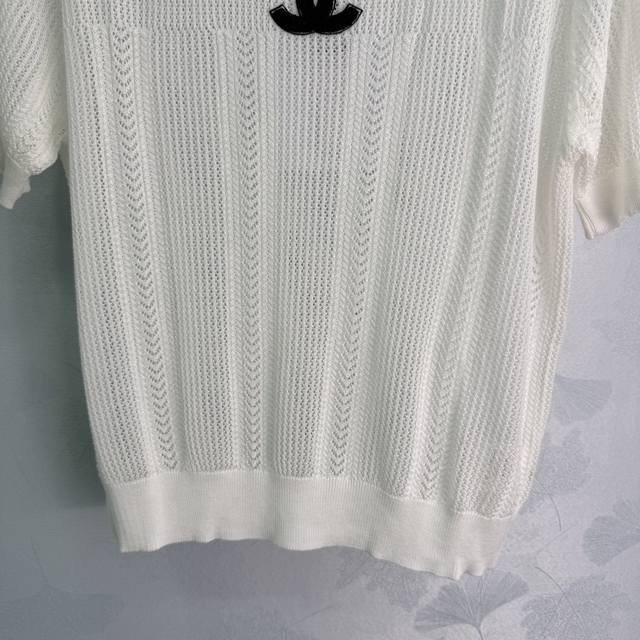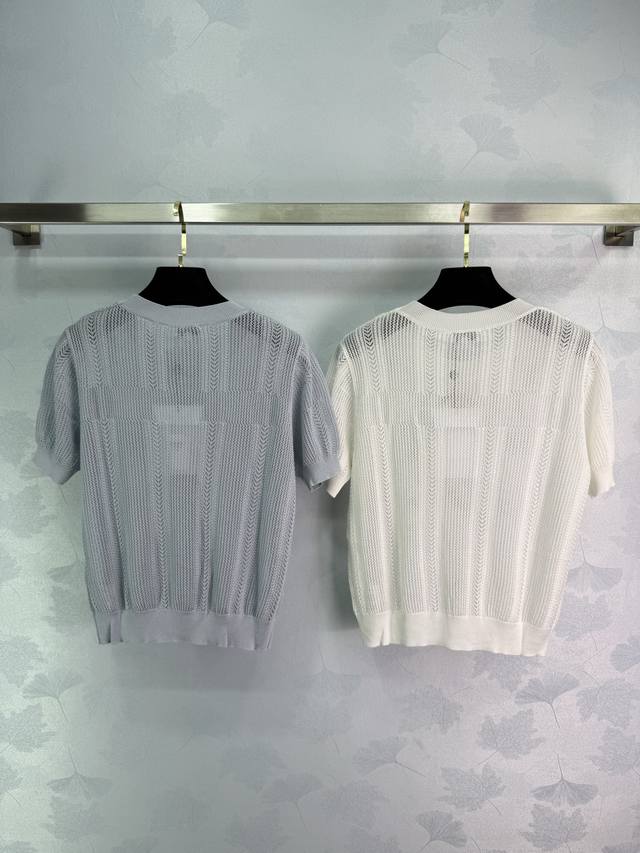 chane* Summer New Hollow Knit Short-Sleeved Top With Classic Double C Logo, Two Colors Available, White And Gray, Suitable For Summer Matching, Pullover Design, Comfortable And Breathable Fabric, 2 Colors And 3 Sizes, Sml T226B