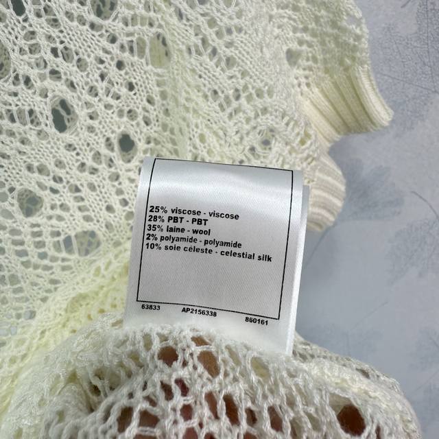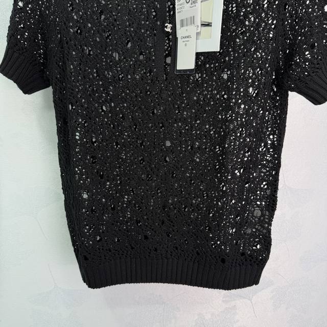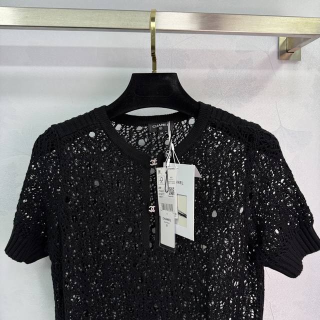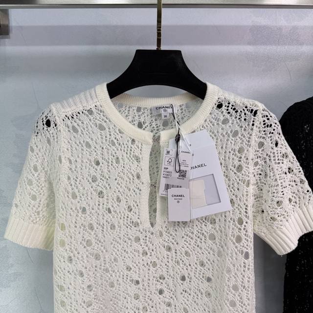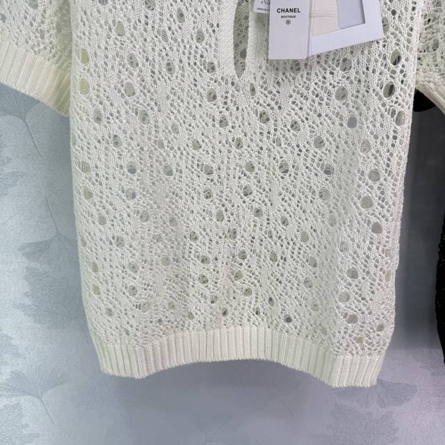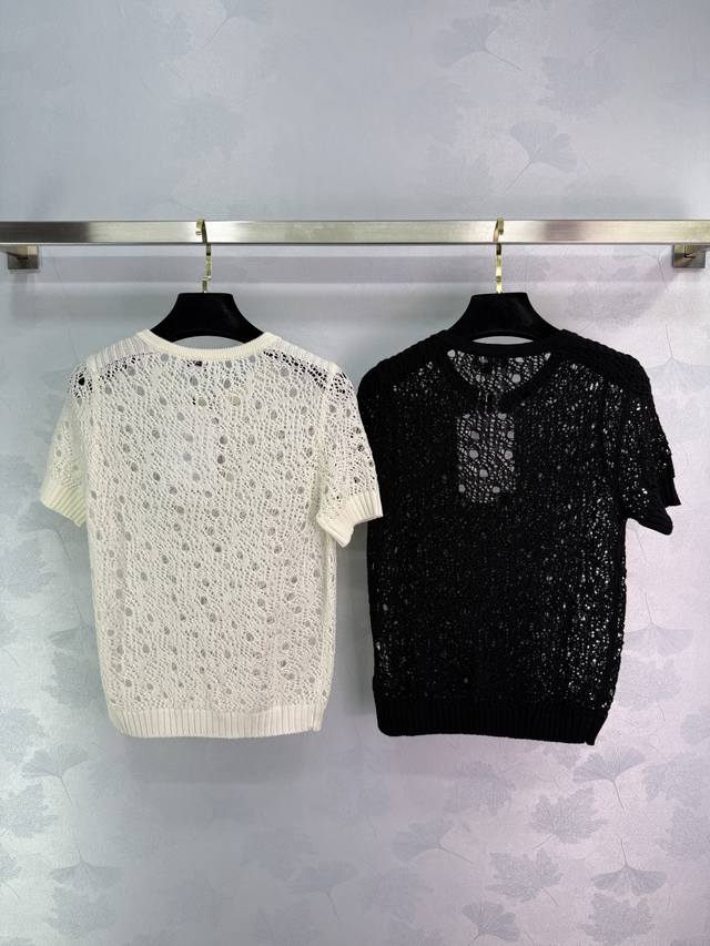chane*2025 New Arrival Hollow Micro-Transparent Knitted Short Sleeves Customized Yb Cashmere Yarn Weaving Texture High-Grade Elasticity Comfortable Knitted Short-Sleeved Tops Tailored With Delicate Crochet Texture Interweaving To Outline The Hole-Shaped Hollow Pattern Exquisite Double C Brooch Link Hollow Neckline Highlights The High-End Sense Of Wear Neckline, Cuffs And Hem Use Threaded Lace Micro-Transparent To Make You Look Slimmer 2 Colors 3 Sizes Sml