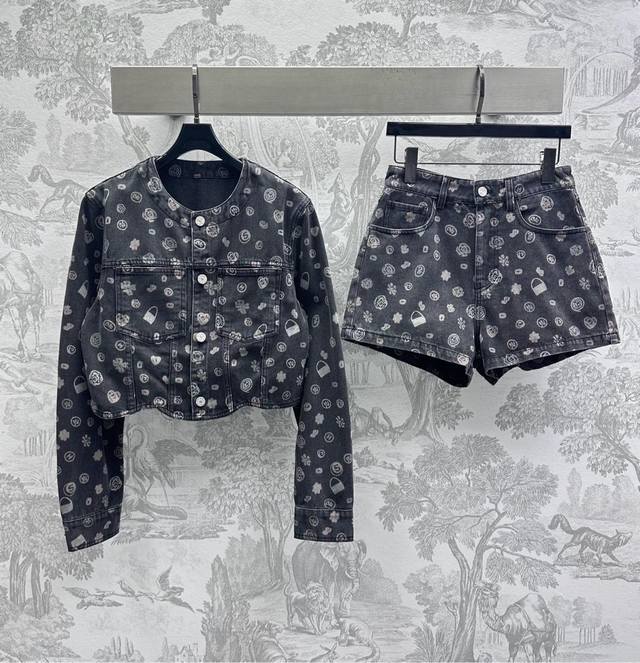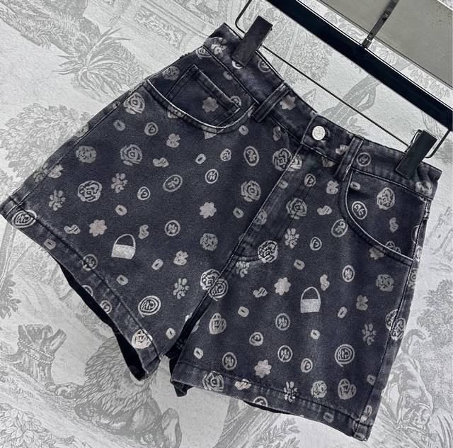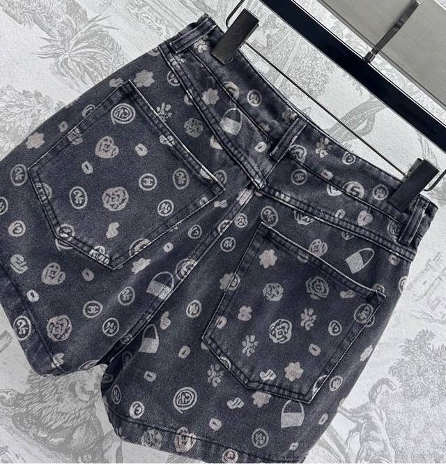 chane*2025 New Arrival Laser Denim Shorts Customized Yb Imported Twill Cotton Denim Material Crisp And Comfortable High Waist Buttoned Symmetrical Pockets With Contour Cutting Design To Add Layering To The Shape The Whole Body Is Laser Printed With Camellia Digital Element Pattern Double C Letter Logo Embellishment Highlights The Brand Tone Surface And Auxiliary Material Development High Waist Wide Leg Shorts Tailoring Can Be Matched With The Same Series Of Jackets And Coats To Complete The Outfit. Colorful And Fashionable