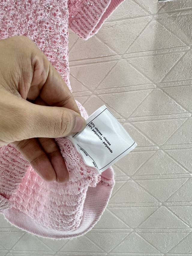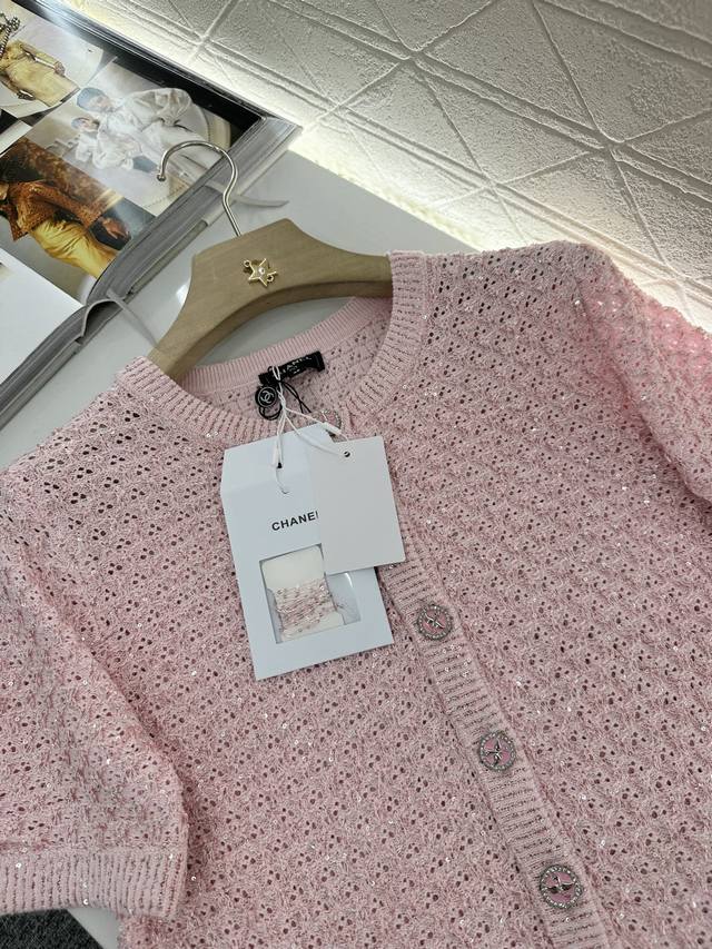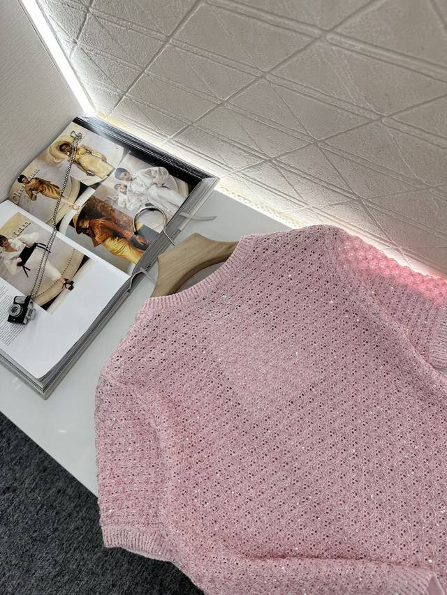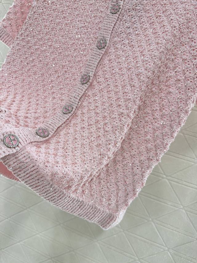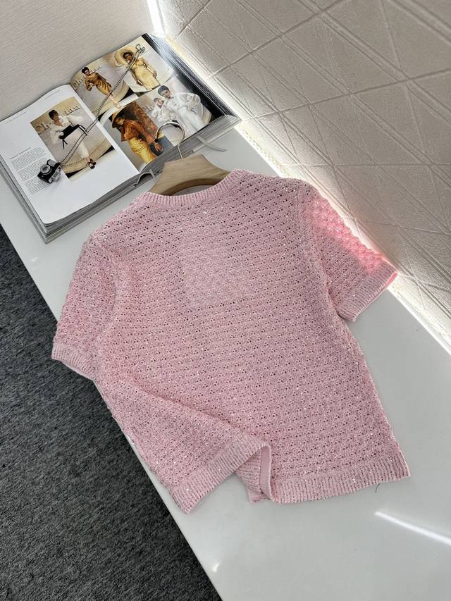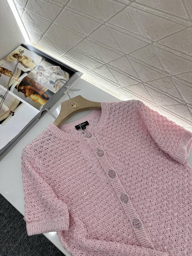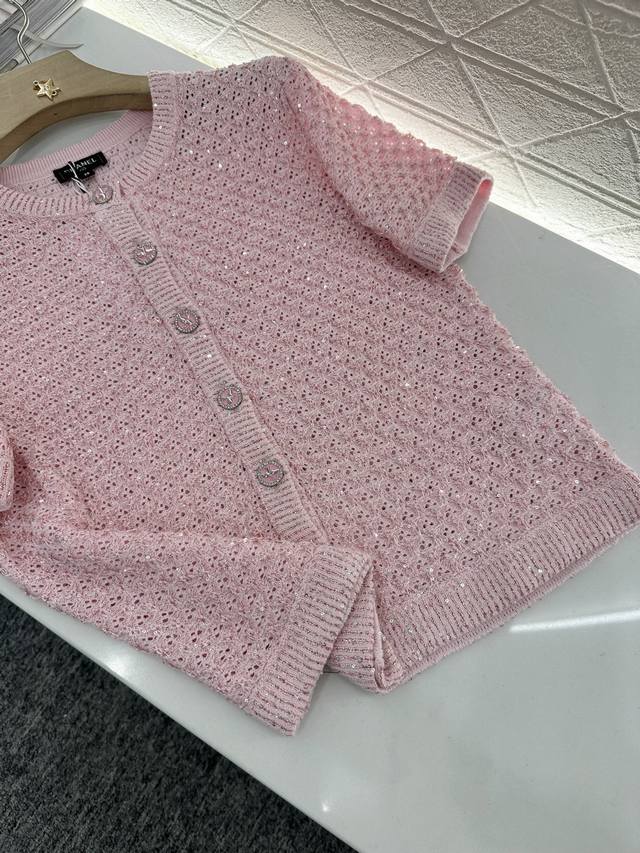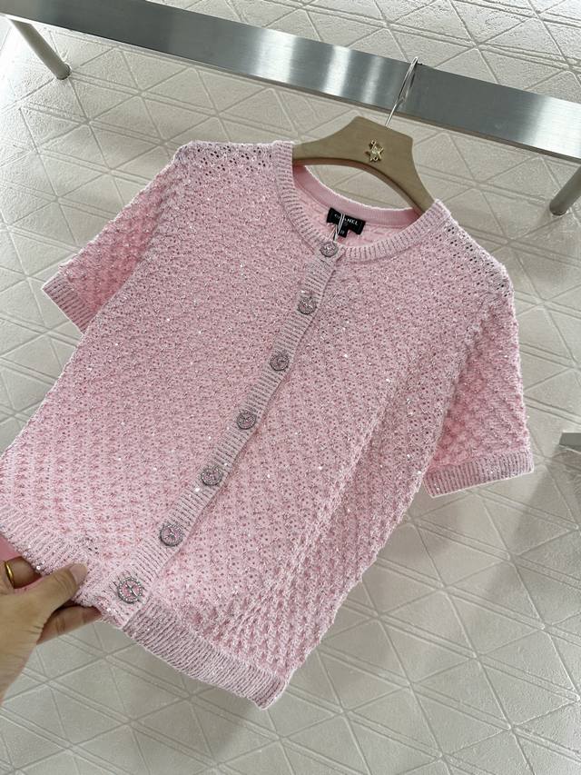 Customized Yb Imported Yarn Woven With High-Quality Texture And Comfort Round Neck Knitted Short-Sleeved Cardigan With Elegant Cut Available In Four Colors: Black, Pink, Blue And White Fabric Interspersed With Silver Thread Full Of Fine Glittering Sequins Delicate And Charming Front Placket Signature Engraved Metal Round Buckle Highlights The High-End Sense Of Wear Waffle Pattern Makes Simple Style Wear Out Personality Regular Version Shows Relaxed Tone Light Luxury And Fashionable Temperament Can Be Worn Alone Or Layered Fashionable Wear In All Seasons First Choice For Customized Surface And Accessories Look For The High Version 4 Colors 36 38 40