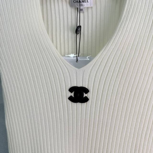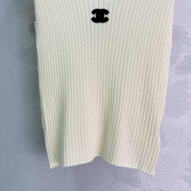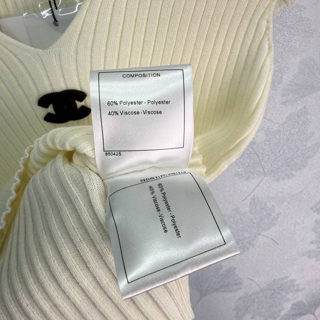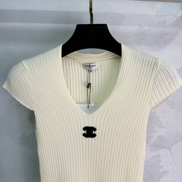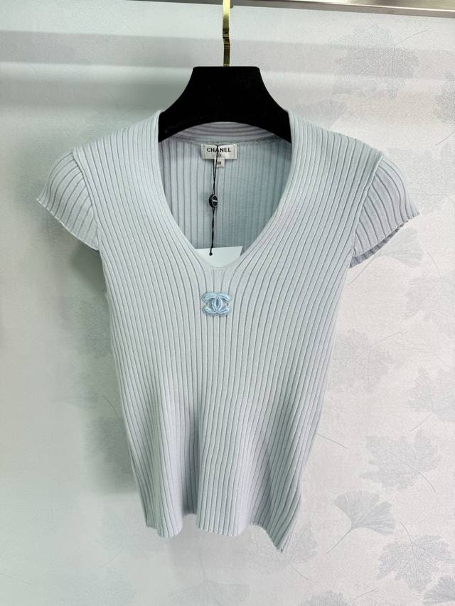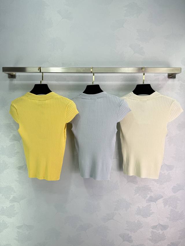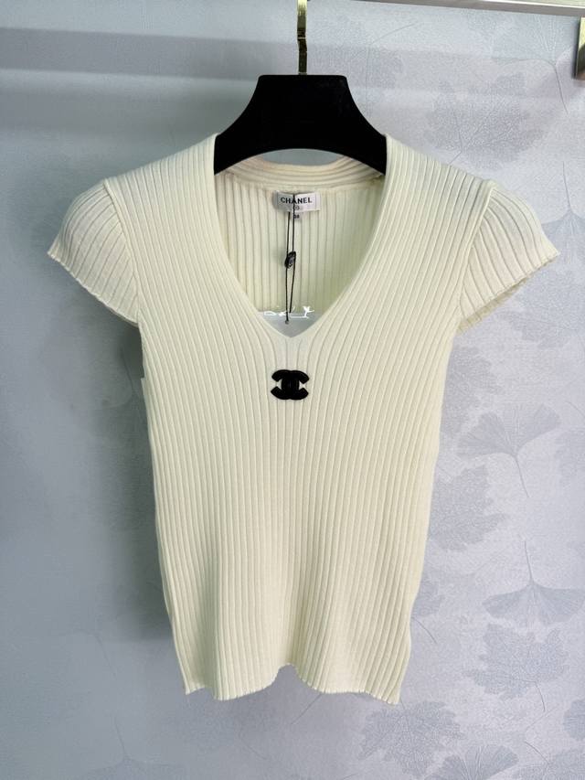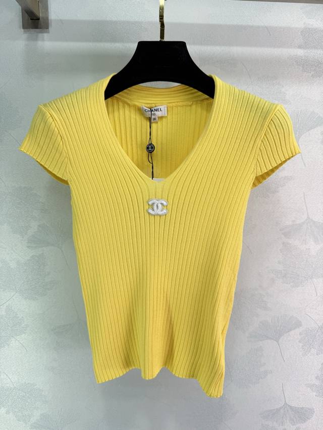 chane*Short-Sleeved V-Neck Knitted Top With Classic Double C Embroidery In Three Colors: Yellow, Light Blue, Beige, Good Elasticity, Slim Fit, Suitable For Summer Wear, 3 Colors, 3 Sizes, Sml T226B