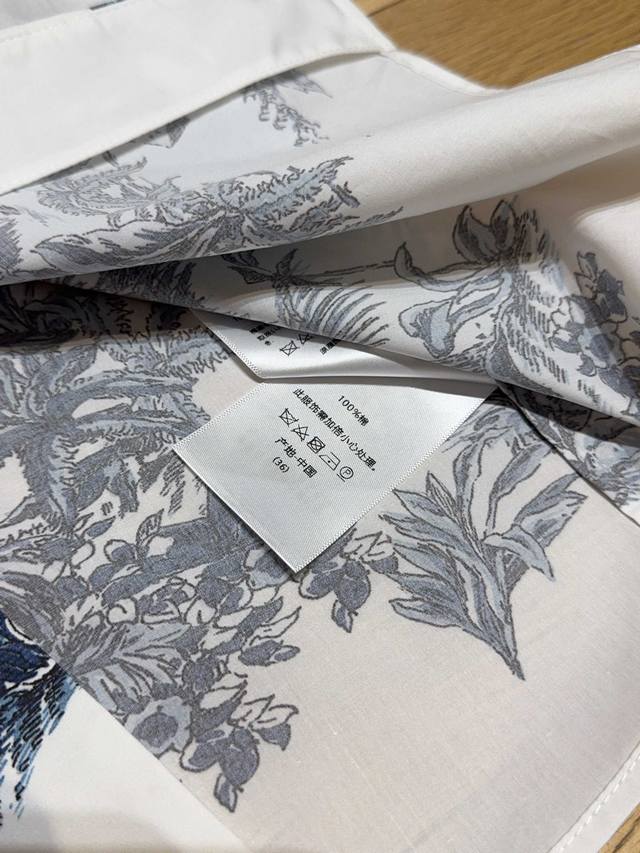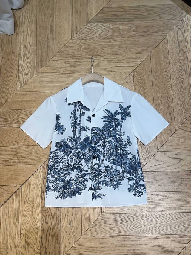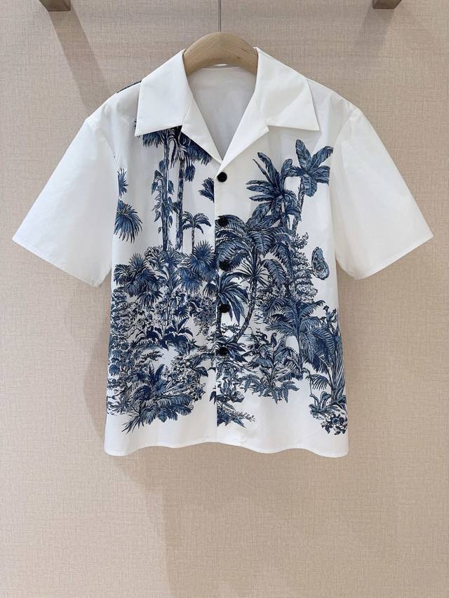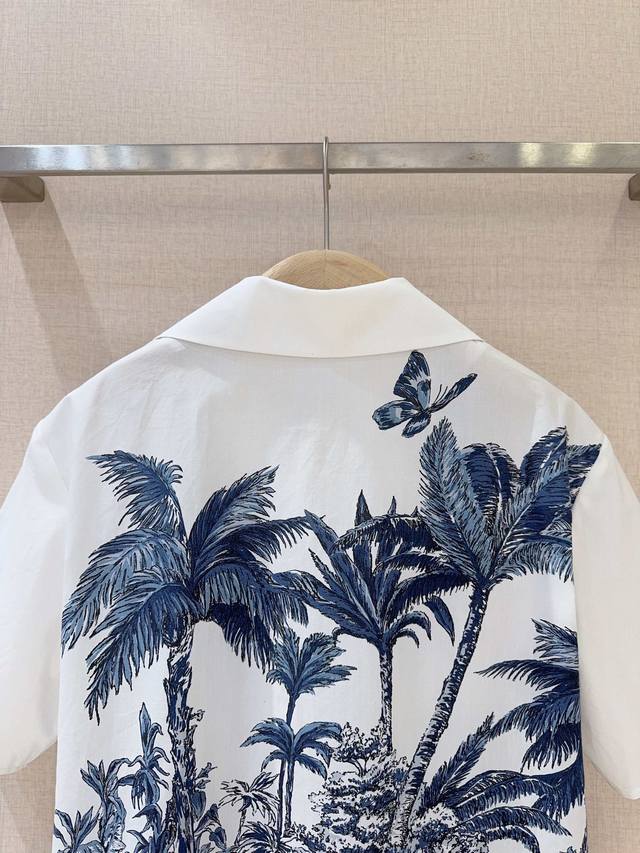 Short-Sleeved Coconut Jungle Print Shirt Cotton Texture Fashionable Small V-Neck Front Access Button Design Straight Shoulder Short Sleeves Can Modify Thin Back Arms White Background Blue Print Can Also Be Flexibly Matched With The Same Series Of Skirts Cotton Material Is Comfortable And Breathable Love It