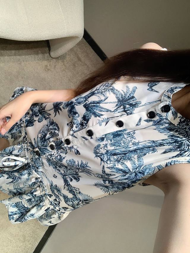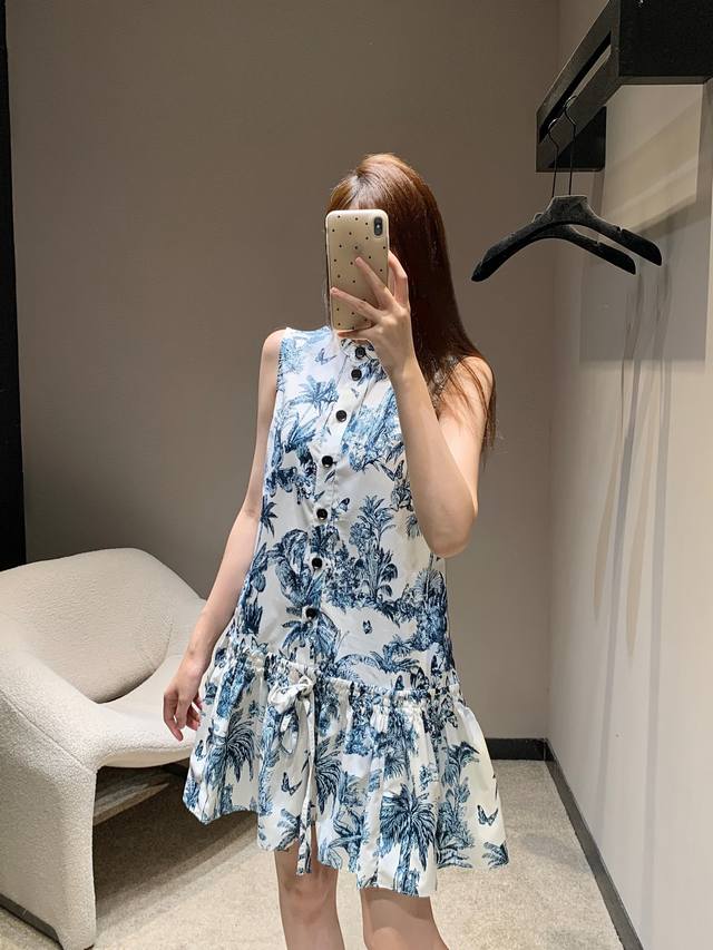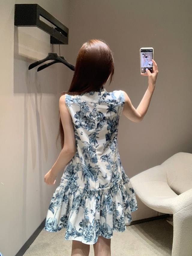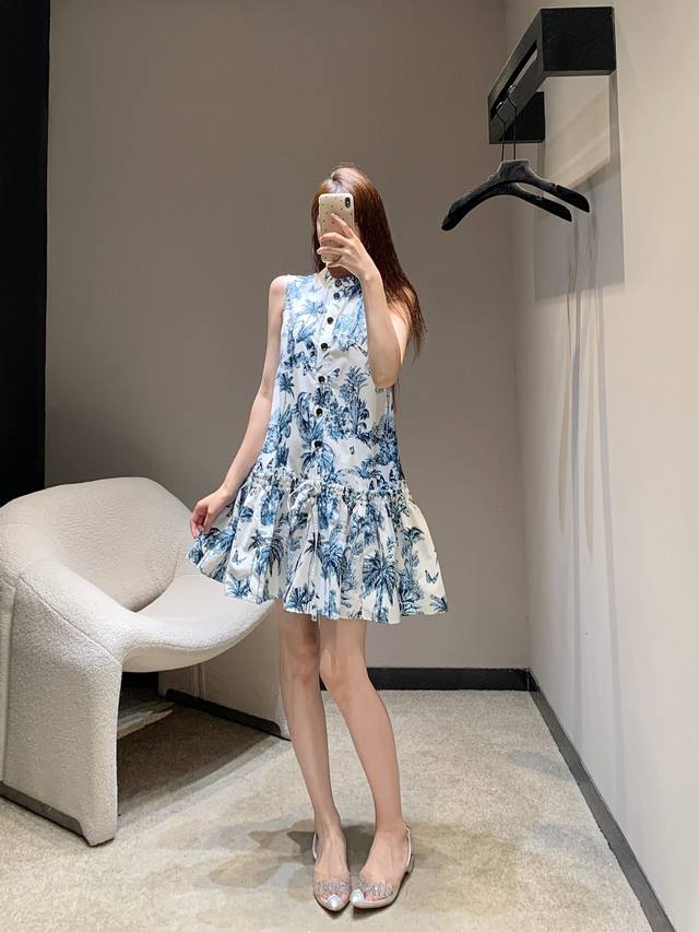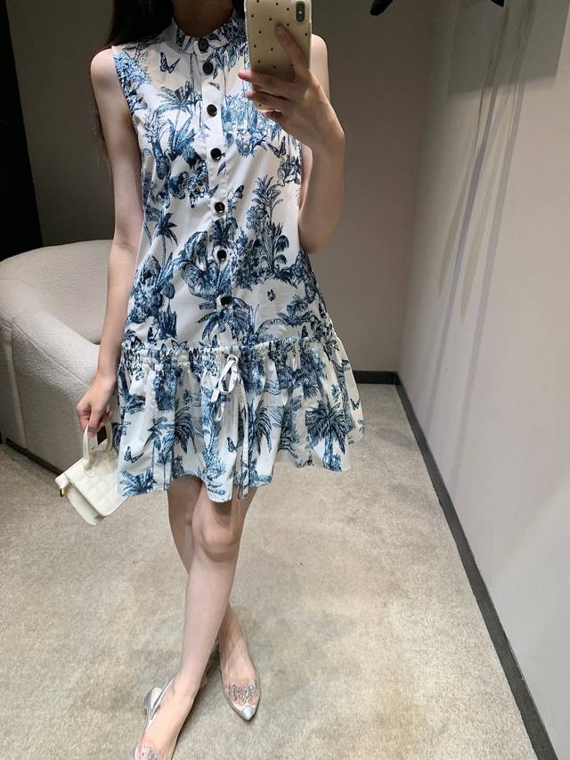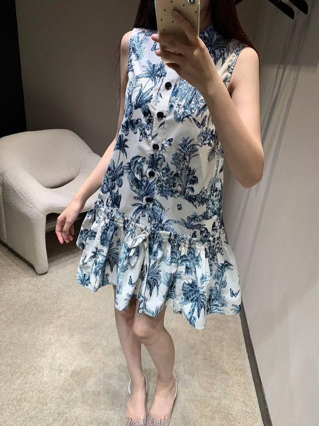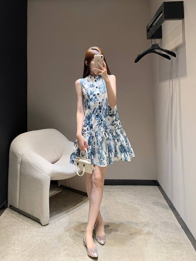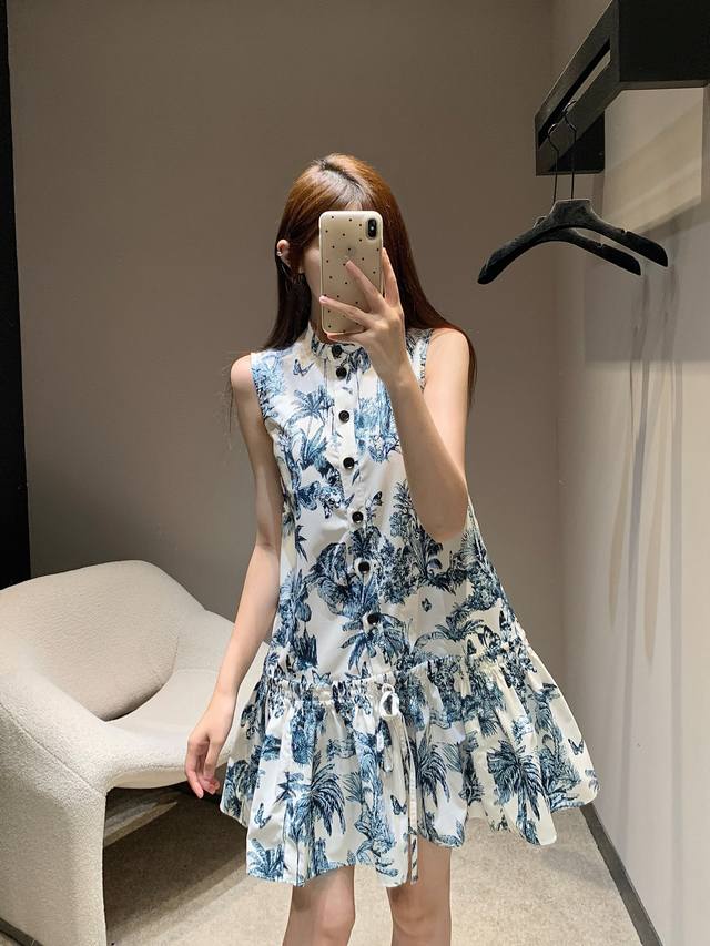 dio* 25Ss New Spring And Summer Plant Print Stand Collar Short-Sleeved Dress