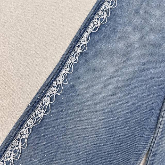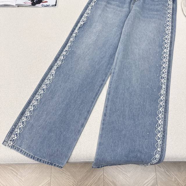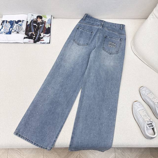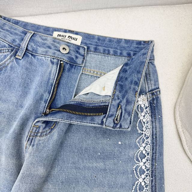 Exclusive Miu 25Ss Latest Spring And Summer Fashion Must-Have Splicing Water-Soluble Embroidery Edge Hot Diamond Jeans High Waist Straight Version Is Not Picky, Super Slim And Long Legs. Summer Light Color Denim Washing Is Super Good-Looking Temperament Exquisite All-Match Single Product Recommendation One Color Spot Sale Sml S Size Waist 66 Hip 94 Pants Length 103 Manual Measurement Error