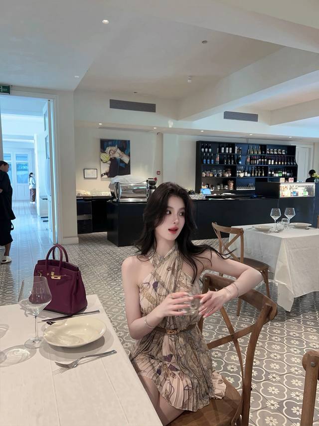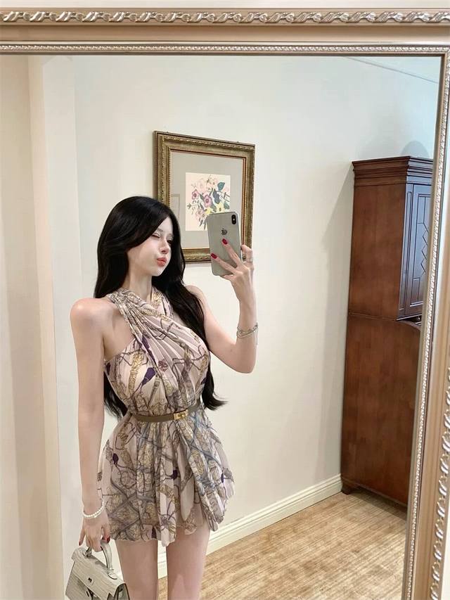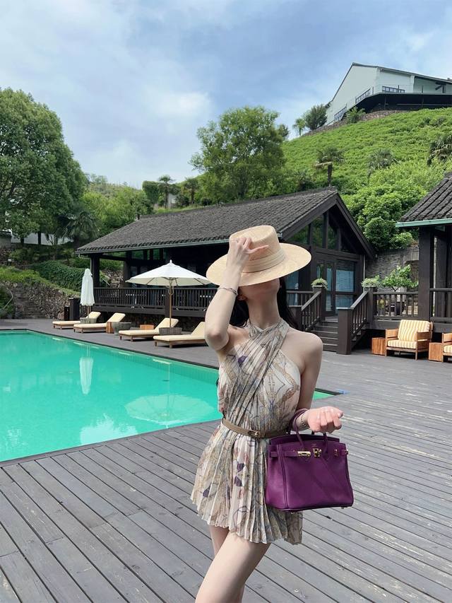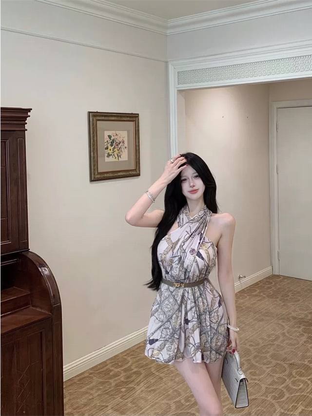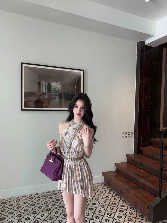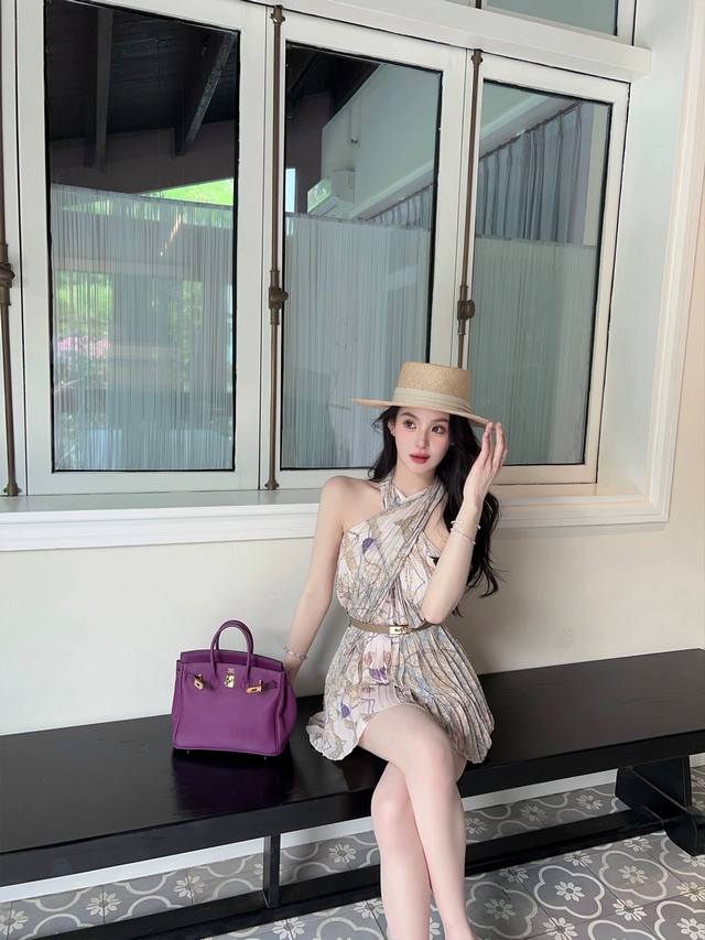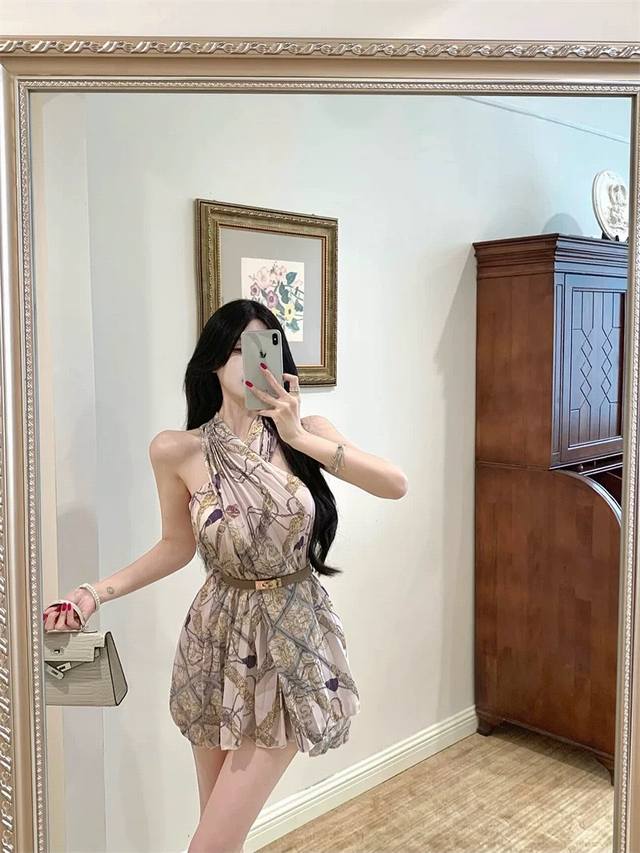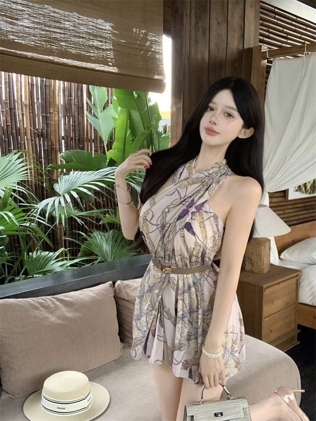 Summer Printed Chiffon Wrinkled Halter Neck Dress Off-Shoulder Pleated Short Skirt A-Line Skirt With Belt