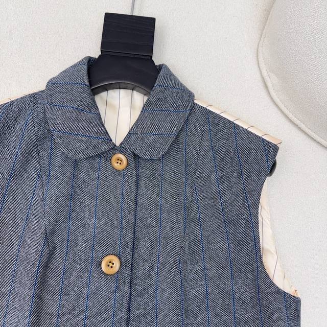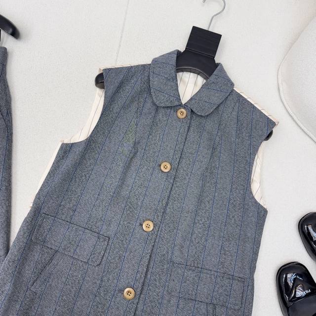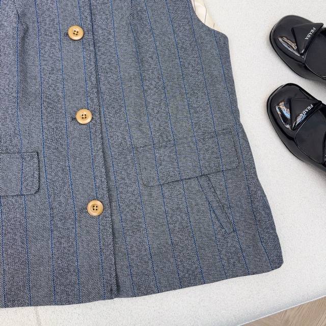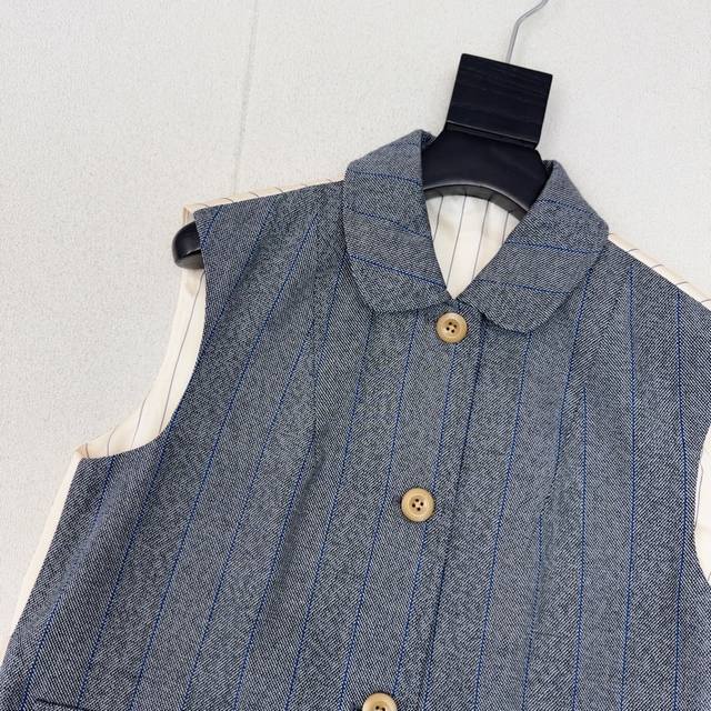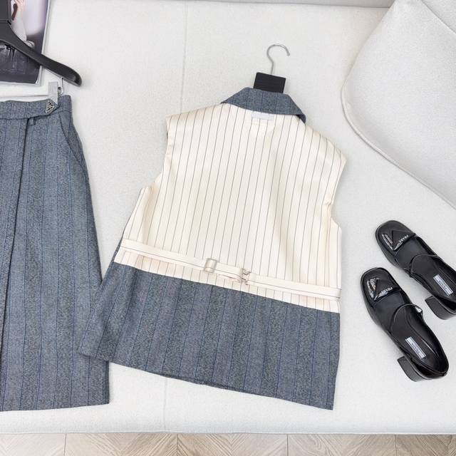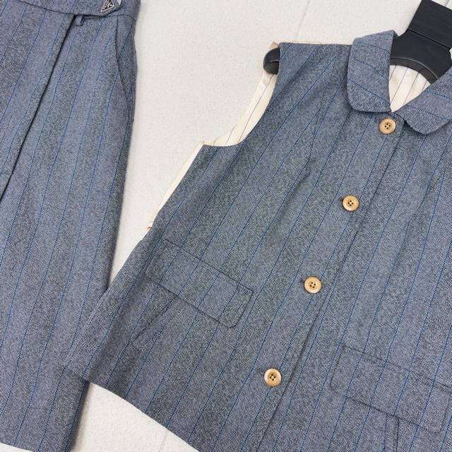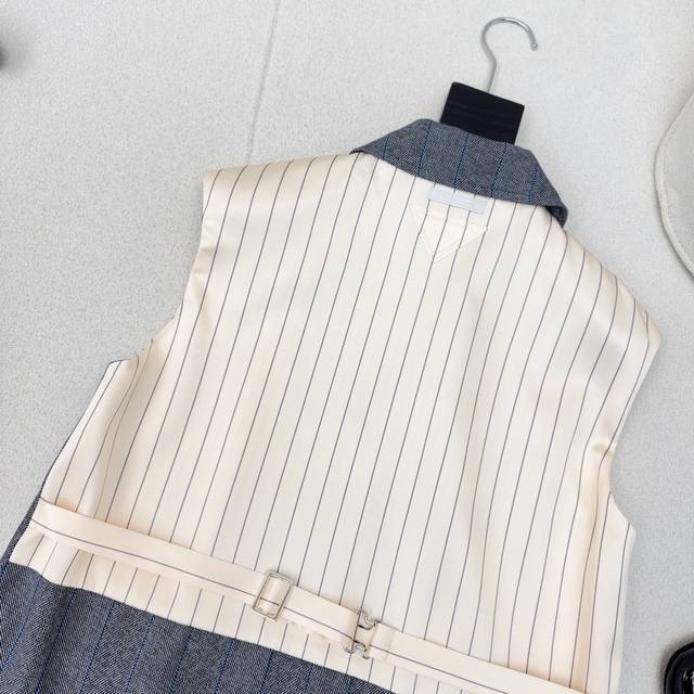 High-End Outfit Pd 25Ss Spring And Summer Latest Patchwork Vest Jacket Custom High-End Gray Striped Yarn-Dyed Fabric Age-Reducing Doll Collar Single-Breasted Version Retro Elegant Commuting Back Stripe Patchwork Back Collar Triangle Logo Embellishment Low-Key Luxury Interpretation Of Handsome And Elegant High-End Sense Recommended A Set Of Matching One Color Spot Sale Sml S Size Bust 96 Length 58 Manual Measurement Error