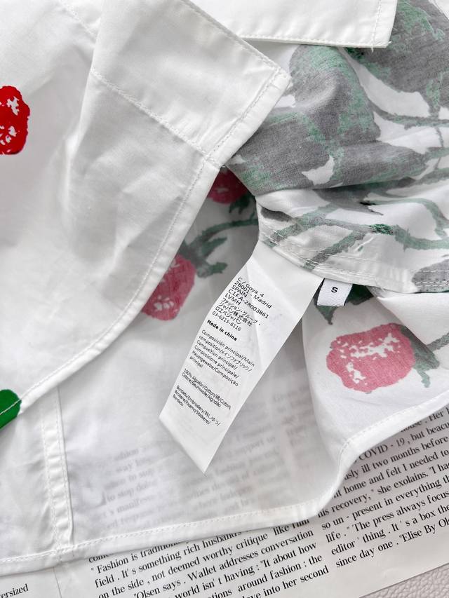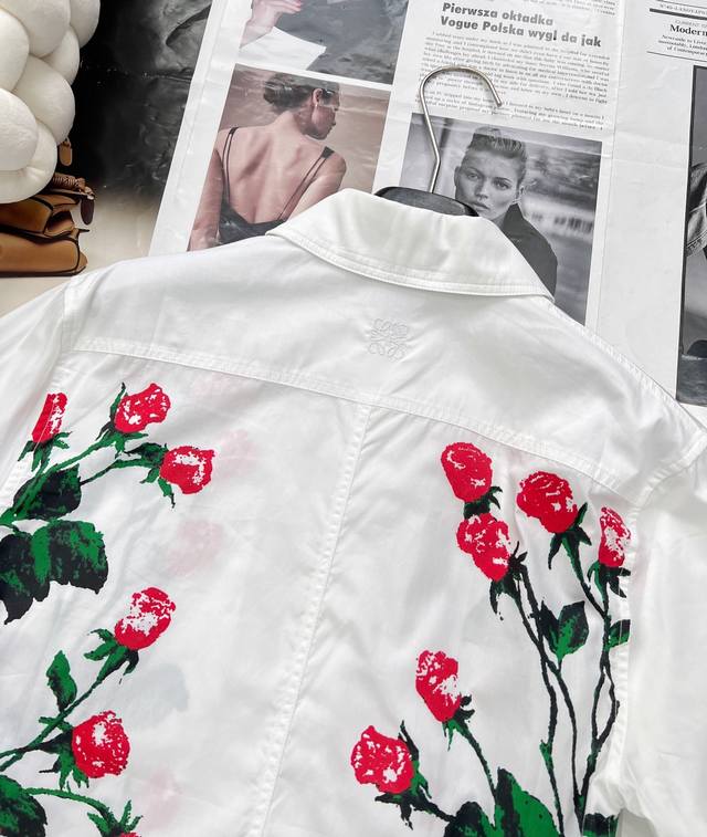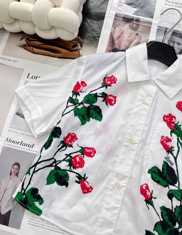 loewe25Ss Spring And Summer New Rose Print Lapel Short White Shirt | Exclusive Yb Development High Version Product Lightweight And Breathable Pure Cotton Custom Fabric Refreshing And Clean Like A Summer Breeze The Red Rose Print Is Romantic And Uninhibited French Style Let's Go On A Summer Date Retro And Romantic As If Wearing Monet's Spring Garden On Your Body Three Complete Labels Large Goods