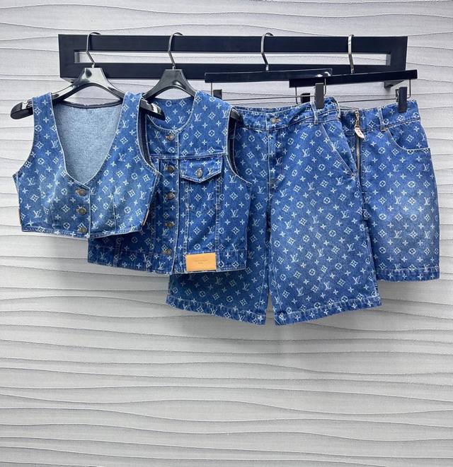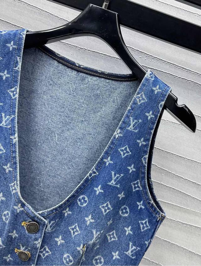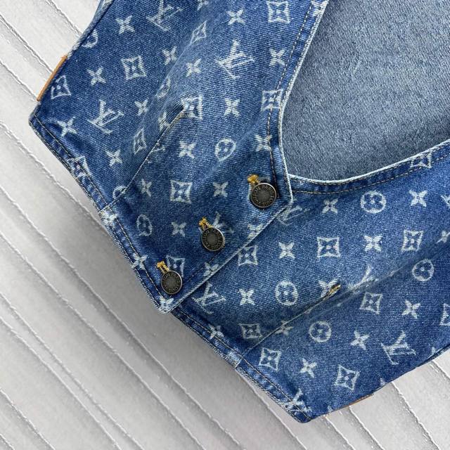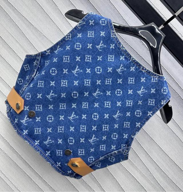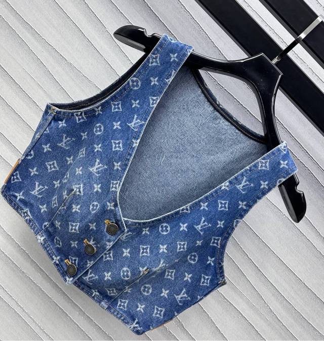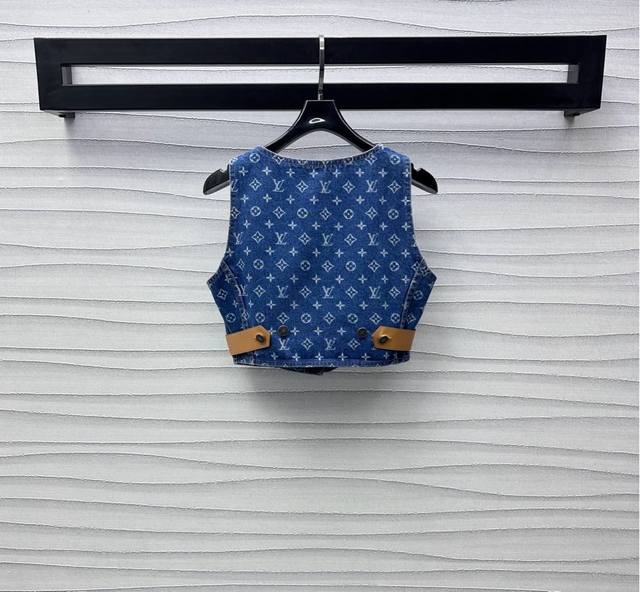 louis Vuitto*2025 New Arrivals Laser Denim Waistcoat Custom Yb Imported Twill Cotton Denim Material Is Crisp, Comfortable And Stylish Multiple Enzyme Washes Are Not Easy To Dye And Fade Open V-Neck Engraved Button Adjustment Basic Contour Line Adds Layering To The Shape The Whole Body Is Embellished With The Iconic Four-Leaf Clover Letter Logo And The Waist Leather Buckle Tightens The Design To Highlight The Brand Tone Surface And Auxiliary Materials Development Short Vest Cut Can Be Matched With The Same Series Of Skirts And Pants To Complete The Outfit And Wear Alone To Create A Colorful And Fashionable Series Development