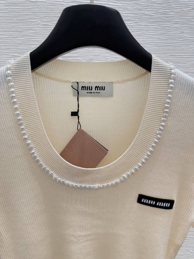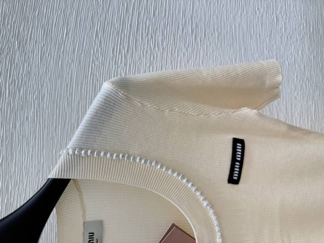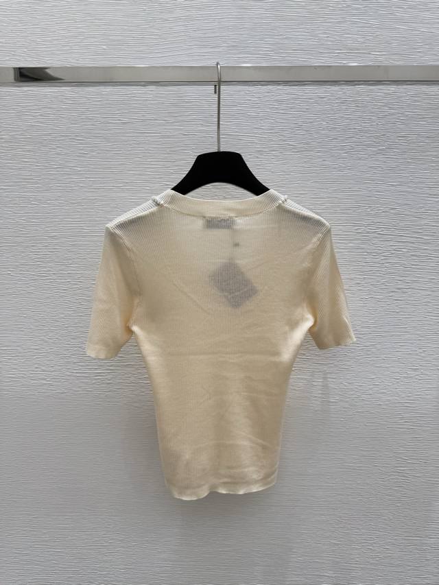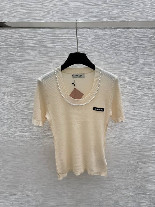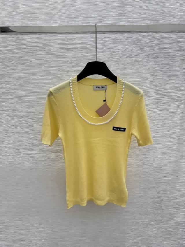 m Early Spring New Round Neck Beaded Knitted Short Sleeve Color White Yellow