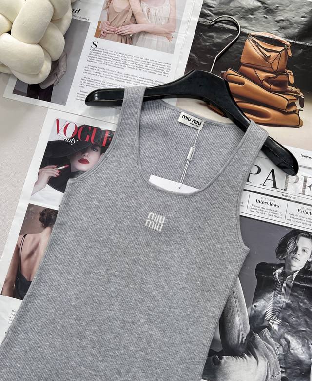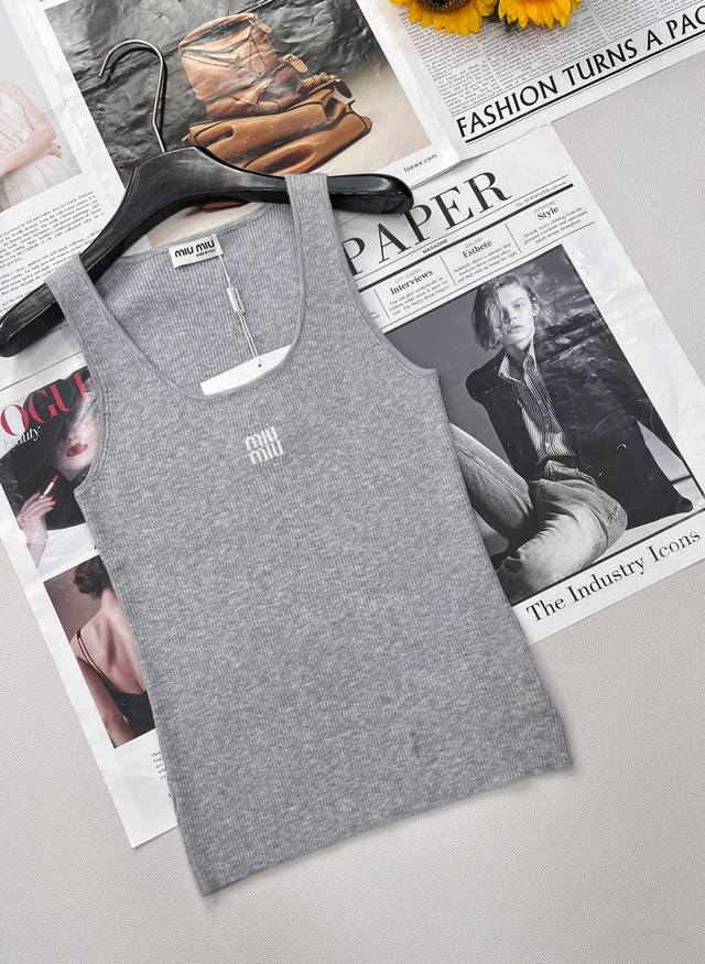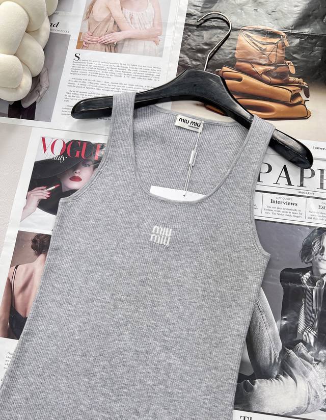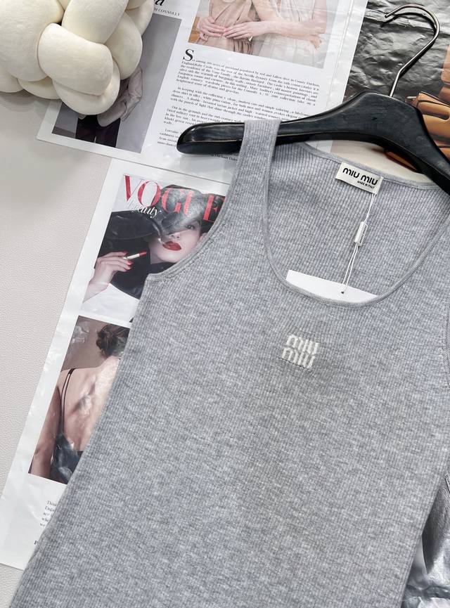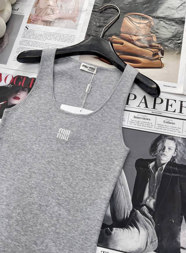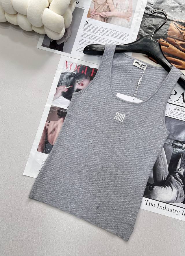 Miu Miu Ribbed Letter Jacquard Logo Knitted Vest Customized Yarn Fabric Delicate Ribbed Texture Gives The Vest Just The Right Elasticity And Three-Dimensional Sense Fits The Body Shape Without Losing Comfort Soft Gray Tone Reveals High-End Texture In Simplicity Like A Misty Urban Morning Low-Key But Full Of Charm