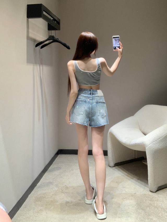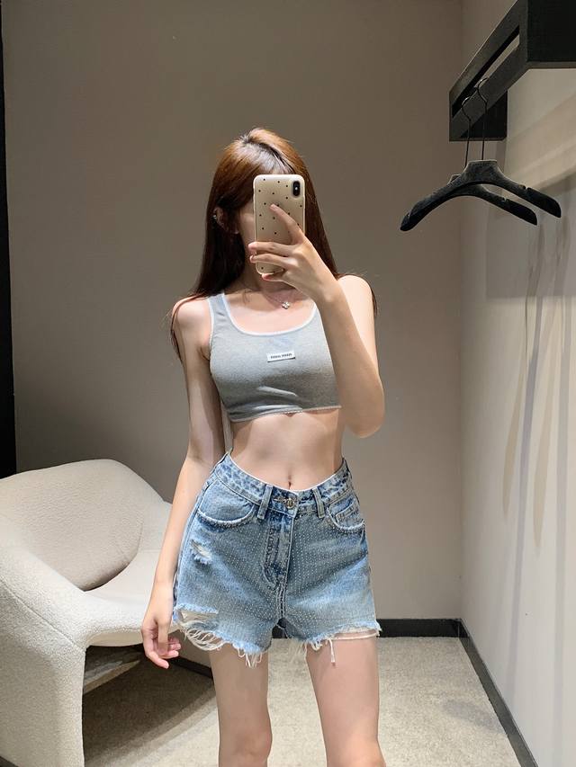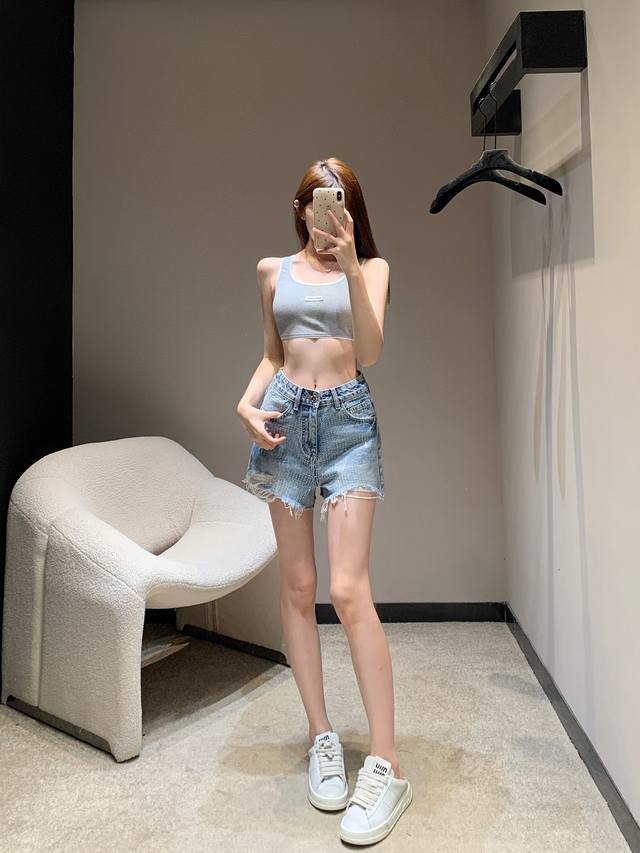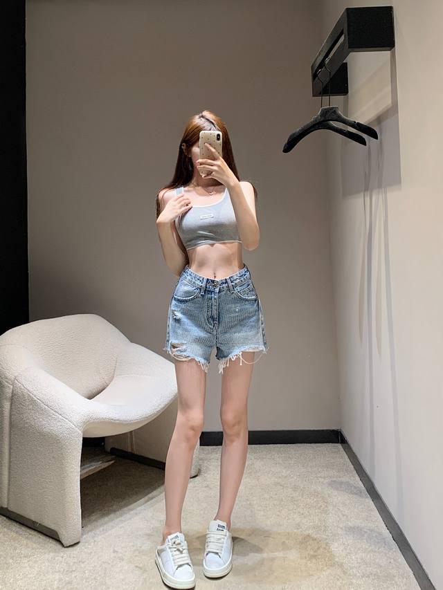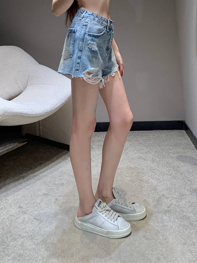 miumi* 25Ss New Spring And Summer Heavy-Duty Hot-Drilled Ripped Denim ShortsE