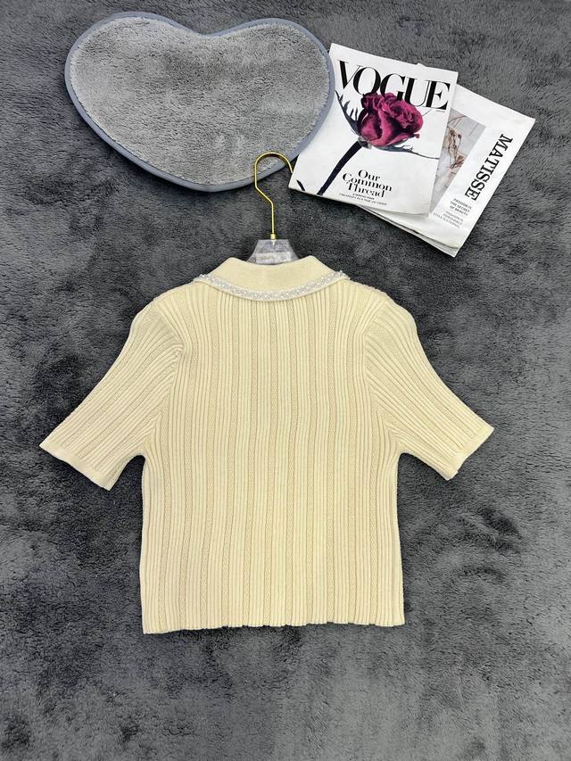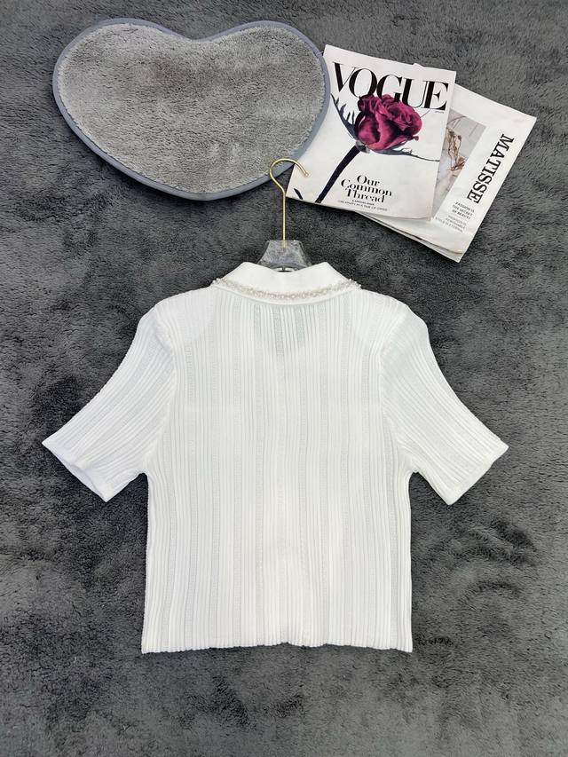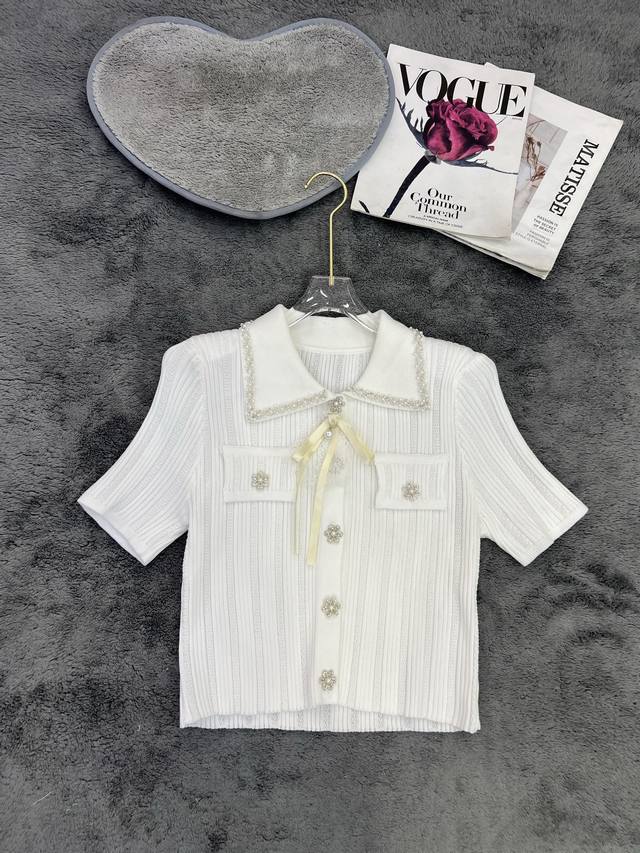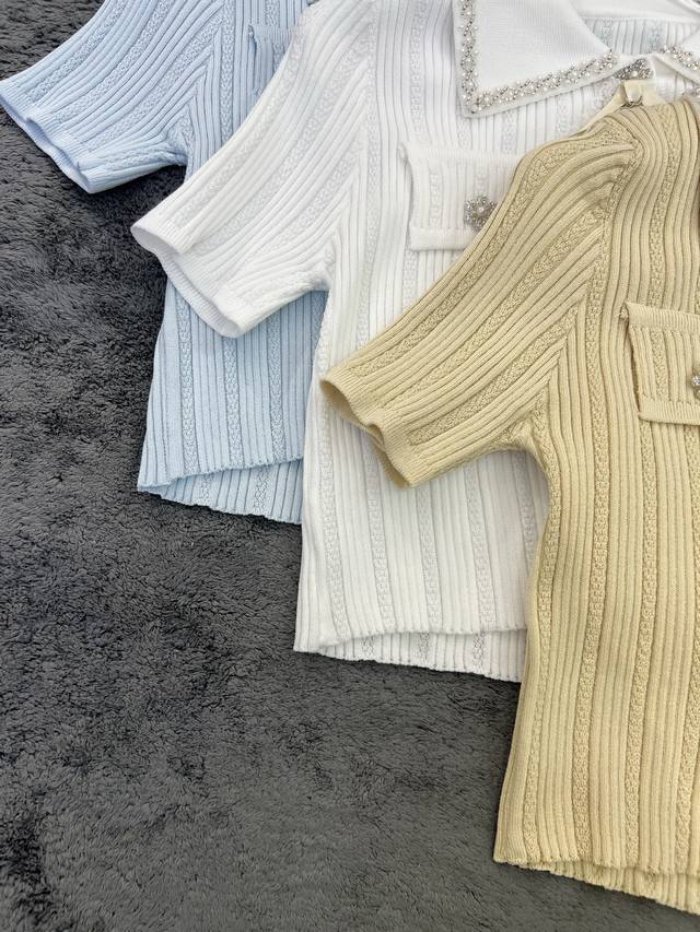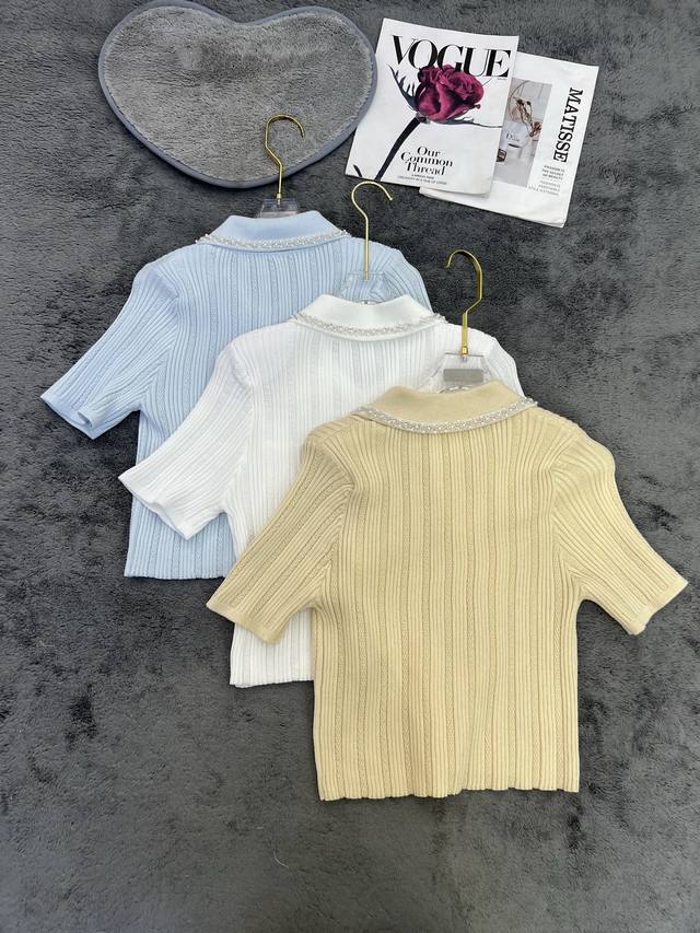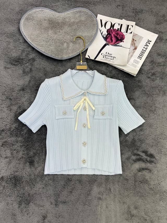New Arrival Design Lapel Heavy Beaded Short-Sleeved Knitted Top Blue, White And