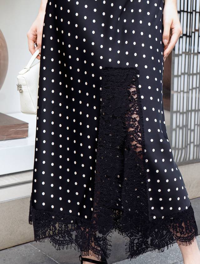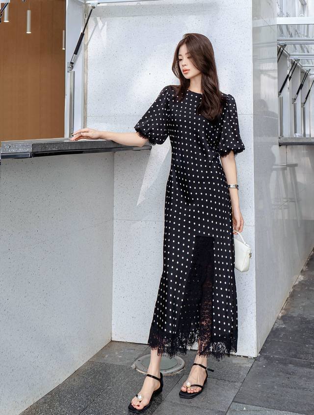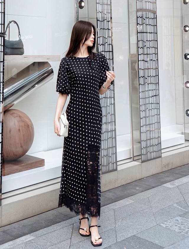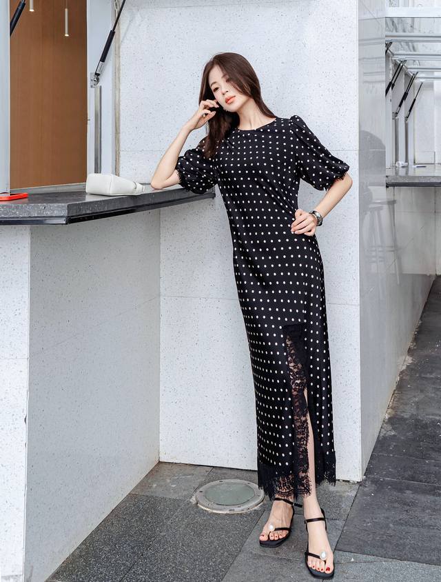 New Arrival Polka Dot Acetate Dress Puff Sleeves Hem Slit Lace Stitching Design