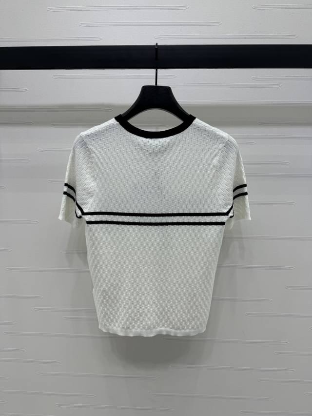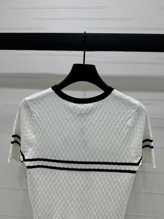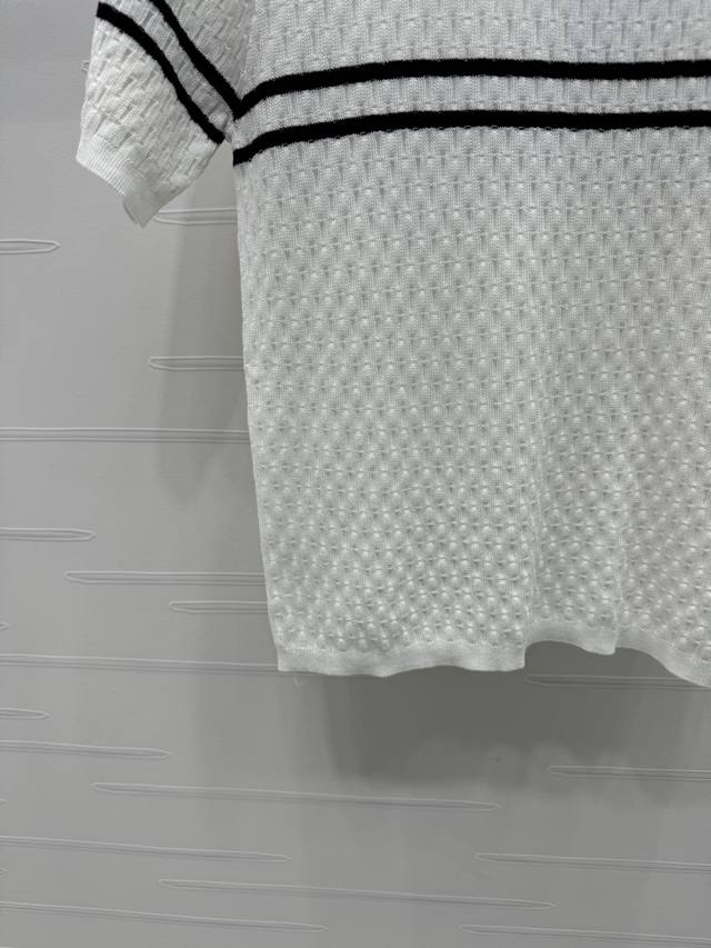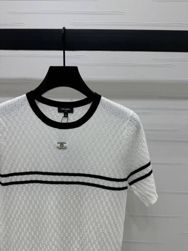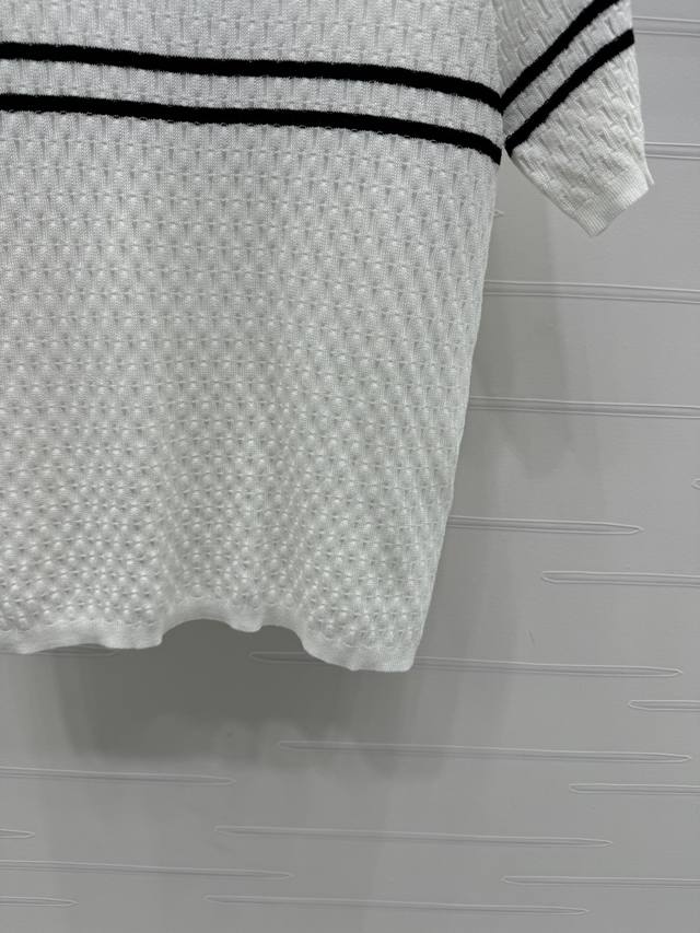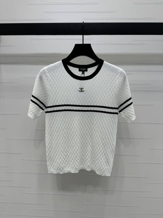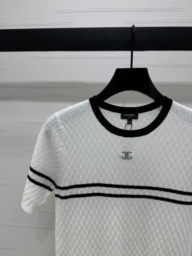 New Original High-End Quality Chane* 2025 Spring And Summer Latest Series Horizontal Striped Knitted Short Sleeves Customized Silk And Wool Yarn Weaving Full Of Quality Follow The Line To Move The Horizontal Bar Stripes On The Chest Extending To The Sleeves And Neckline To Echo The Double C Metal Embellishment To Interpret The Fashionable And Simple Style 2 Colors Sm-L3 Size High Quality Large Goods