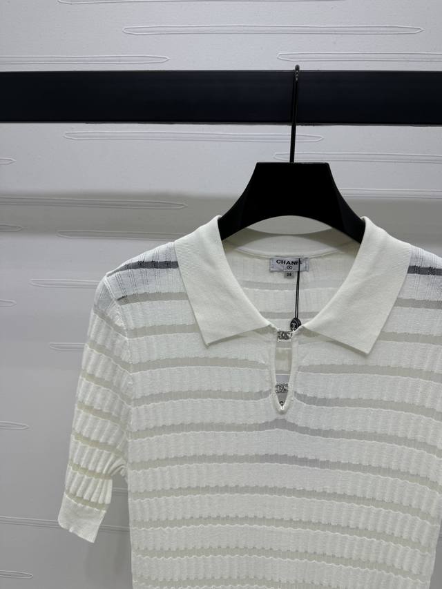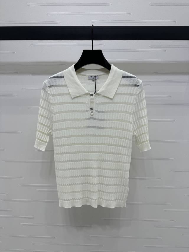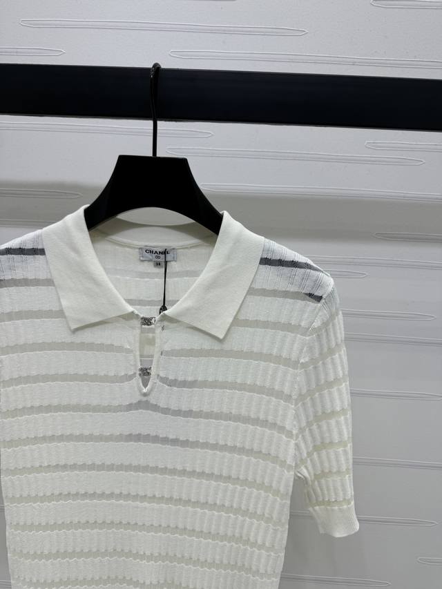 New Original High-End Quality Chane* 2025 Spring And Summer Latest Series Lapel Splicing Knitted Short Sleeves Customized Silk And Wool Yarn Weaving Texture High-End Comfortable Lapel Knitted Short Sleeves Exquisite Tailoring Double C Letter Logo Buttons Highlight The Brand Personality Highlight The High-End Sense Of Wear Horizontal Splicing Stripes Make You Look Slim And Fashionable Micro-Transparent Fabrics Make Simple Styles Look Sexy And Individual Regular Version Shows Relaxed Tone Light Luxury And Fashionable Temperament 3 Colors Sm-L3 Size High Quality Bulk