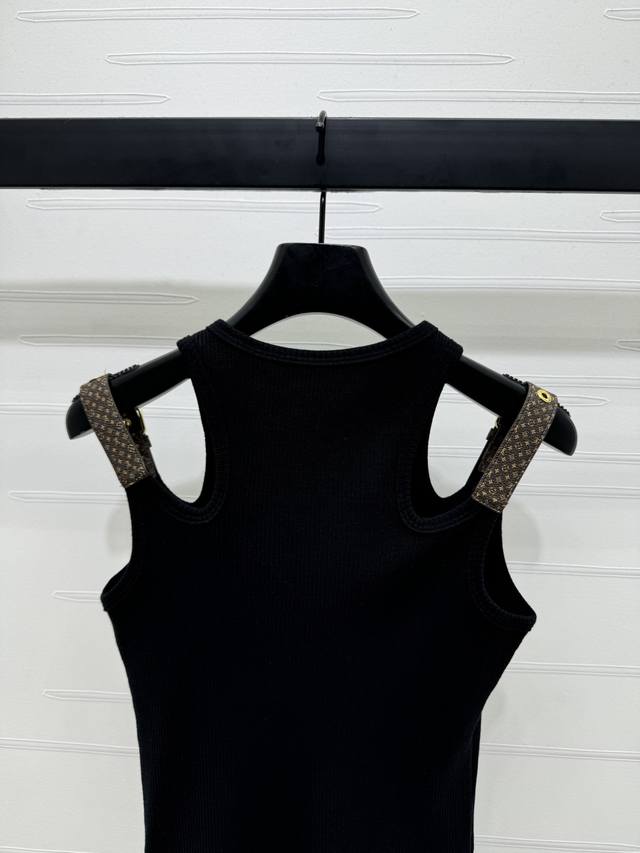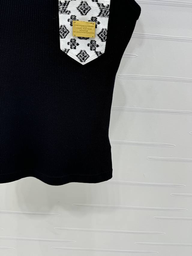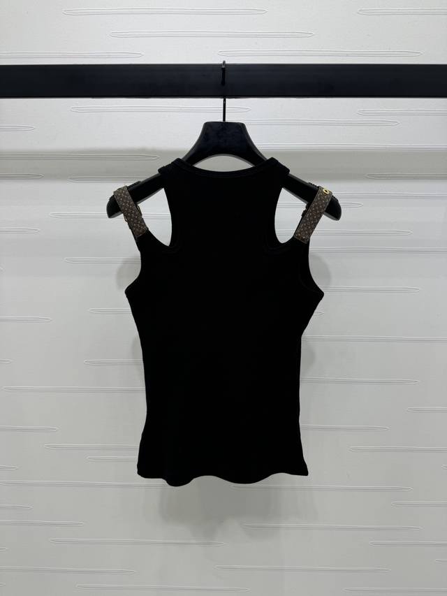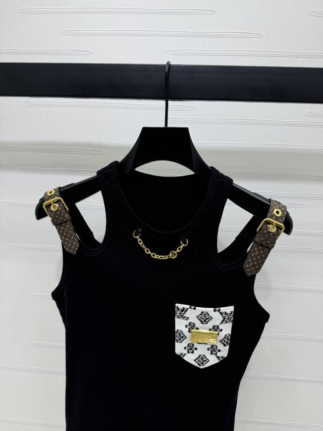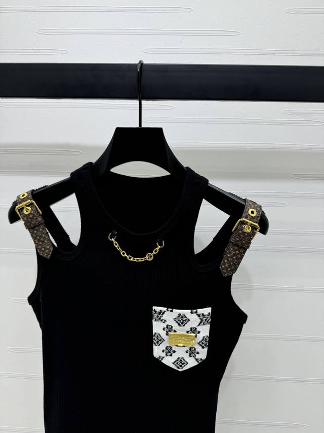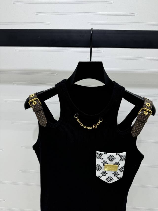 New Original High-End Quality Louis Vui*Ton 2025 Spring And Summer Latest Series Off-Shoulder Vest Custom Imported Twill Cotton Material Elastic Slim Fit Pure Cotton Texture Comfortable And Breathable Neckline Decorated With Metal Letter Chain Decoration To Add Layered Shape Chest Splicing Old Flower Denim Pocket Design Highlights The Brand Tone Highlights High-End Style Round Neck With Adjustable Leather Buckle Off-Shoulder Design Elegant Upper Body Temperament Slightly Waisted Vest Cut To Outline The Waistline Upper Body Is Slim And Inclusive 2 Colors Sm-L3 Size High Quality Large Goods