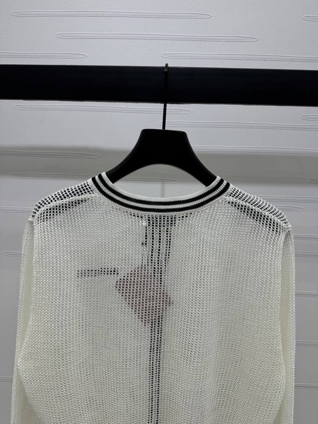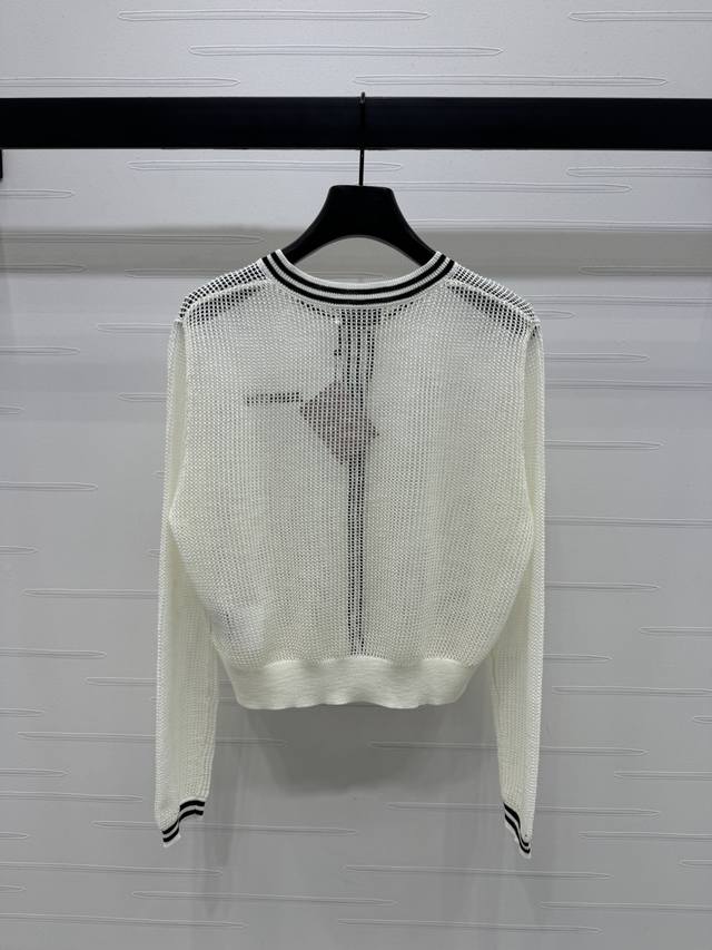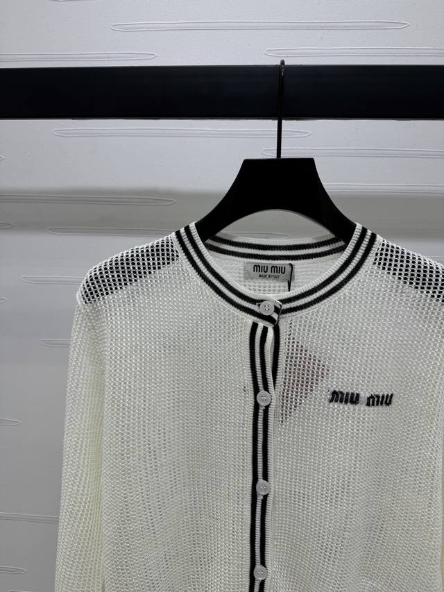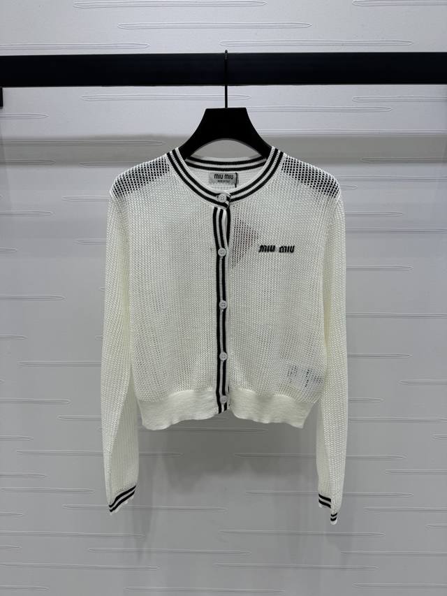 New Original High-End Quality Miumi*2025 Spring And Summer Latest Series Hollow Knitted Cardigan Customized Silk Wool Yarn Weaving Texture Cool Breathable Knitted Cardigan Tailoring The Whole Body Uses Hollow Crochet Texture Interweaving To Highlight The High-End Sense Of Wear The Neckline, Cuffs And Front Extend To The Hem. The Threaded Stripes Are Trimmed With Elasticity For A More Refined Look. The Slim Version Is Accommodating To The Figure And Shows A Relaxed Tone. The Contrasting Logo On The Chest Highlights The Light Luxury And Fashionable Temperament. 4 Colors Sm-L3 Sizes High Quality Large Goods