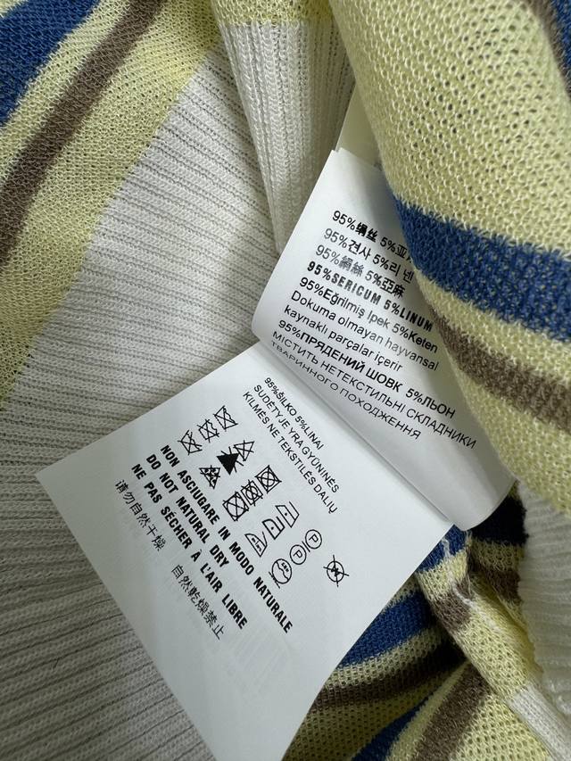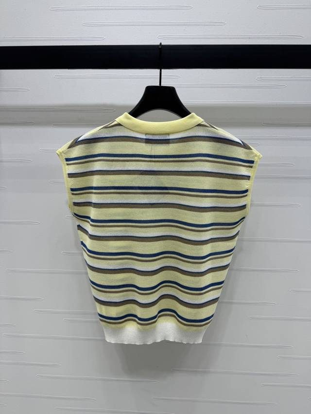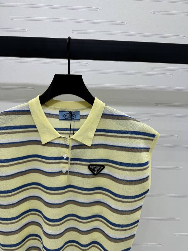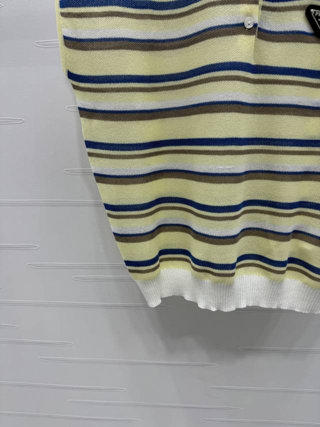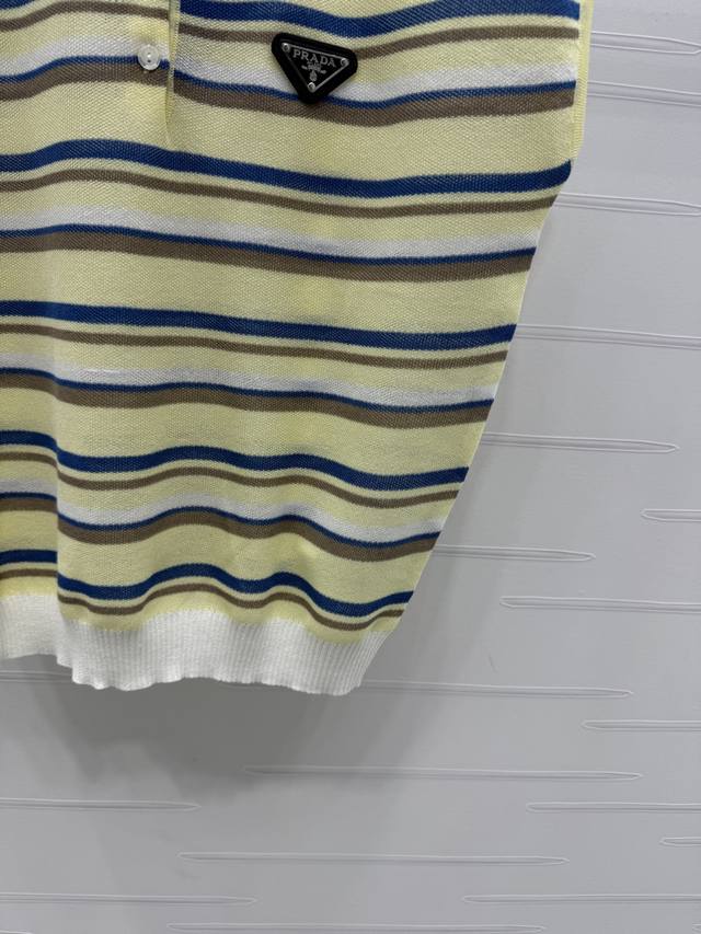 New Original High-End Quality Prad* 2025 Spring And Summer Latest Series Striped Knitted Short Sleeves Custom Wool Yarn Weaving Texture High-End Comfortable Knitted Lapel Short Sleeves Tailoring Yellow, White, Blue And Brown Interweaving Throughout The Body Eye-Catching Full Score Highlight Brand Personality Highlight The High-End Sense Of Wear Triangle Logo Hardware On The Chest Highlight Light Luxury And Fashionable Temperament Can Be Worn Alone Or Layered First Choice For Fashionable Wear In All Seasons 2 Colors Sm-L3 Size High Quality Large Goods A706B320C