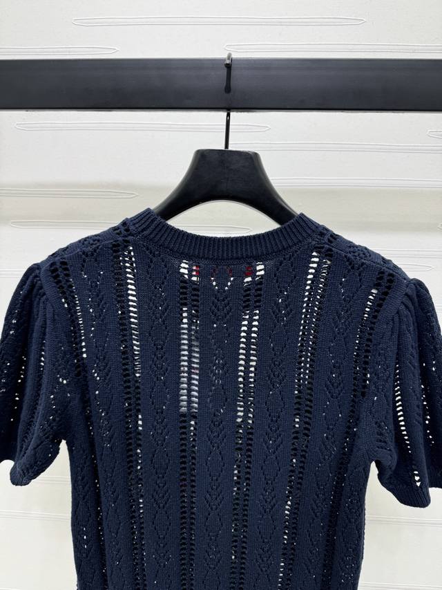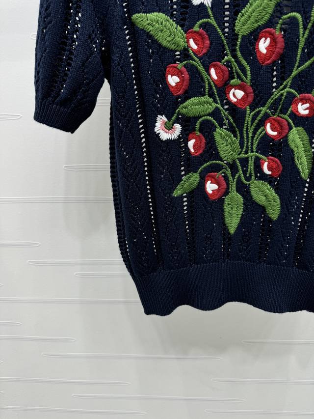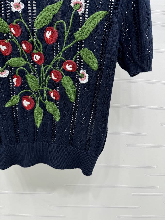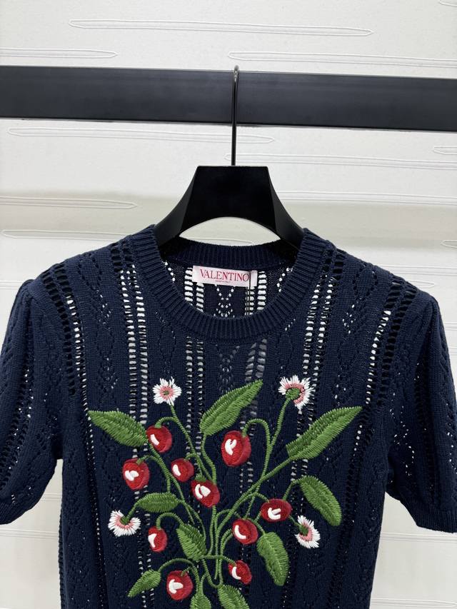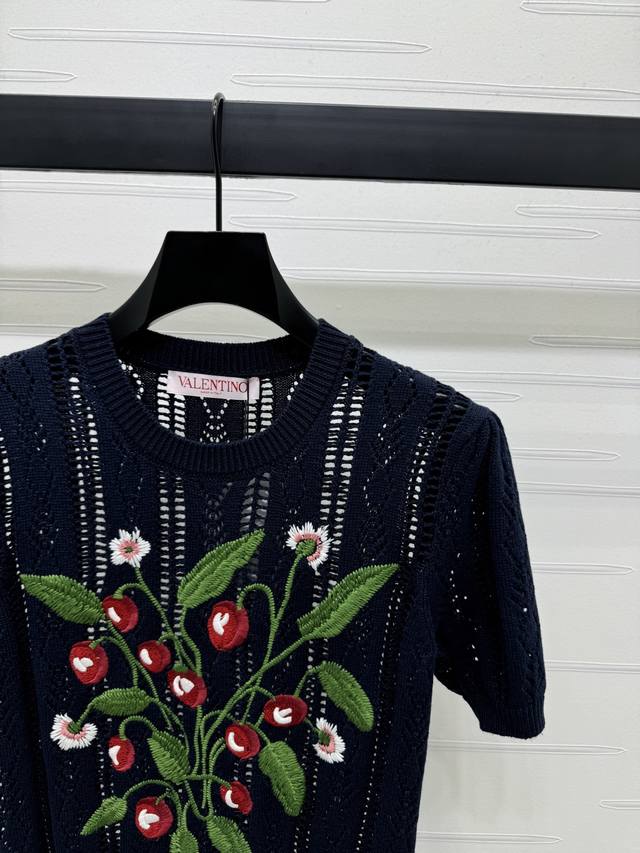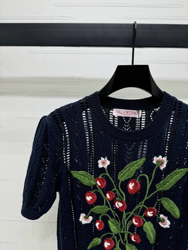 New Original High-End Quality Valentin*2025 Spring And Summer Latest Series Round Neck Embroidery Knitted Short Sleeves Customized Wool Yarn Weaving Texture Superior Round Neck Knitted Short Sleeves Tailoring Gentle And Casual All-Over Hollow Woven Texture Chest Embroidered Colorful Cherry Vines And Leaves Show The Fairy Spirit Of The Forest Brand Tone Gentle Temperament Wear Single Item 2 Colors Sm-L3 Size High Quality Large Goods A706B360C