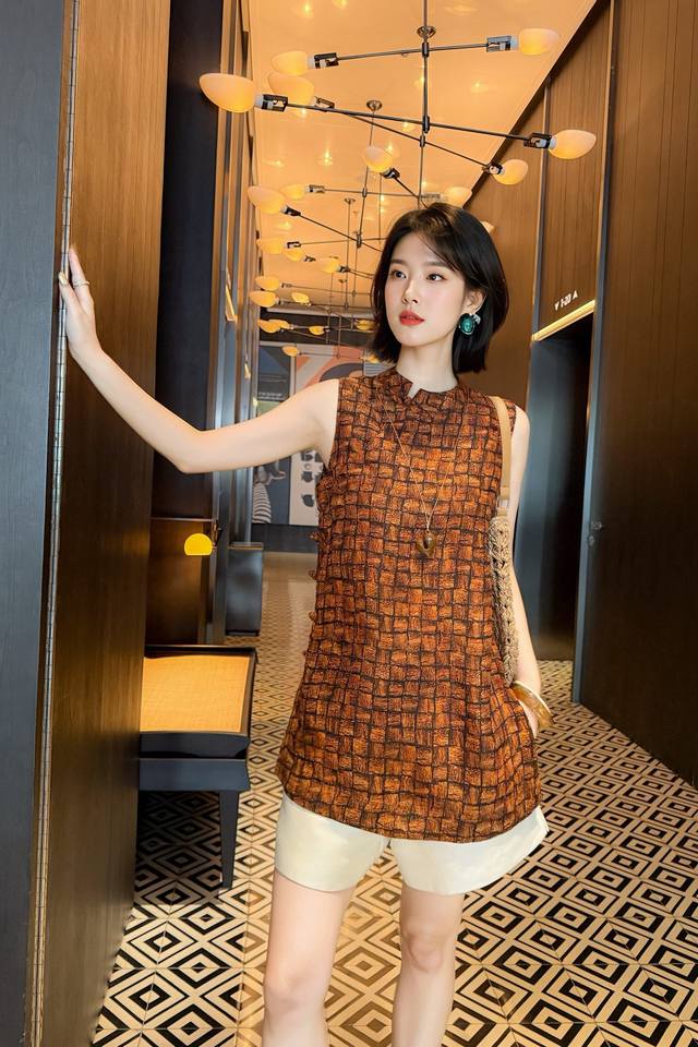 / New Small Stand Collar Slant Front Placket Silk Silk Long Vest 4 Colors Plaid Bl