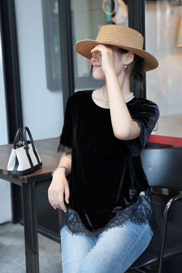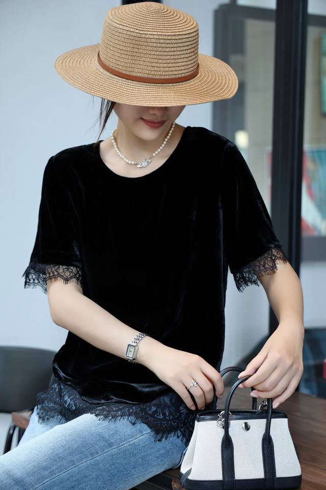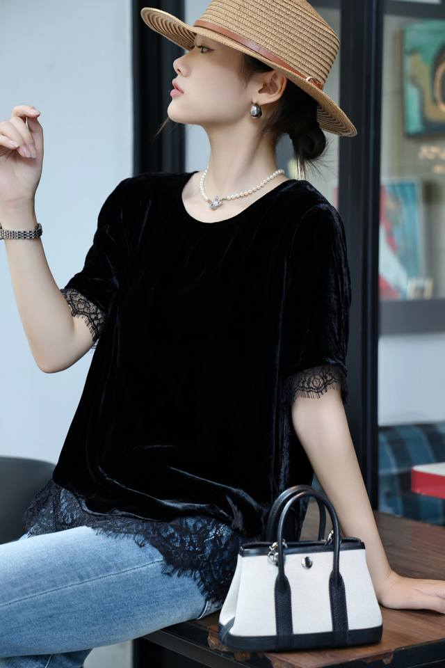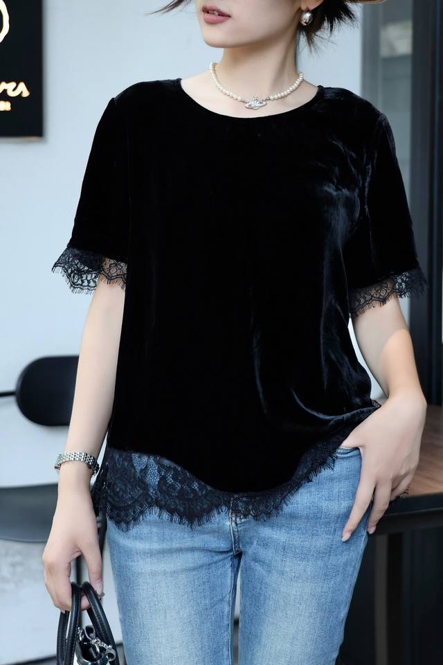 New Style Design Wave Edge Stitching Lace Top Material 100% Silk Velvet Size S-X