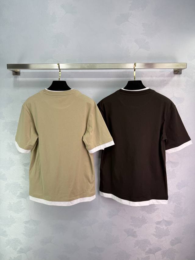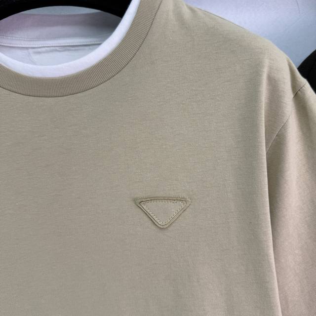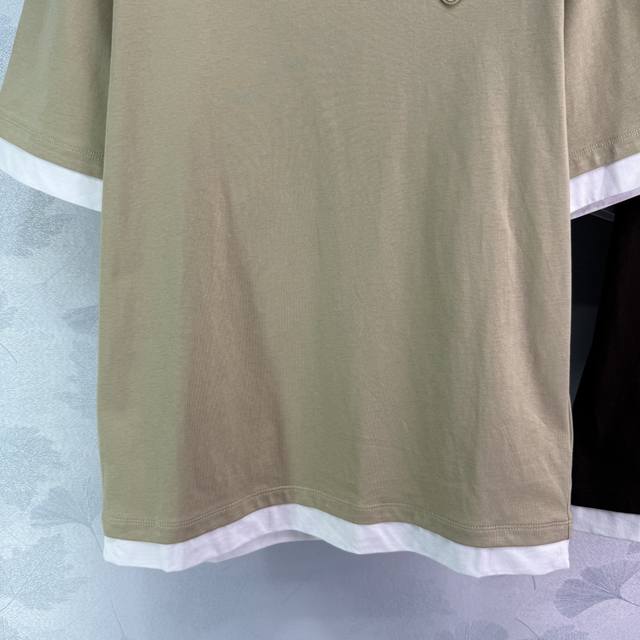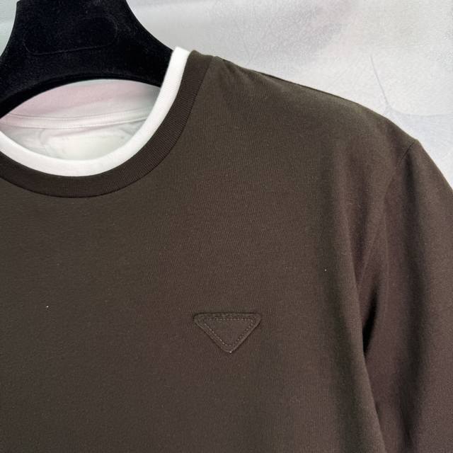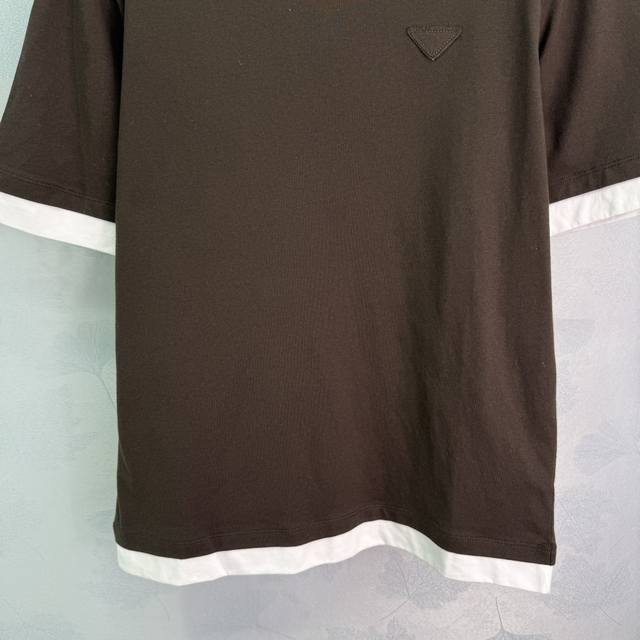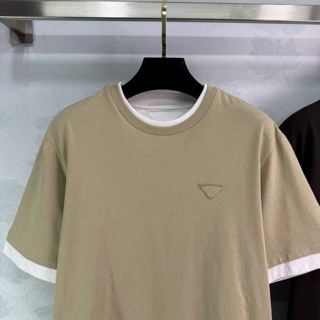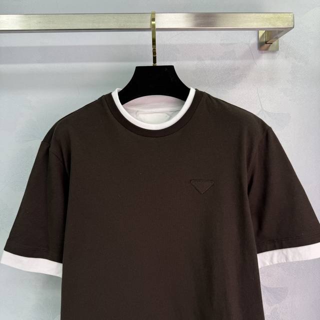 pr*2025 Spring And Summer New Round Collar Fake Two-Piece Cotton Short Sleeve Chest Triangle Embroidery Logo Temperament Round Collar Contrast Color Design Versatile Fashionable Absolute 2 Colors 3 Sizes Sml T226B