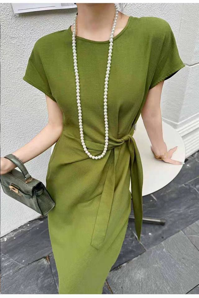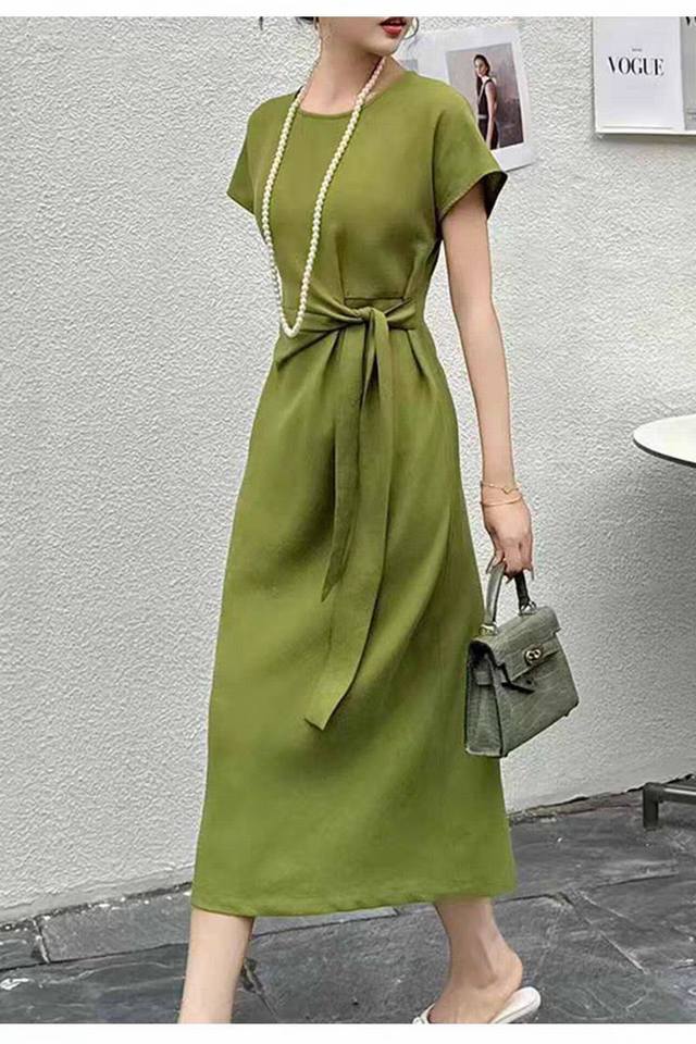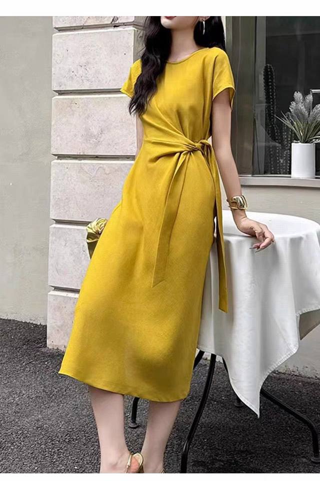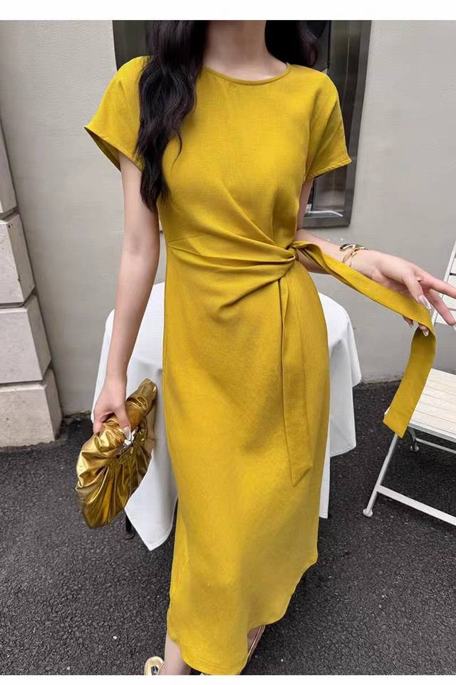 Re-Order Shipment The Above Picture Must Be Supplemented Linen French Lady Style Tie Waist Dress Yellow. Green Two Colors Four Sizes Smlxl