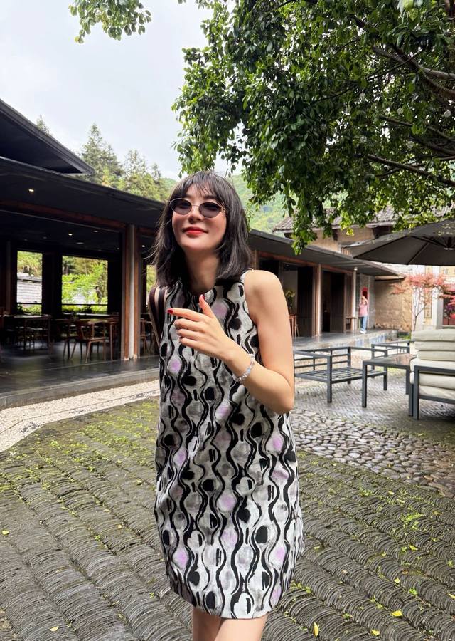 Simple Style Retro Imported High-Branch Cotton Printed Vest Dress Black Flower S--Xl