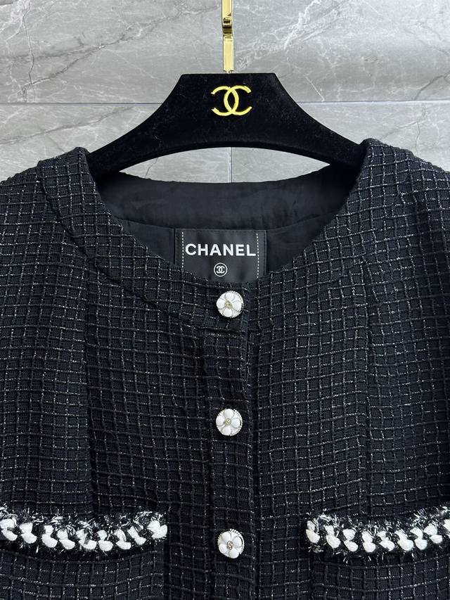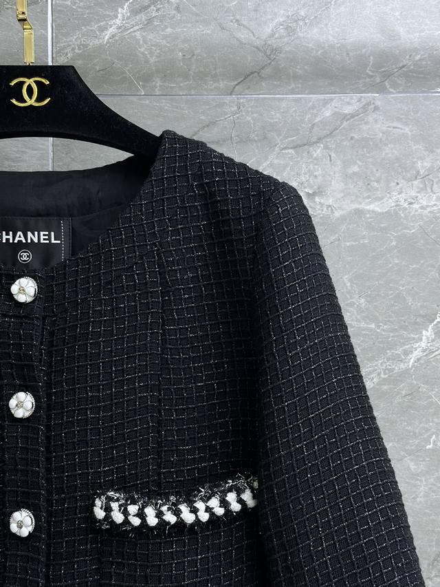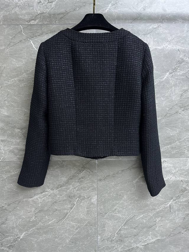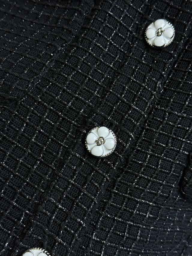 Xiangjia Black Tweed Jacket Spring And Summer Series Round Neck Collar Design Bright Silk Plaid Woven Four-Leaf Clover Logo Button Decoration Embellishment Simple And Generous Advanced Custom Tweed Fabric Silk Lining Short Version Upper Body Slim And Elegant Trademark Full Size Sml