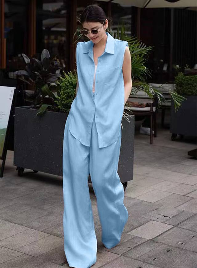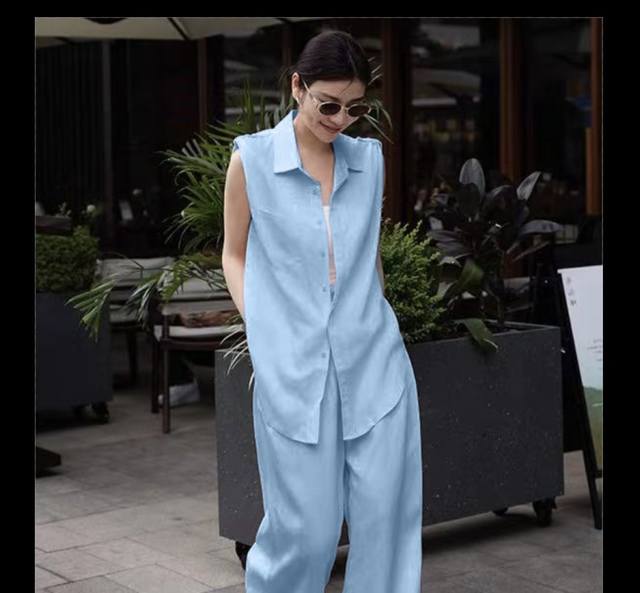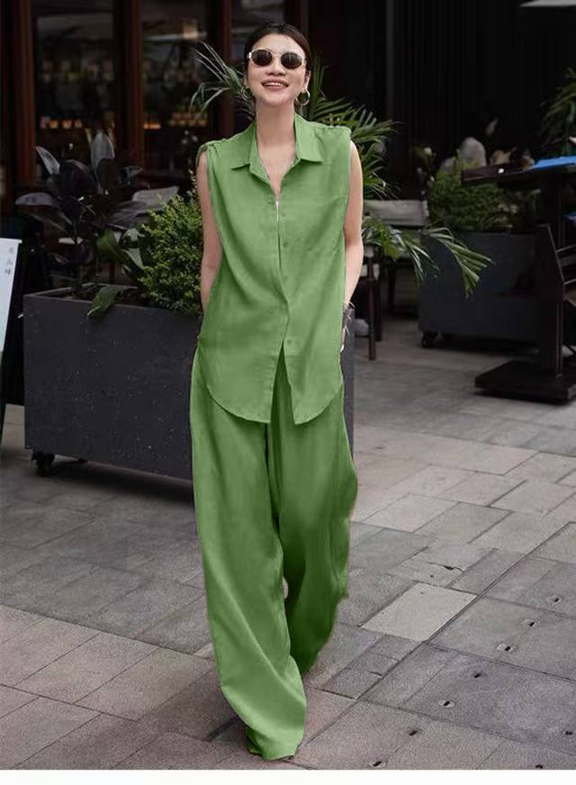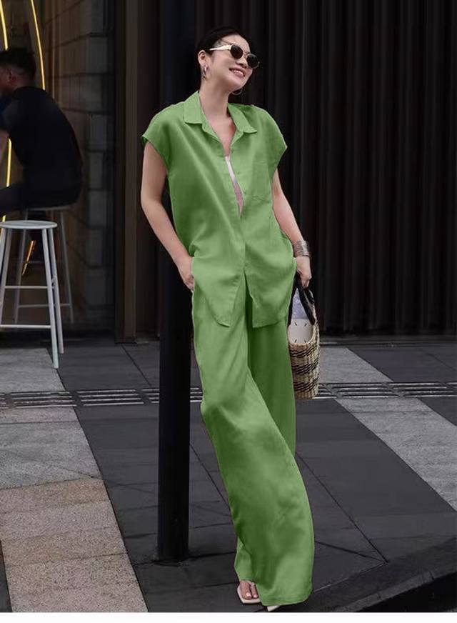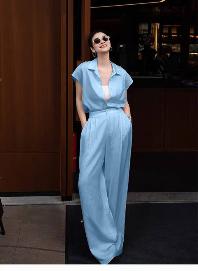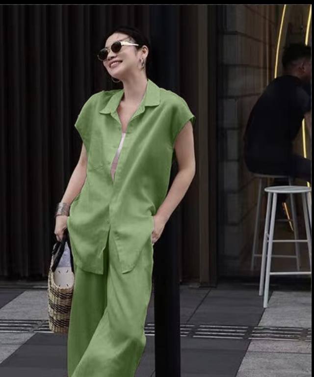 Heavy 100% Linen Suit Simple Drop Shoulder Linen Shirt Wide Leg Pants Two-Piece Suit Drop Shoulder Can Be Adjusted To Sleeveless Shirt Design Simple Lines Show Casual Temperament Wide Leg Pants Loose Version Strong Drape To Modify The Leg Line, Make The Legs Look Longer And Create A Lazy Atmosphere The Overall Color Tone Is Soft, Creating An Elegant And Gentle Yet Fashionable Style Blue Green Smlxl