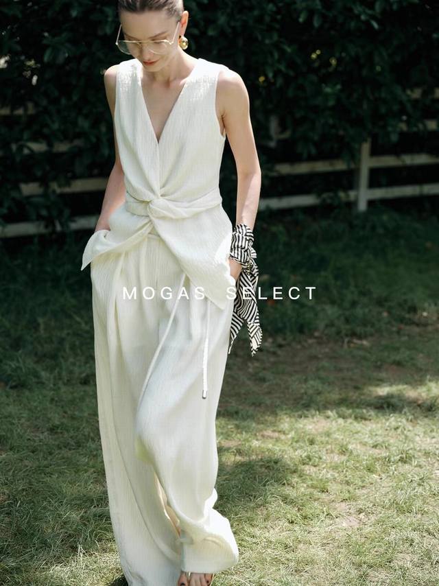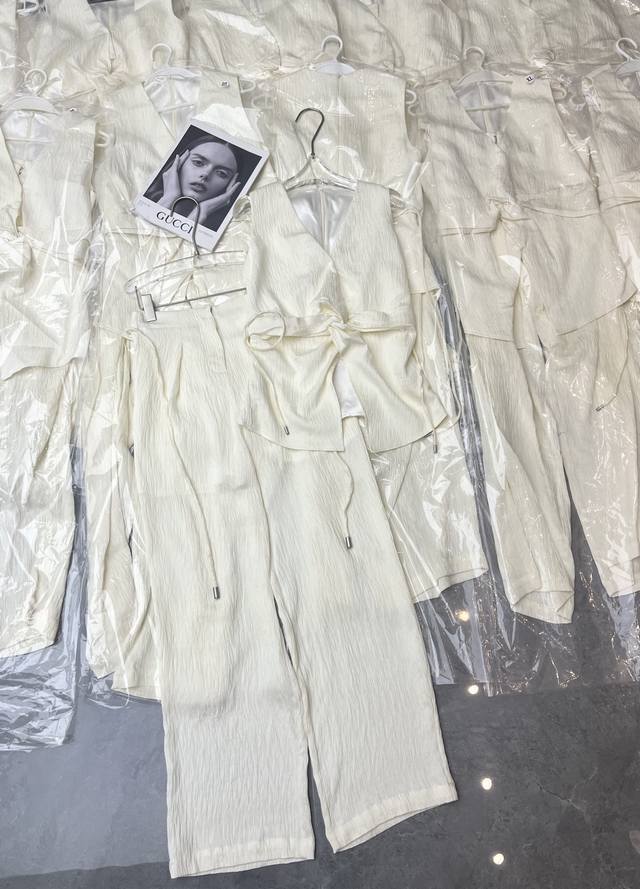 High-End Fashionable Beauty Wrinkled Waist Twisted V-Neck Lazy Vest Suit The Front Center Artistic Pleated Twisted Design And Texture Fabric Together Create A Three-Dimensional Visual Layered Shape With Outstanding Texture Without Exaggeration. The Classic V-Neck Is Deep And Exquisite, Extending The Neck Curve To Show The Elegant Head And Neck Proportion. The Side Waist Is Three-Dimensionally Cut And Matched With Adjustable Lace-Up Design. The Smooth Lines Modify The Waist And Abdomen Curves. Smlxl