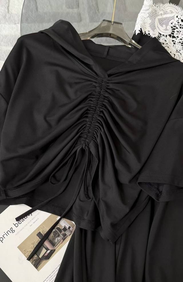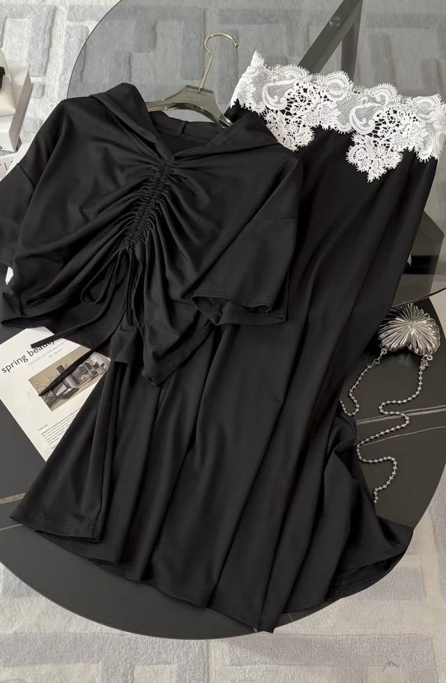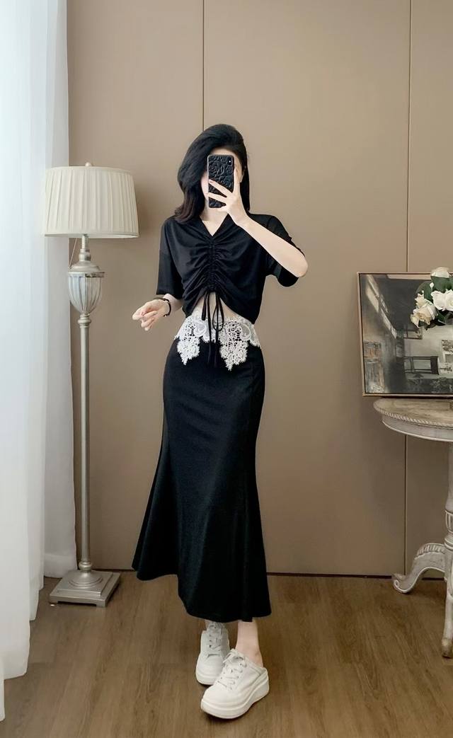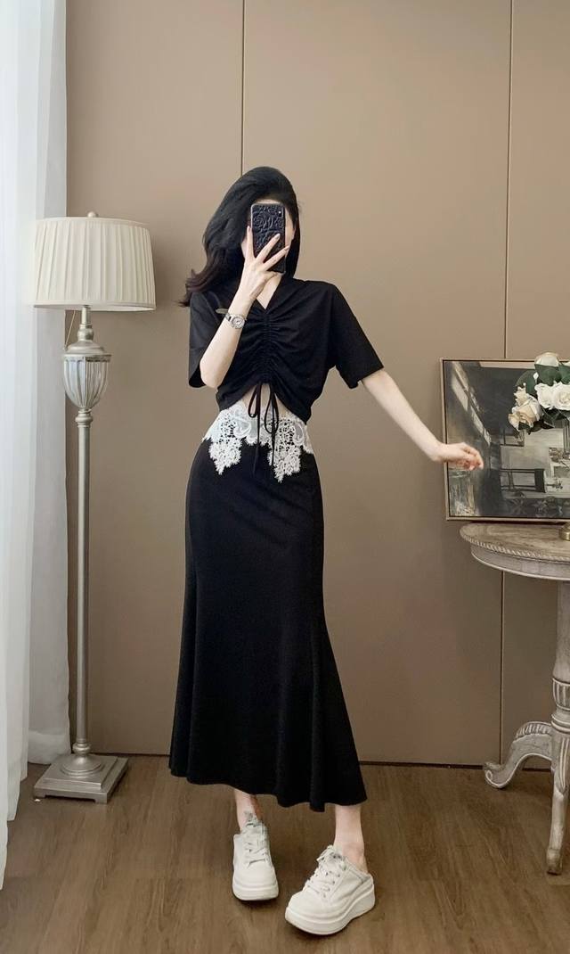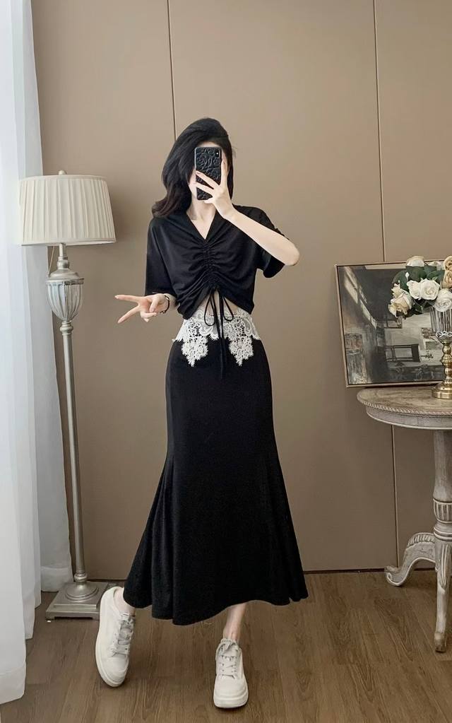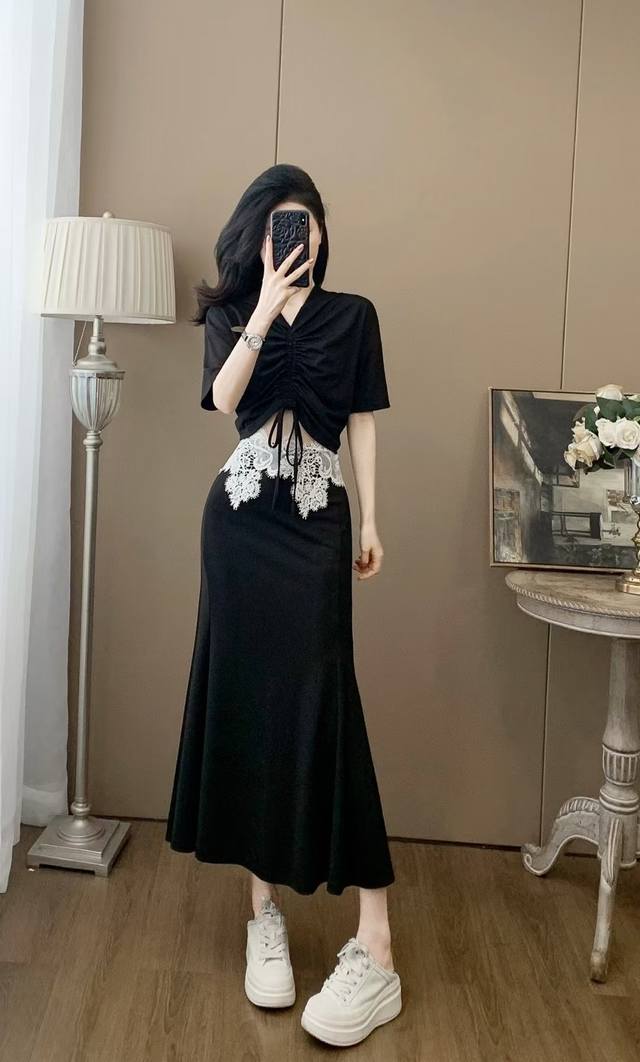 Summer Drawstring Top Lace Waist Skirt Suit Fabric: Cotton Polyester. Spandex 106.47.66.83 Small Size Data : Bust Length Waist Apron Length 188569