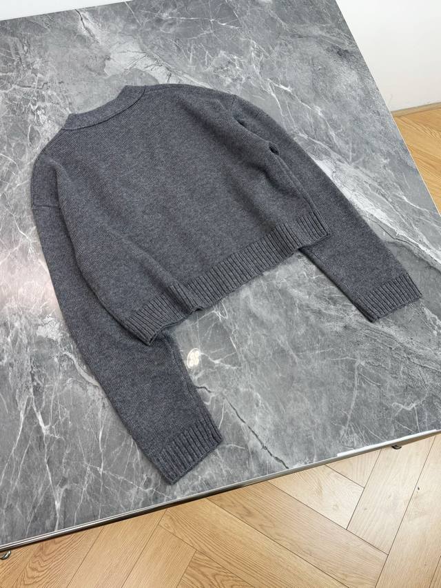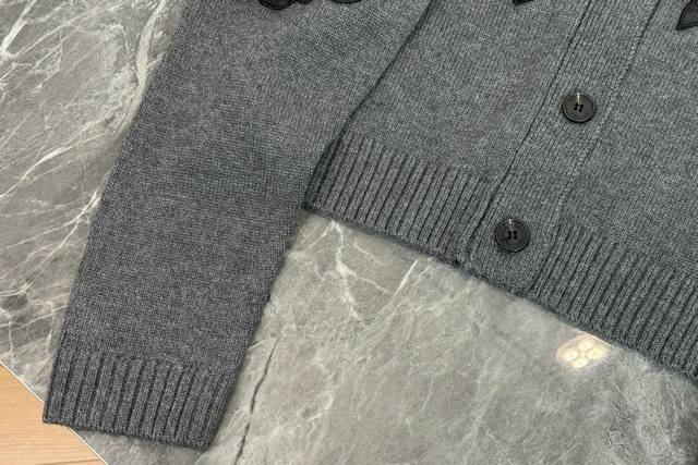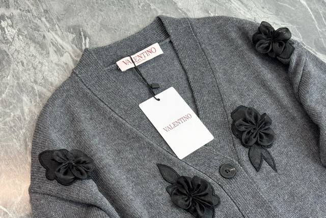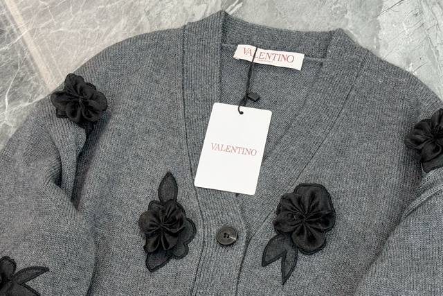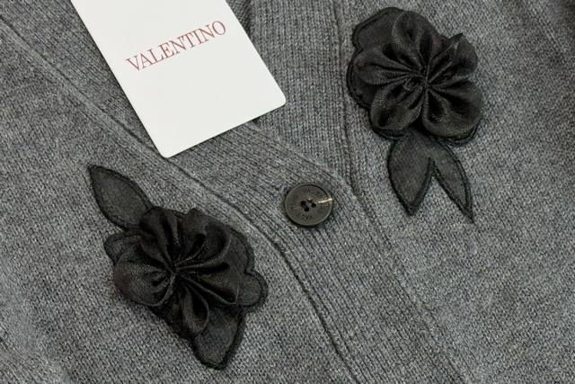 25 New Valentino grey knitted cardigan with a classic V-neck design and neat button arrangement. Black three-dimensional floral embroidery embellishes the body. Lifelike petals and leaves inject a romantic and artistic touch into the simple style. The short cut is suitable for a variety of bottoms and easily creates a sophisticated and fashionable style. One color and three sizes