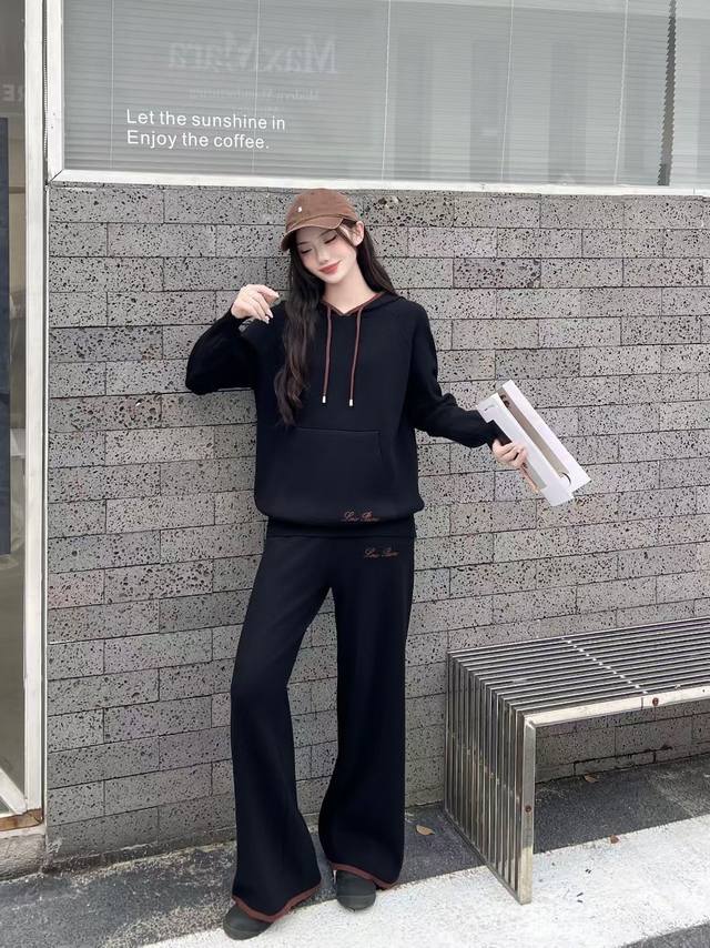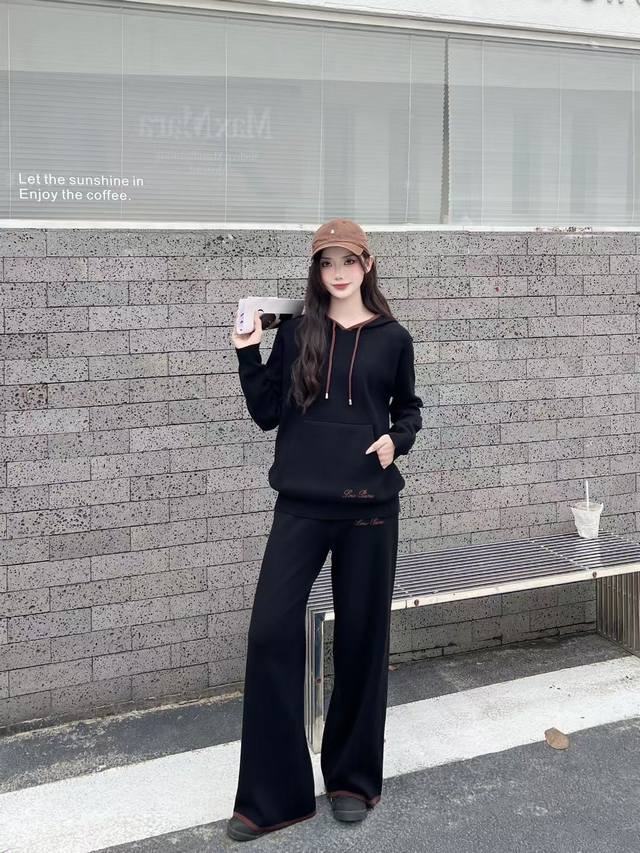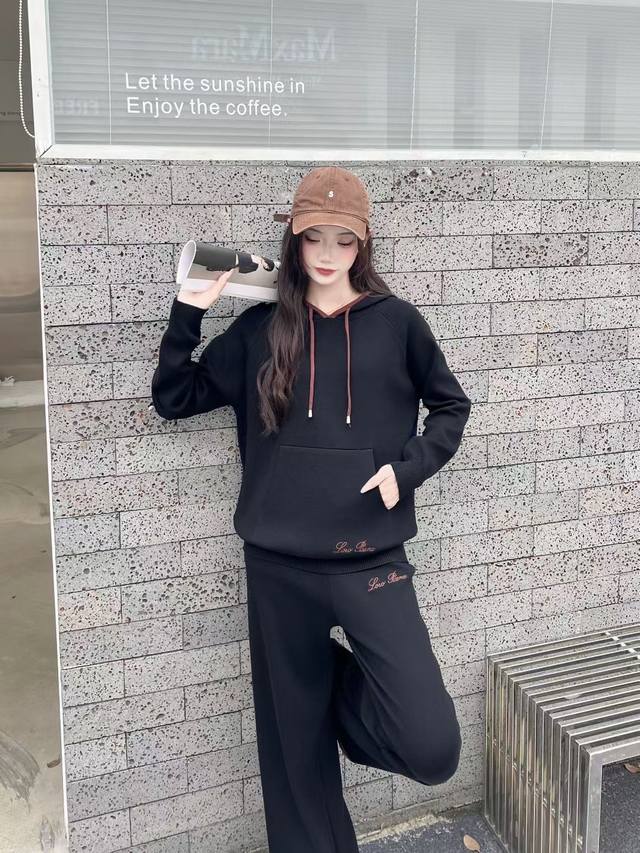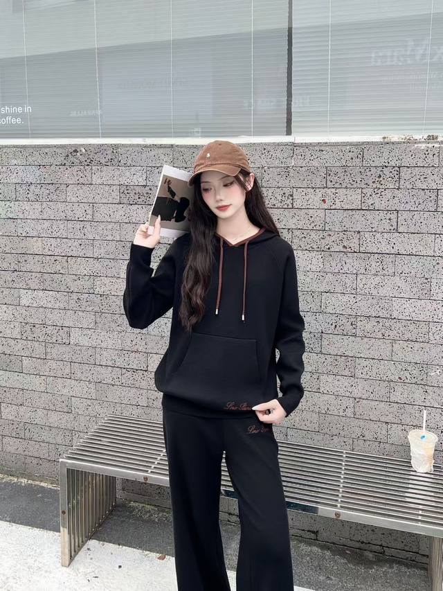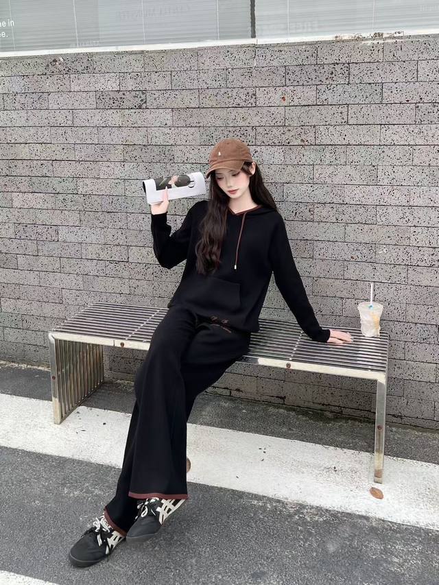 New embroidered badge and letter logo long-sleeved contrasting color edge hooded sweater knitted trousers suit two-piece set. Smlxl