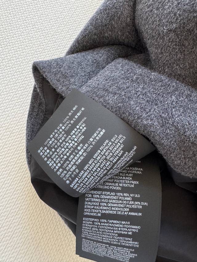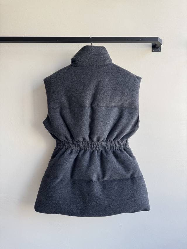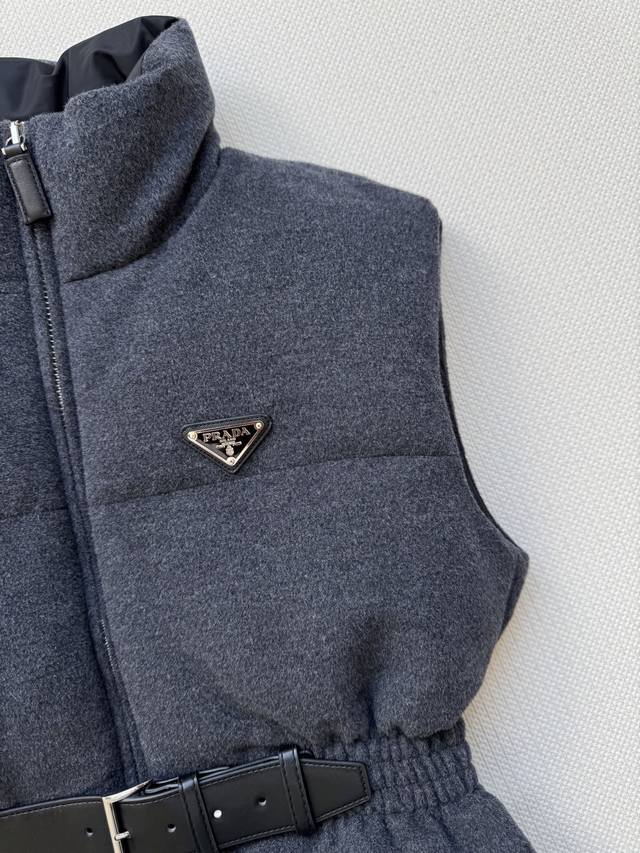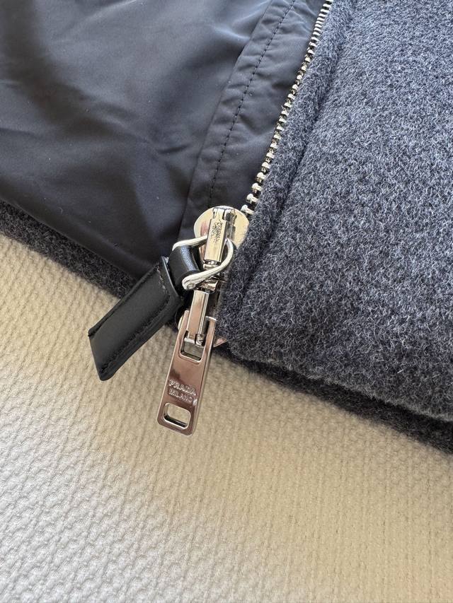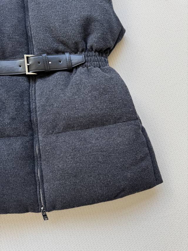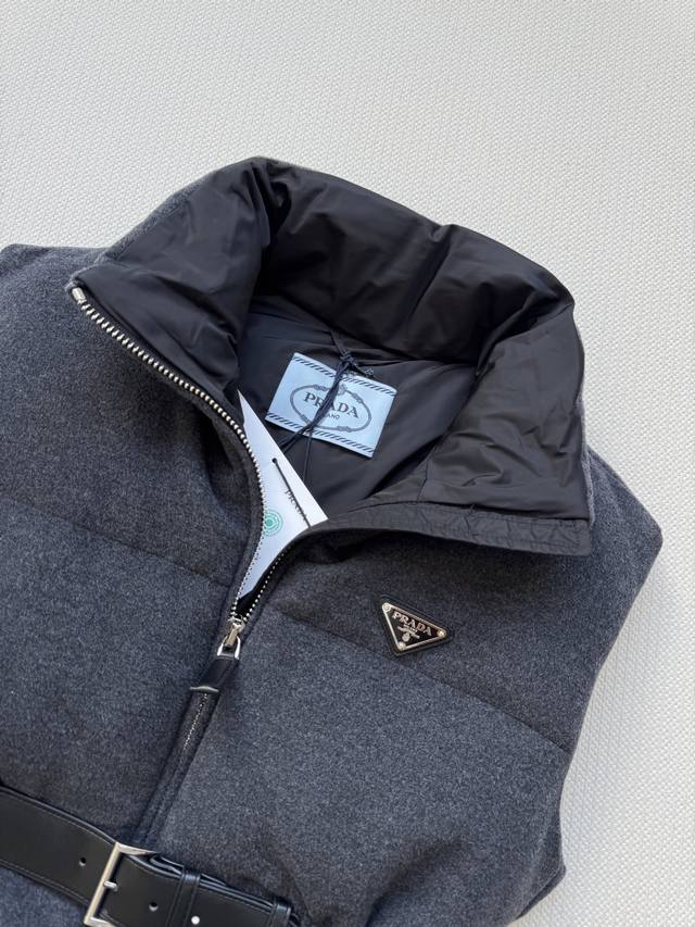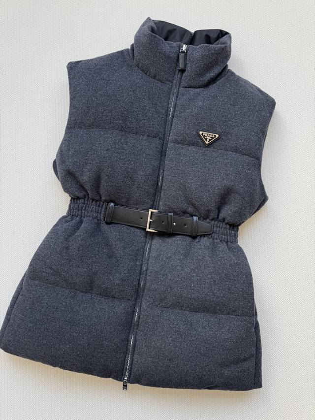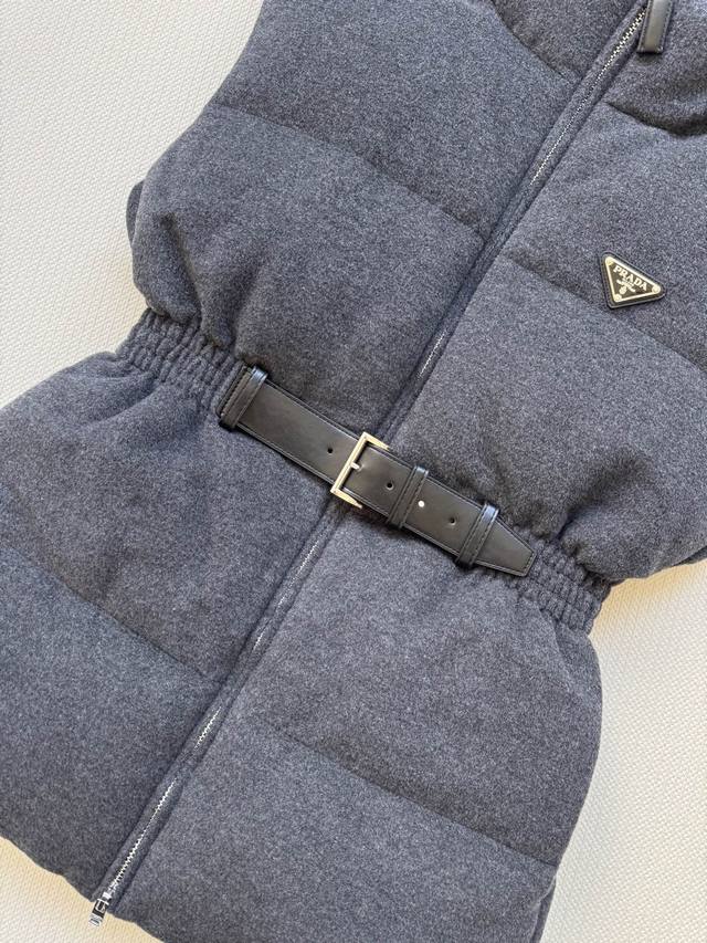 duck down lining, stand-up collar and cuffs with elastic, zipper and button closures, zippered welt pockets, elastic drawstring hem, and enameled metal triangle logo. This jacket is perfect for slimming down your waist and can be styled any way you want. SML.