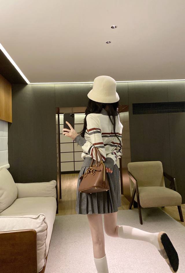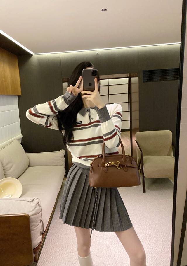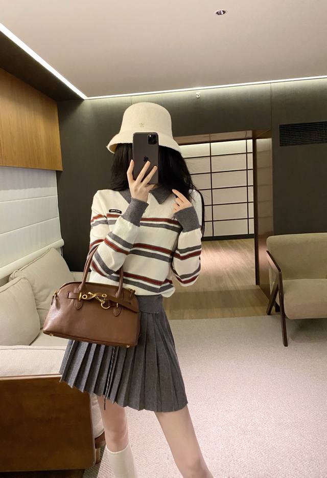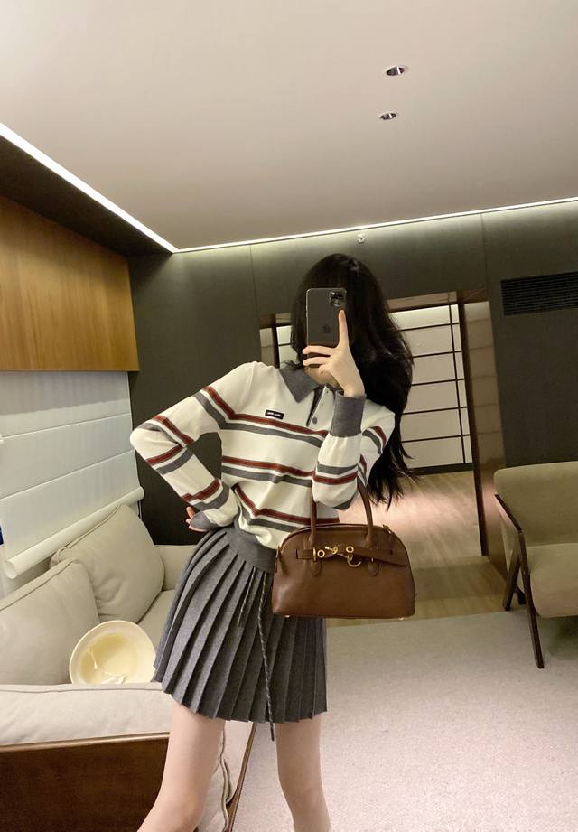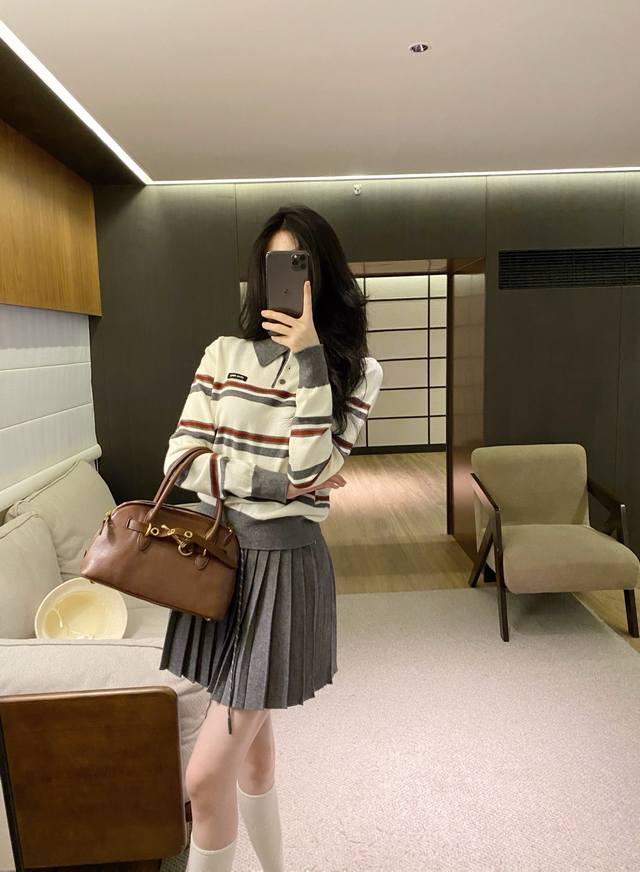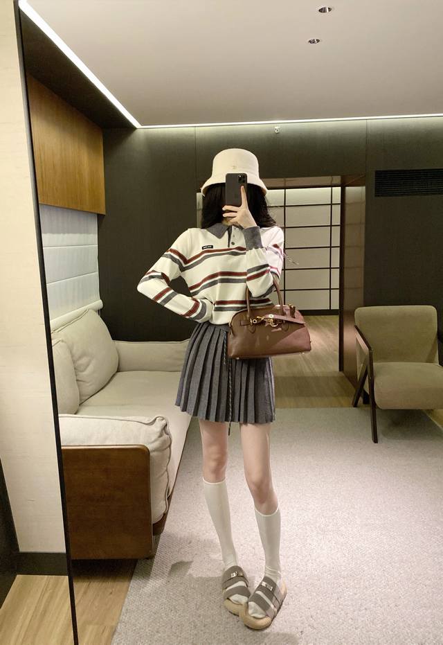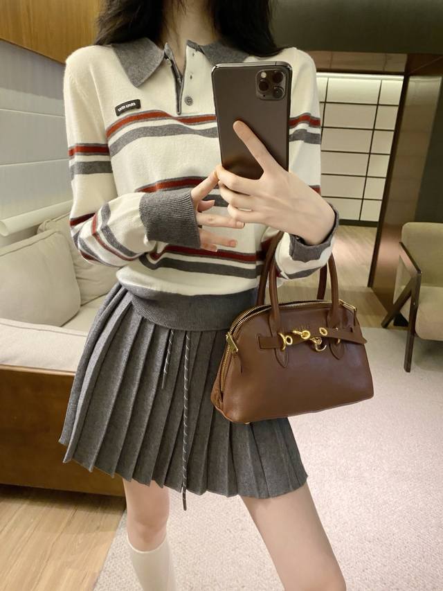 suit Miumi* age-reducing splicing contrast color striped knitted sweater pleated skirt suit. Sml