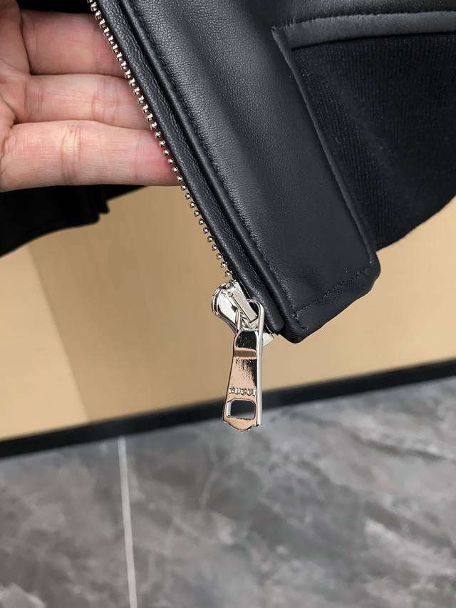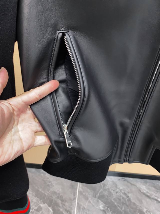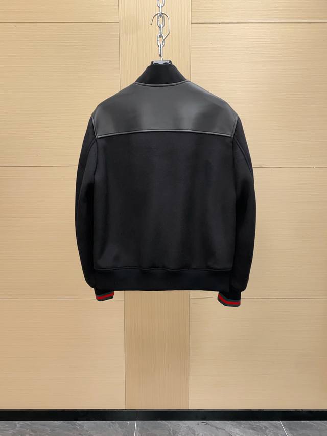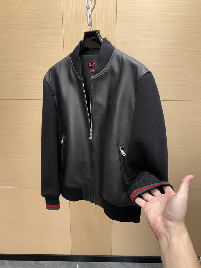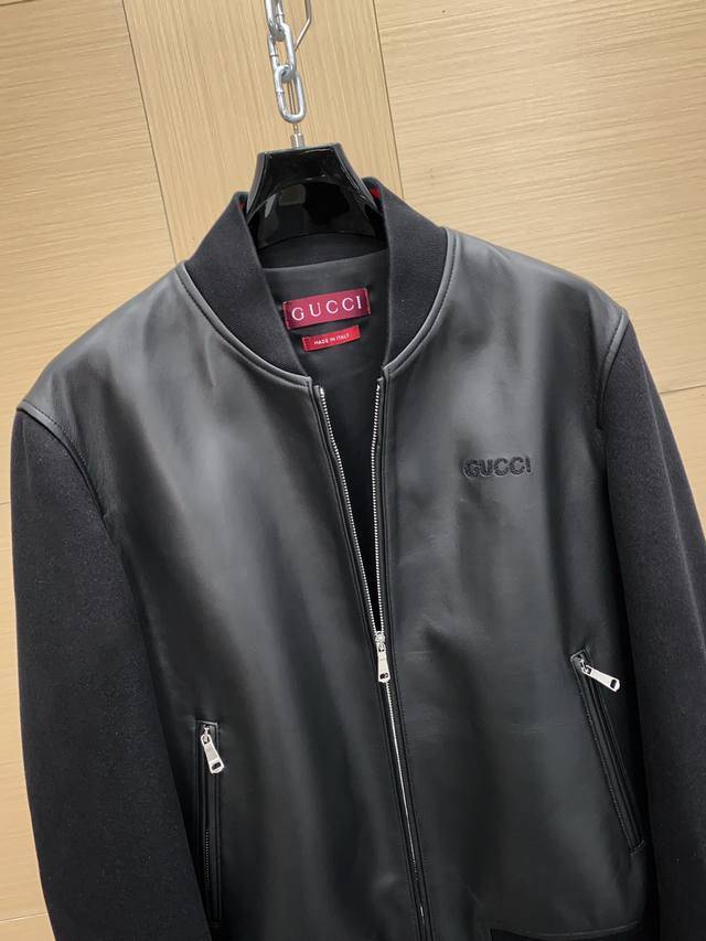 100% Genuine Leather. Gucci Nappa Leather Bomber Jacket. Soft Nappa leather + wool-cotton blend knit, combining texture and comfort. The outer layer is made of soft and delicate black Nappa lambskin, with a natural and delicate texture, smooth to the touch, and both crispness and flexibility. The surface has a uniform sheen, showcasing a low-key luxurious feel. The sleeves and back feature a knitted patchwork design using a wool-cotton blend knit fabric with dense and elastic stitching. This enhances breathability and flexibility while maintaining a comfortable wearing experience. The three-dimensional cut is a straight, slim-fit bomber jacket with crisp shoulders and a clean silhouette. The patchwork design seamlessly blends sporty and urban styles. The placket features a smooth and durable metal zipper. The cuffs and hem are ribbed and adorned with classic red and green webbing, highlighting iconic elements. A subtle tonal embroidered Gg logo adorns the left chest, understated yet sophisticated. The inner lining features a smooth knit fabric panel for a comfortable and smooth feel. This adds warmth and durability.