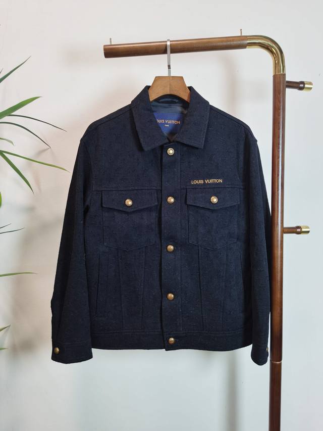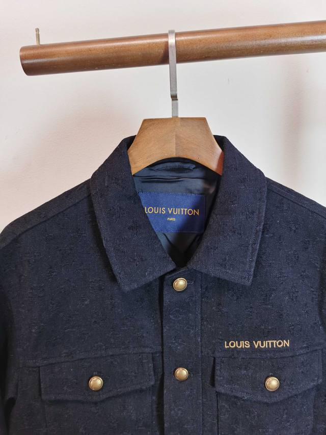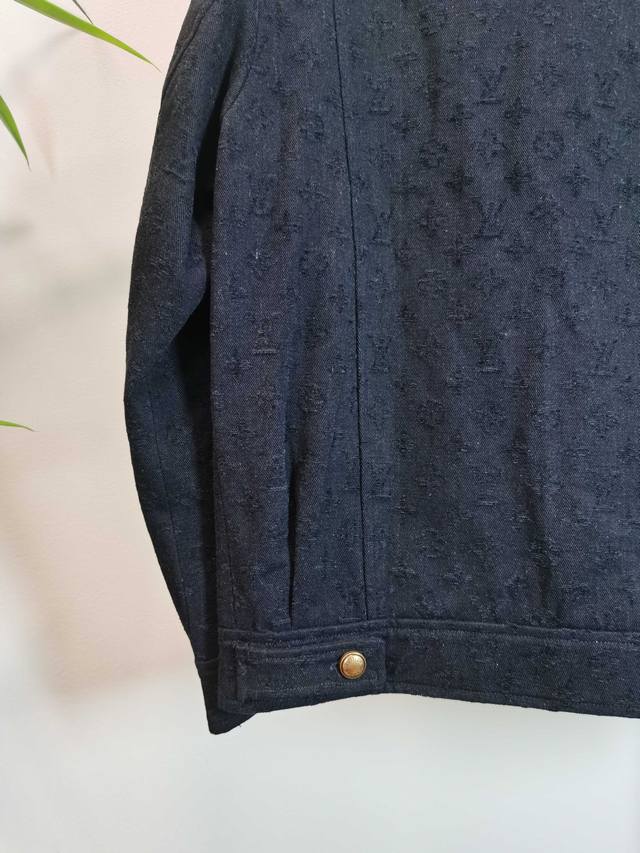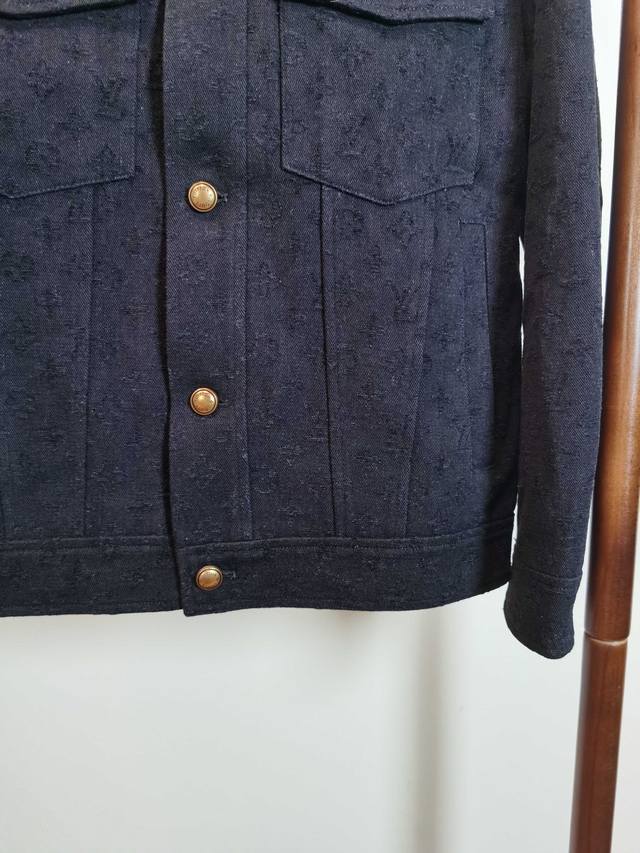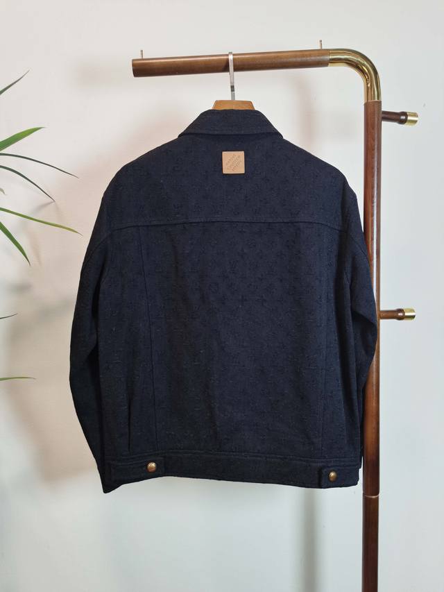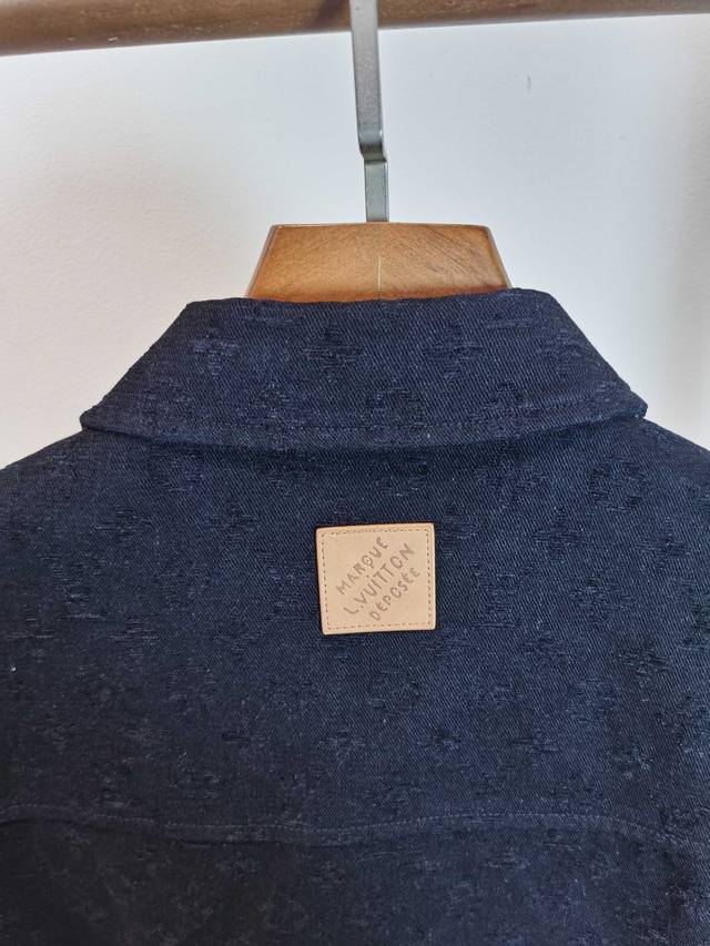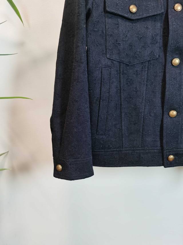 This washed indigo-lined down denim jacket is crafted from a jacquard Monogram Craggy pattern, with scattered colorful elements selected from the textured jacquard fabric. A 1*V pattern adorns the left pocket. The wavy over-the-shoulder design adds a playful touch to this casual yet sophisticated piece.