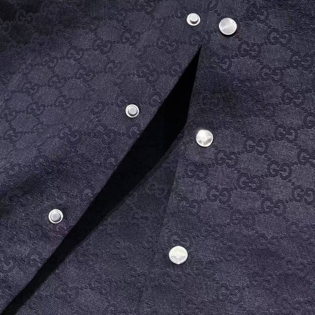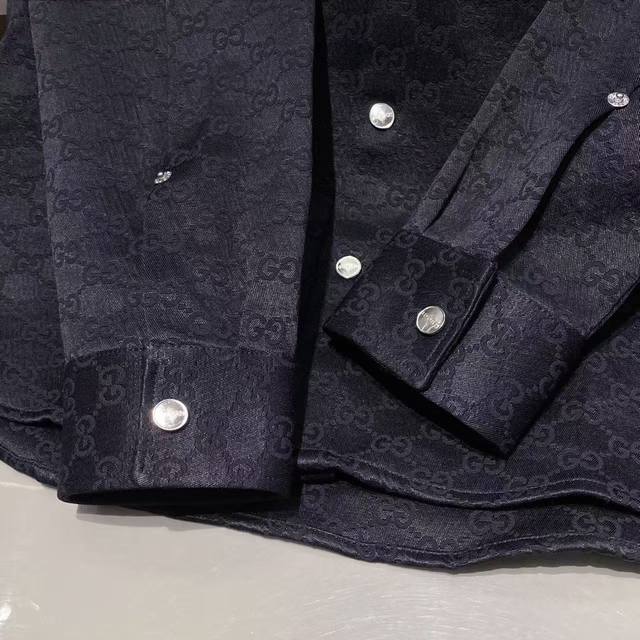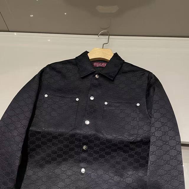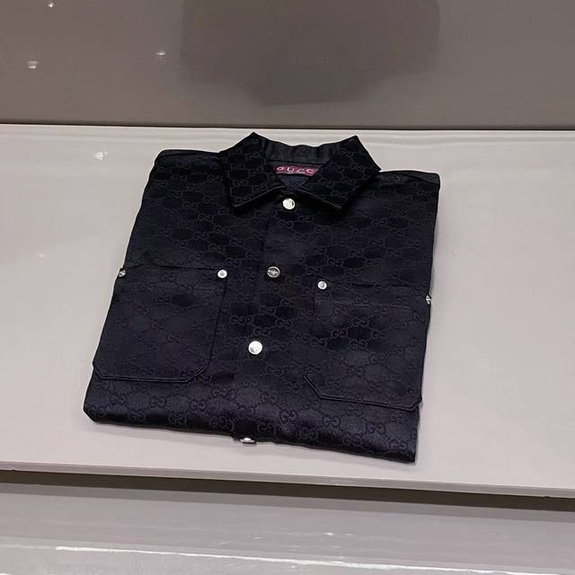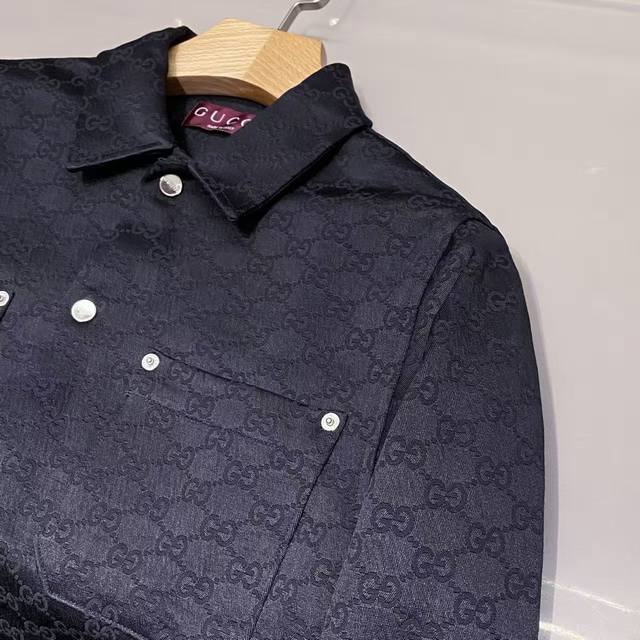 A new men's casual digital print long-sleeved jacket shirt from the Gucci family, sourced from Hong Kong import channels. An exclusive new product for Autumn/Winter 2025, a classic celebrity-level item, perfect for advertising campaigns and promotional campaigns. A shirt that combines style and quality! The overall design adheres to the Gucci family's aesthetic, continuing the retro-chic trend. It features a super double G pattern, giving the classic Gg pattern, derived from Guccio Gucci's initials, a new charm. The print is seamlessly integrated into the fabric, showcasing a distinctive and fashionable attitude! It also enhances the overall style and understated luxury! A special leather label on the back further highlights the brand's status! Made with custom-supplied Italian fabric, it is extremely comfortable to the touch and boasts unparalleled breathability. All accessories are custom-supplied and meticulously crafted. Each metal button is engraved with the brand's logo, exuding a high-end feel! The impeccable tailoring and perfectly tailored lines accentuate a man's rugged and unrestrained masculinity. A must-have for men who embrace a free spirit, this piece effortlessly creates a stylish look with every styling choice.