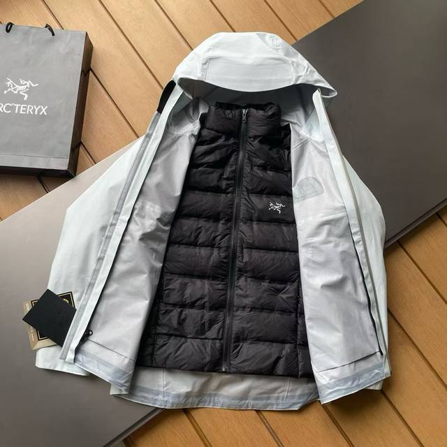 Arcteryx Alpha Bt Outdoor 3-in-1 Down Jacket with Two-Way Zipper and 90% Down Filler. This is Arc'Teryx's signature 3-in-1 down jacket, perfect for all seasons and great value! The inner lining features a logo and is lightweight, outdoor-grade down. The outer layer is an Arc'Teryx Lt hard-shell jacket. Features include a functional zippered design, four-times heat-sealing, 3D biomimetic design, and Tri-Durance waterproof and rainproof fabric. Highly recommended to purchase this jacket, as it comes with original specifications, original packaging, original labels, and all accessories. Features include two-way zippers under the armpits, custom-made hardware, hang tags, and instructions. This simple and versatile design provides the performance required for high-altitude environments. Made with Bluesign certified N40 Lgore-Tex fabric with a warp-knitted backing, this lightweight yet durable, windproof, waterproof, and breathable jacket is suitable for a variety of activities. The
