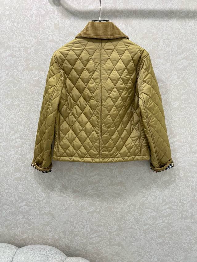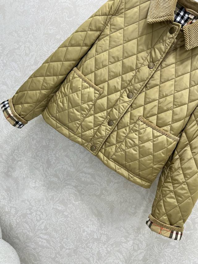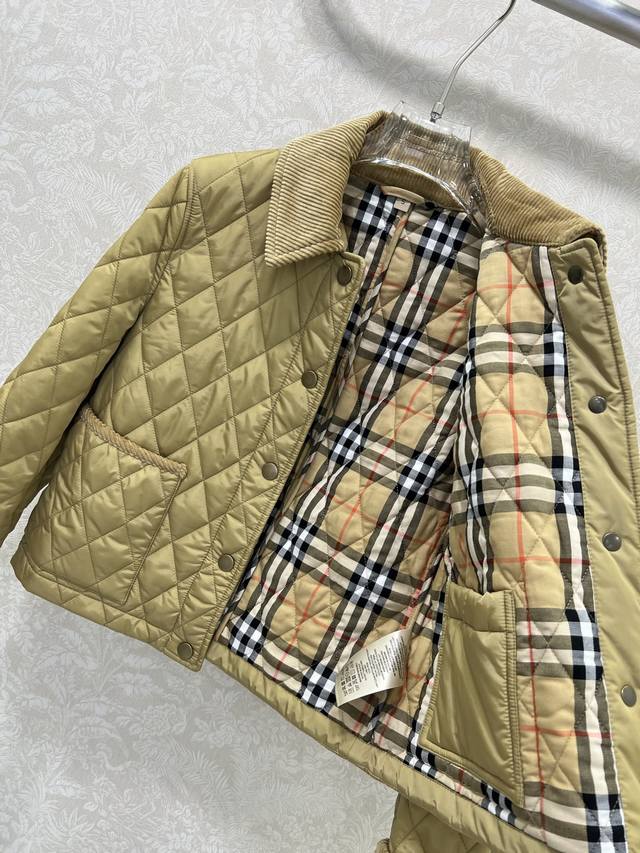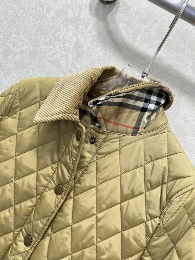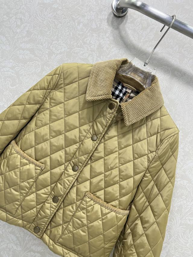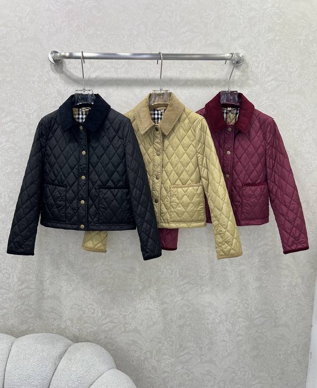 Burber Y25 New Arrival Diamond Pattern Short Cotton Coat! Super High-End Corduroy Collar Cotton Coat with Corduroy Trim at the Cuffs (roll-up edges revealing the lining), Classic Vintage Check Single-Breasted Design, Classic Style, Plain Check Cotton Coat, Short Jacket, Recycled Polyester Check Pattern, Large Pockets, Classic Designer Feel, High-Quality! 3 Colors, 5 Sizes: S, M, L, XXL,