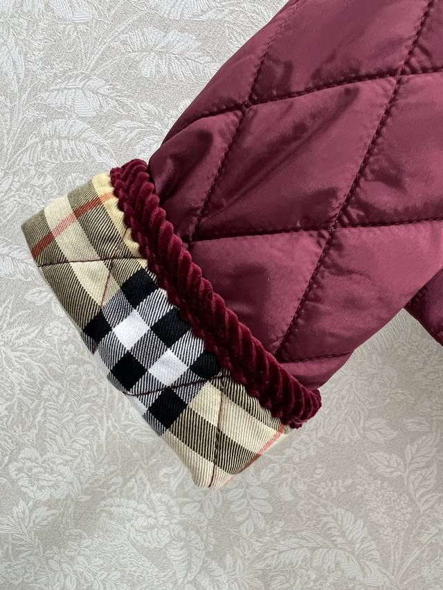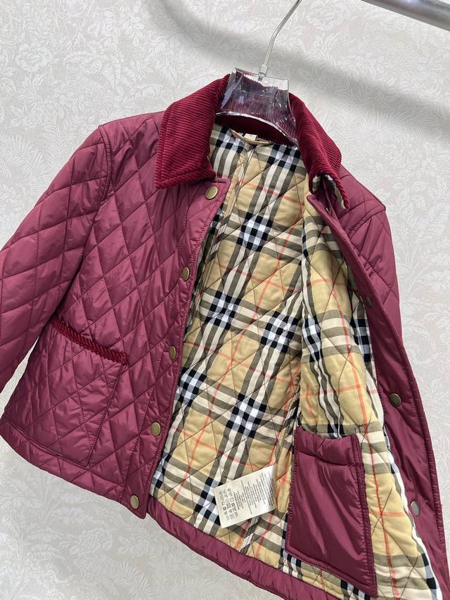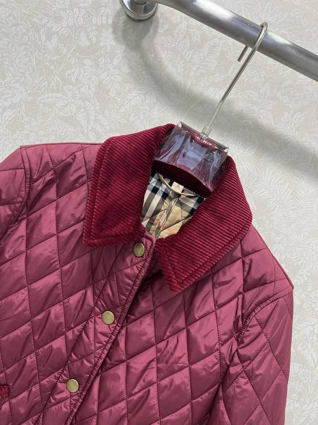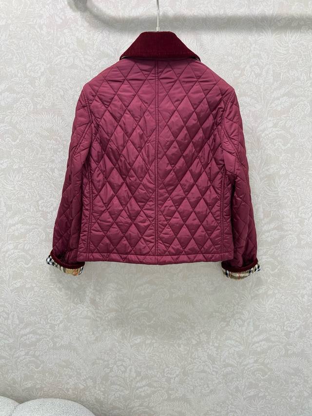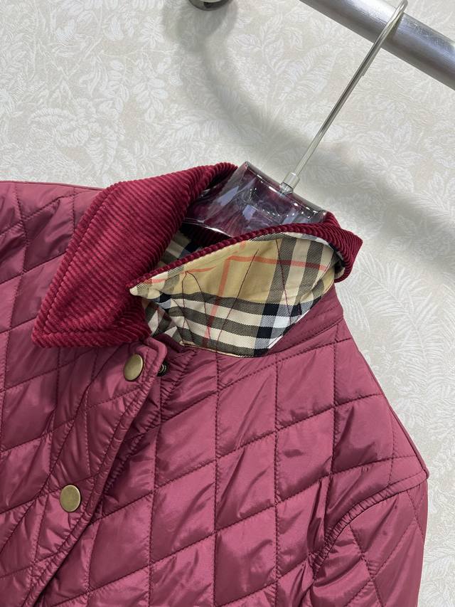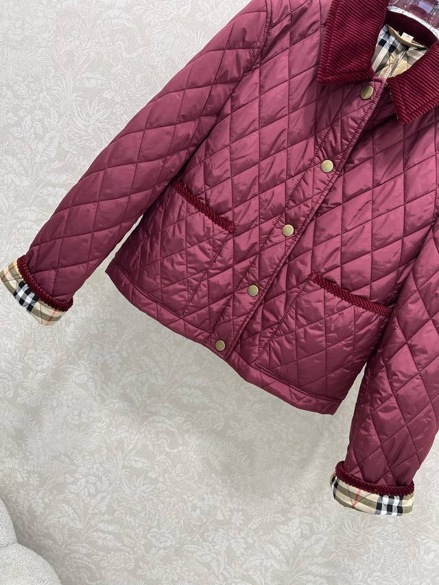 Burber Y25 New Arrival Diamond Pattern Short Cotton Coat! Super High-End Corduroy Collar Cotton Coat with Corduroy Tie Trim at the Cuffs (rollable to reveal the lining), Classic Vintage Check Single-Breasted Design, Classic Style, Plain Check Cotton Coat, Short Jacket, Recycled Polyester Check Pattern, Large Pockets, Classic Designer Feel, High Quality! 3 Colors, 5 Sizes: S, M, L, XXL,