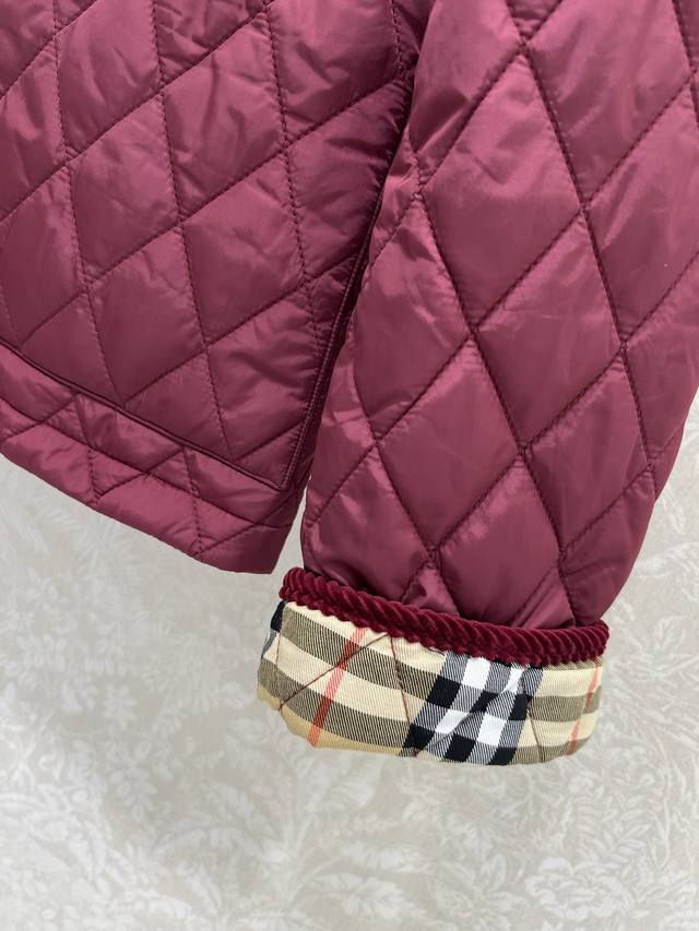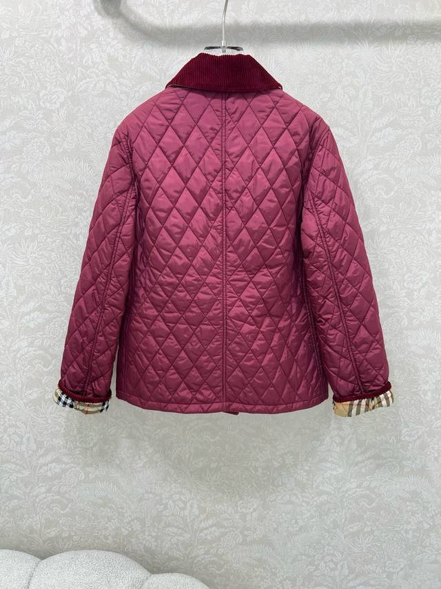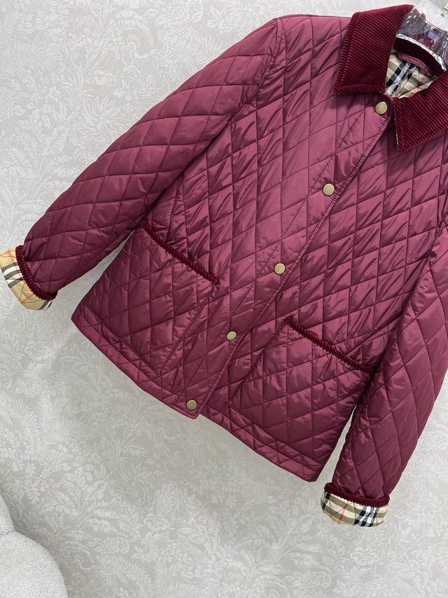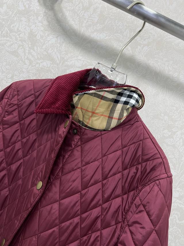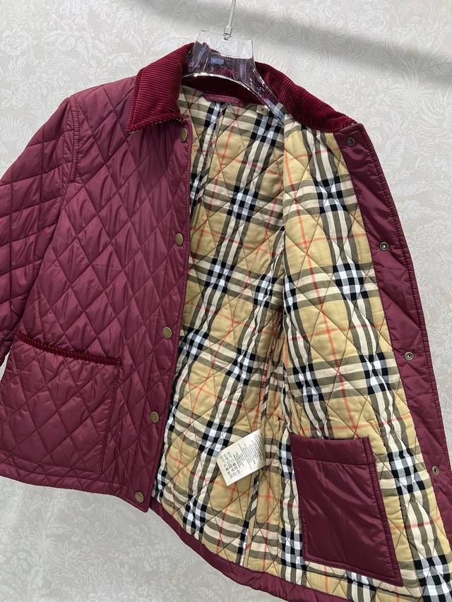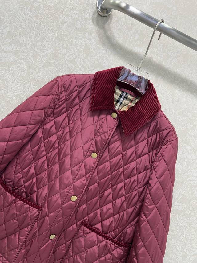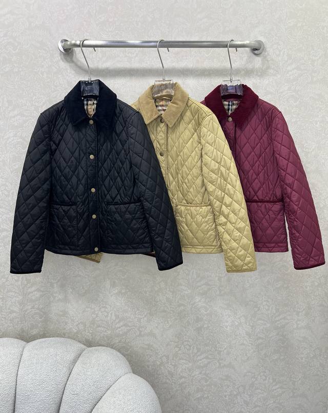 Burber Y25 New Diamond Pattern Mid-Length Cotton Coat! Super High-End Corduroy Collar Cotton Coat with Corduroy Tie Trim at the Cuffs (rollable to reveal the lining), Classic Vintage Check Single-Breasted Design, Classic Style, Plain Check Cotton Coat, Short Jacket, Recycled Polyester Check, Large Pockets, Classic Designer Feel, High Quality! 3 Colors, 5 Sizes: S, M, L, XXL,