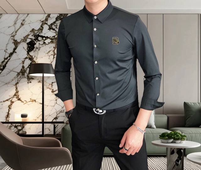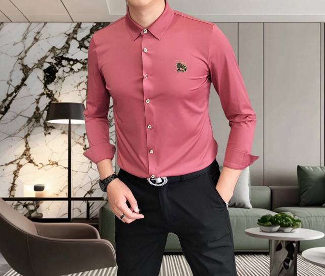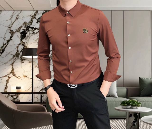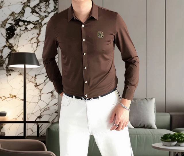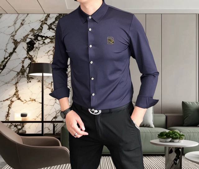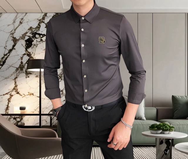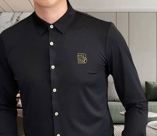 Burberry** 2025 New Men's Casual Long-Sleeve Shirt, Officially Released. Simple, Stylish, Versatile, High-End Quality. Seamless Cut Edges. Custom-designed Logo Print on Chest. Imported nylon-spandex-tencel cotton fabric, highly elastic and wrinkle-resistant. Custom hardware accessories. Comfortable and breathable. High-quality and textured. Simple, elegant, and stylish. Casual and handsome, showcasing a high-end style. Sizes: M-4XL. Maximum size: approximately 195 lbs. Please provide height and weight when ordering. Ships the next day.