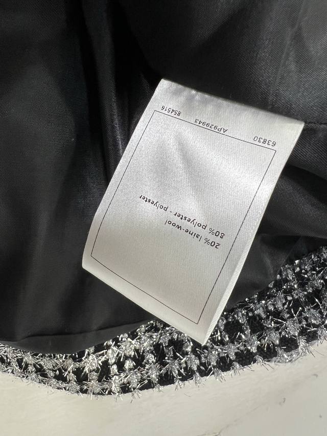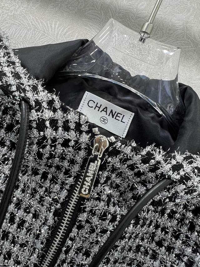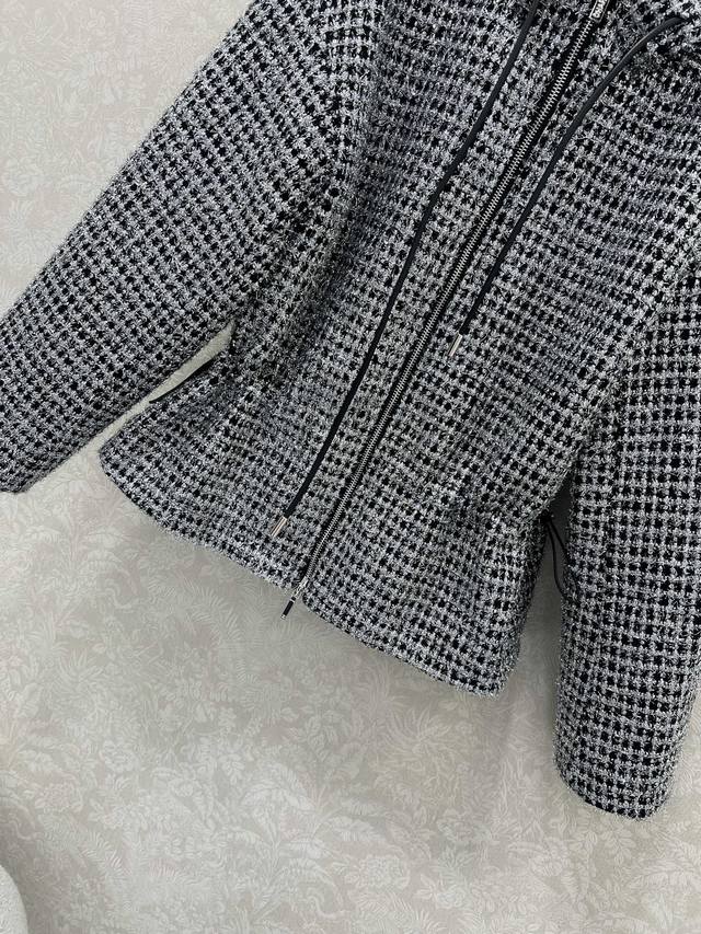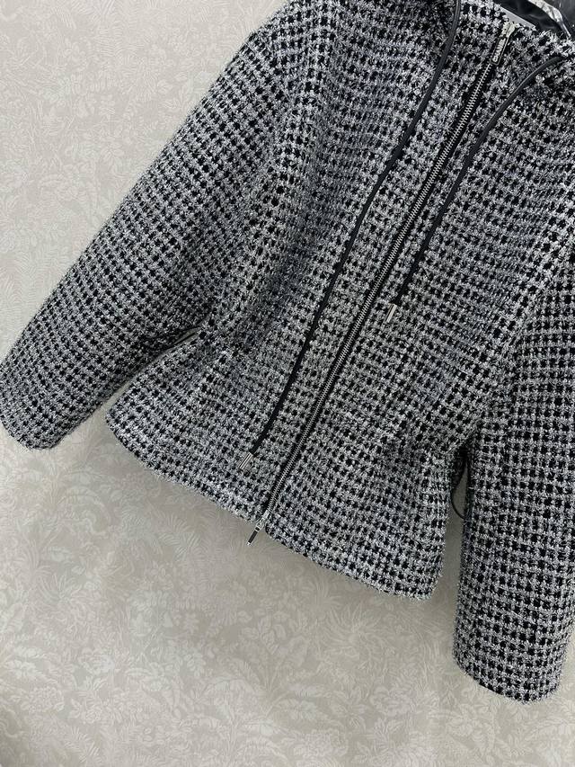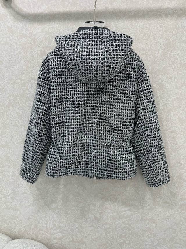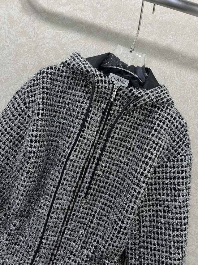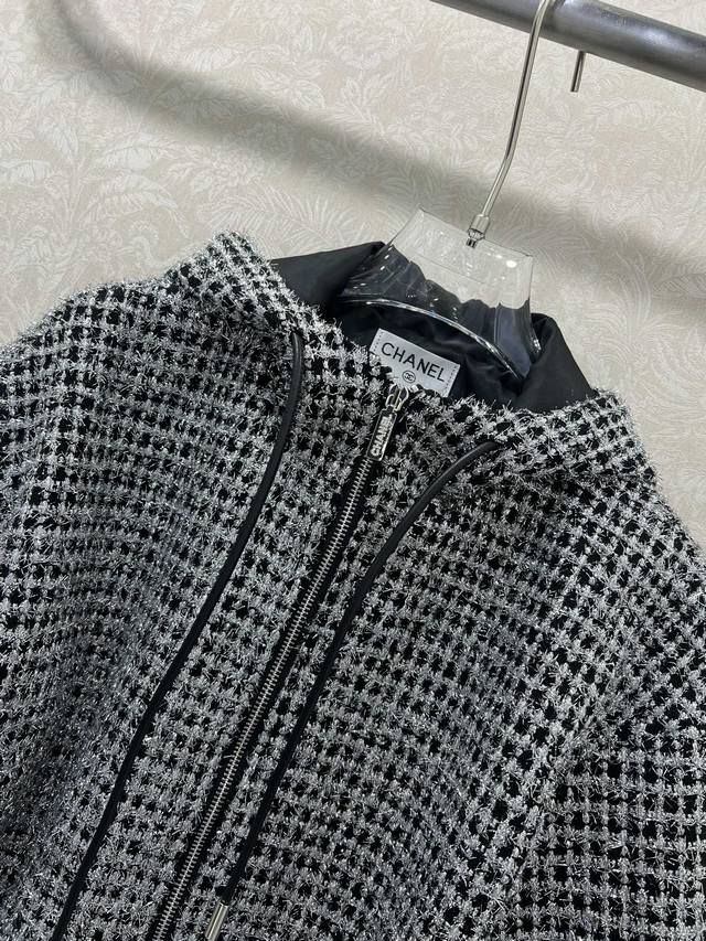 Chan*L25 New Hooded Drawstring Waist Jacket Made of Imported Coarse Wool Fabric. The drawstring waist design exudes a high-end feel and flatters the figure, making you look slim and elegant. Custom double-C hardware throughout, with silver thread woven texture to brighten the details, instantly creating a sophisticated and elegant look. The snowflake black and silver color scheme is noble, textured, and exudes a gentle and sensual feel, making it the perfect choice for formal occasions. Single color, sizes S, M, L, D, D