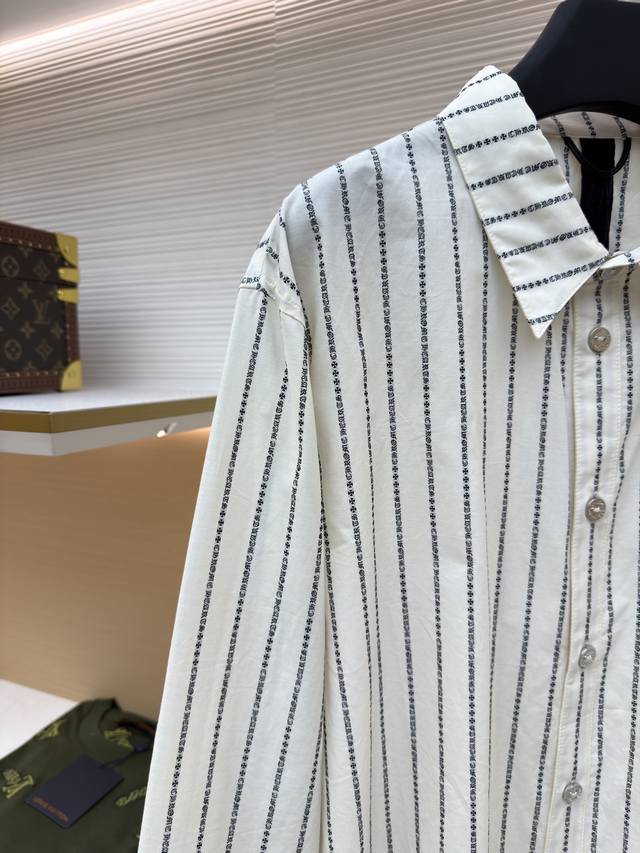 Chrome Hearts Sanskrit All-over Print Yarn-dyed Shirt Item No.: 1680866-B60 Fabric: Shirt Fabric Craftsmanship: Printing Fit: Loose Fit Weight: Approx. 265g Size: S, M, L Description: Made with 100-count double-ply yarn. Minimum order quantity 1000 meters, woven on a large-scale jacquard machine. Features professional shirt factory ironing, including ironed cuffs, custom-molded 14mm glazed black, silver buttons, custom black label with white print, custom 2.2